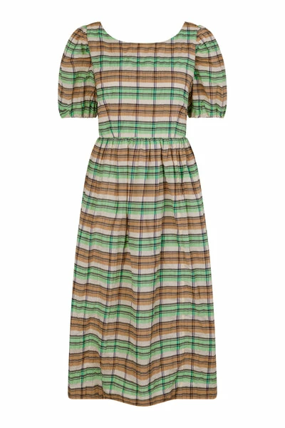 The lovely checked Albertine dress from Second Female is a gorgeous choice for summer. The pull on style has an open back with a lovely tie back detail, short puff sleeves and a mid length skirt in tones of green, black, cream and tan. An elasticated panel at the back of the waistband ensures a great fit. A great style to pair simply with a leather jacket and trainers for day wear that will dress up easily with a wedge or sandal for a more dressy occasion. Pull on Tie detail across the back Mid length full skirt Short puff sleeves with elasticated cuff 60% Cotton 33% Polyester 7% Nylon Machine washable at 30 degrees 114cm shoulder to hem (S) 45cm chest (S) 55888