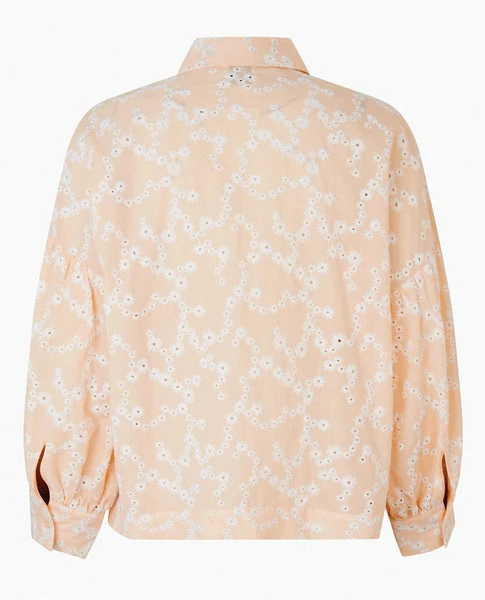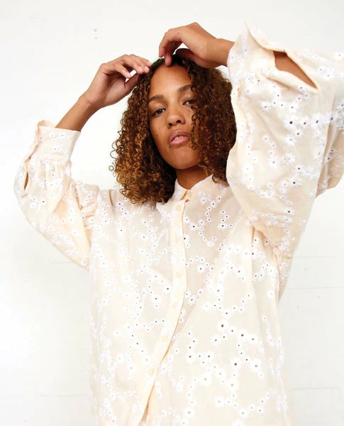 Second Female Aloysalnna Shirt, a neutral loose fitting shirt with long sleeves. Delicate white floral embroidery with button fastening down centre front. 100% Cotton Machine wash at 30 XS – UK8, S – UK10, M – UK12, L – UK14 Size down if between sizes as Second Female sizes generously