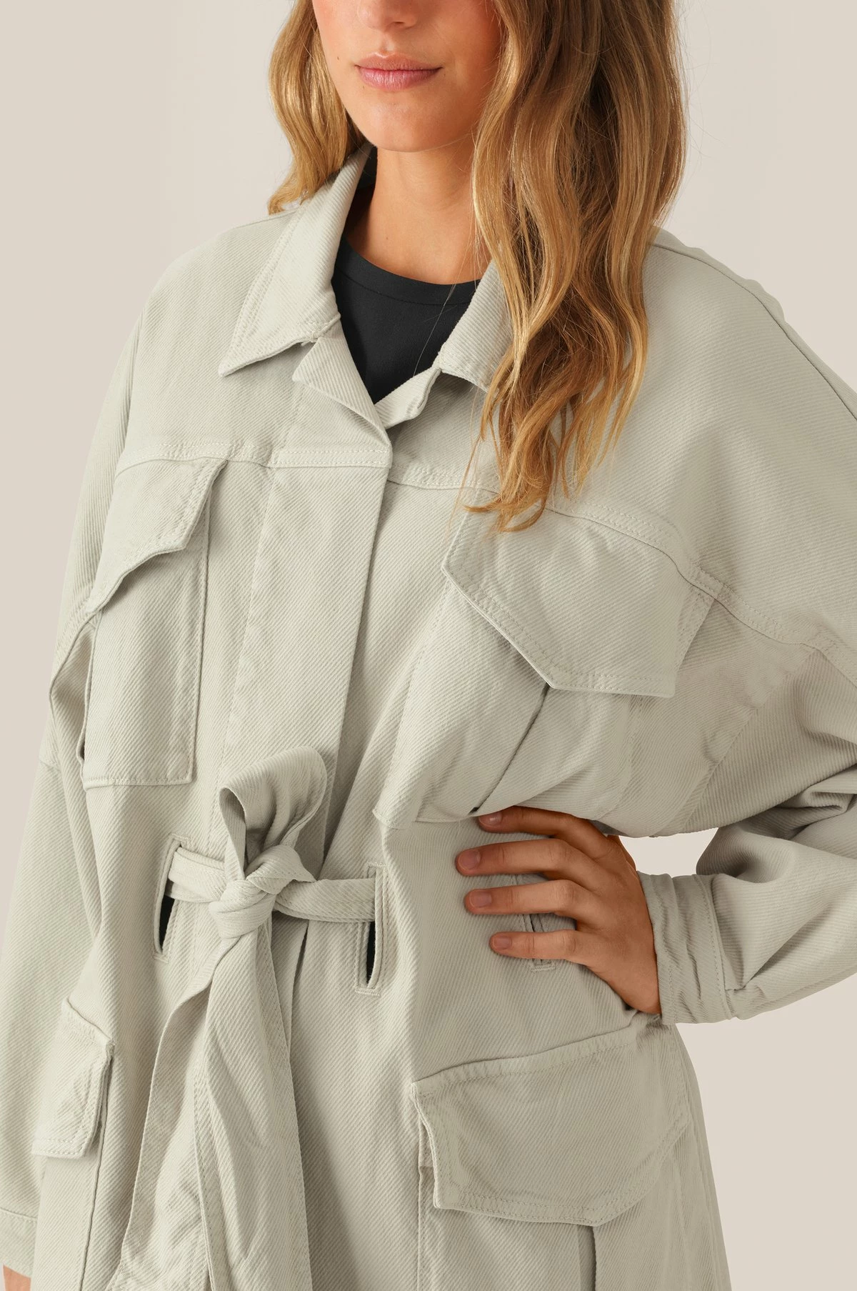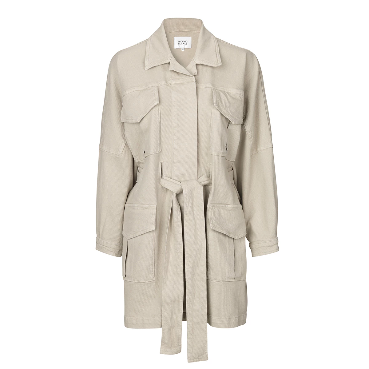Brand: Second Female Colour: Sand Material: 98% Cotton, 2% Elasthane • Safari inspired cotton and elastane fabric jacket • Pockets on the front • Standard fit with adjustable tie-belt Care: Wash – 40°C (Normal Process) Wash inside out with similar colours