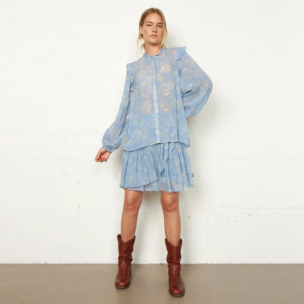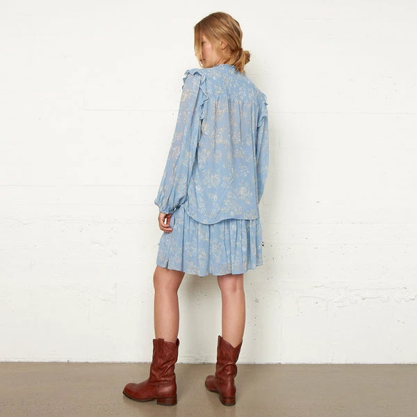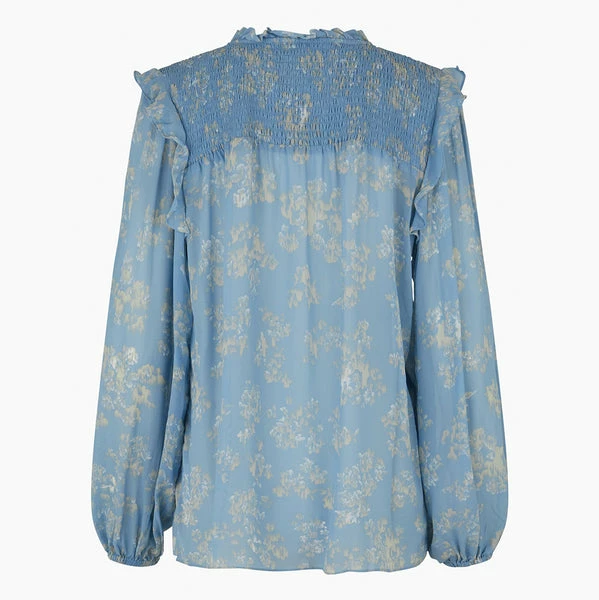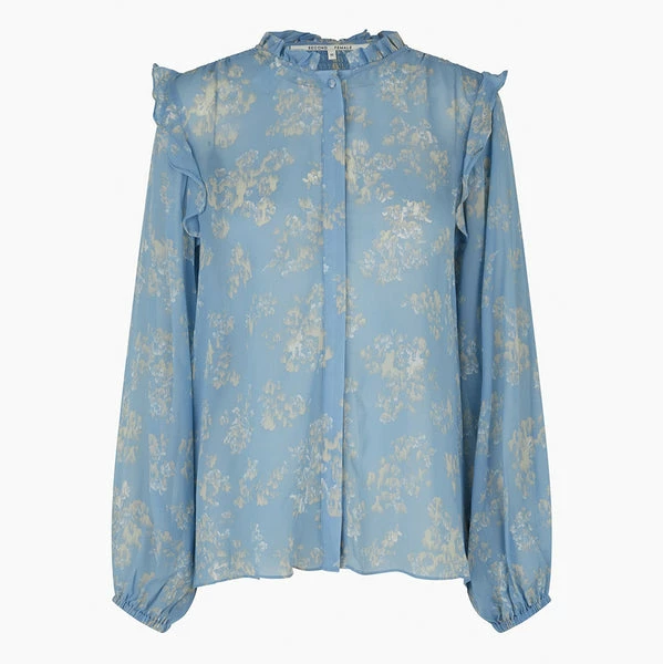 Crafted from a pretty, blue floral print fabric, this delightful blouse from women’s fashion brand Second Female features a round neck, smock details, ruffles on the neck and shoulders, placket and button closure on the centre front, long sleeves with elasticated cuffs, and a loose fit. Perfect for adding a hint of soft, romantic style to your everyday wardrobe. Ashley Blue Aster Shirt from Second Female. Made from 100% Viscose. Hand wash. Do not bleach. Do not tumble dry. Iron on low. Dryclean – Any Solvent Except Trichloroethylene. Iron into shape when damp. Shrinkage up to 5%. Season: Spring / Summer 2022.