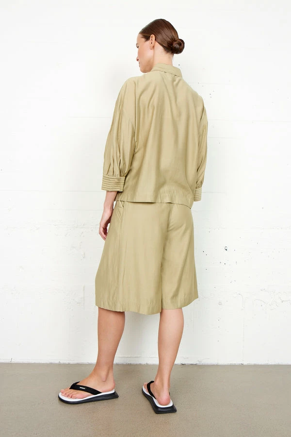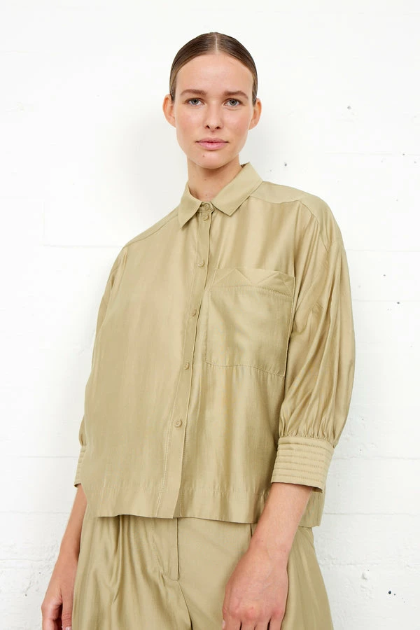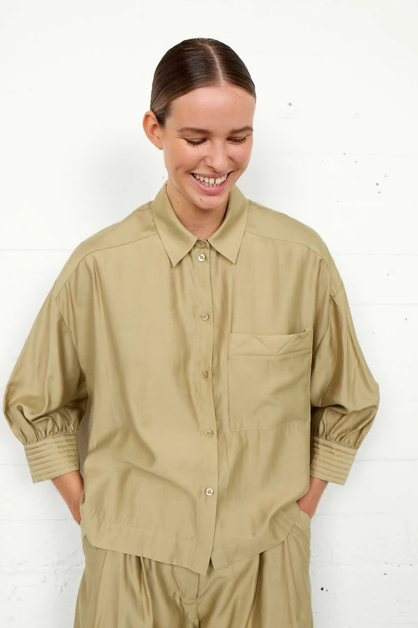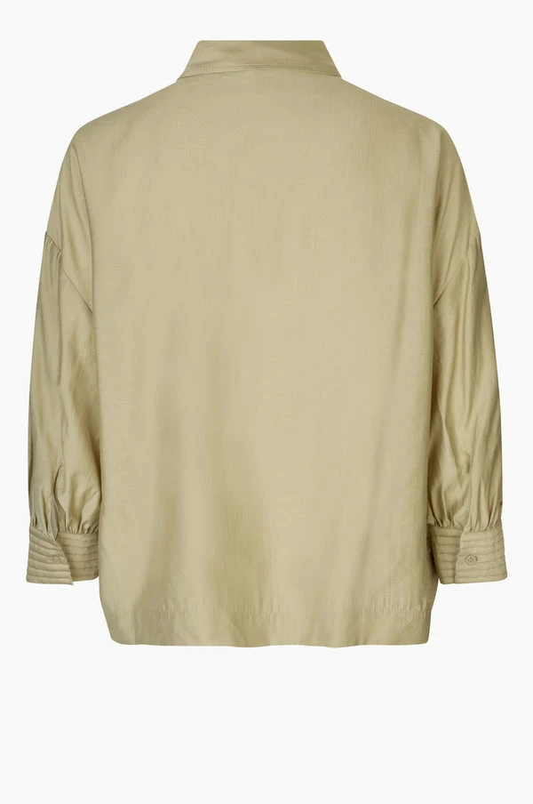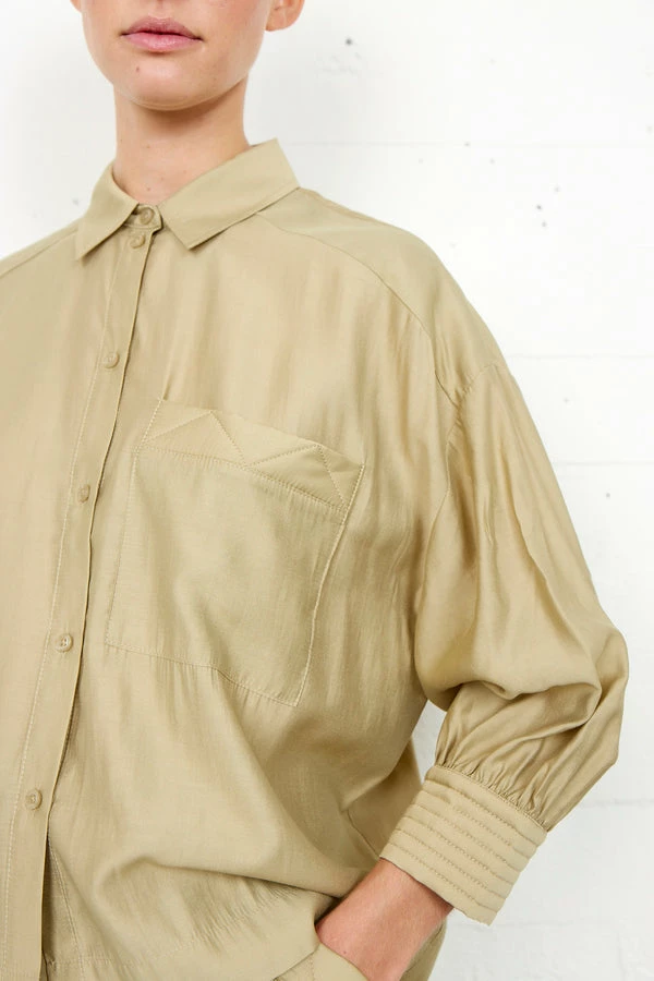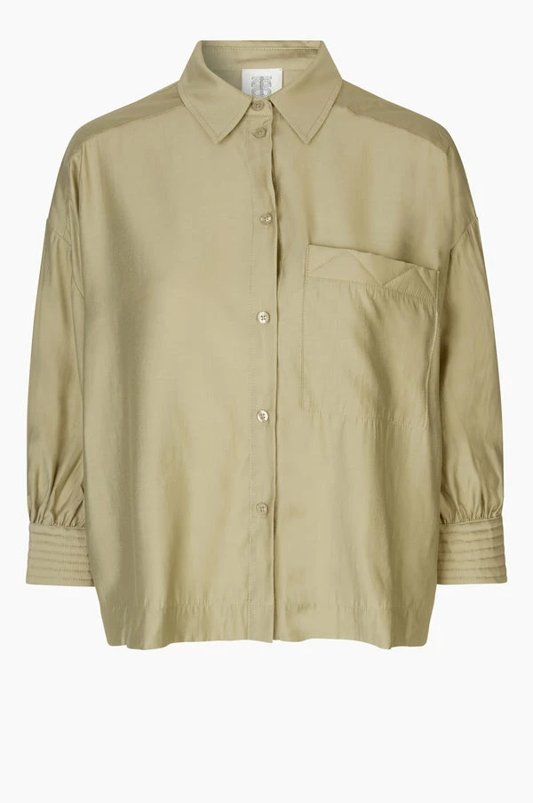 Second female long sleeved shirt with stitching detail. Made in a viscose blend that has a lovely drapy quality. Featuring a button-through fastening, cropped sleeves with stitching detail around the cuff band, and chest pocket with zig-zag stitching. Wide boxy fit. Drapy viscose blend. Stitching details. Wide, boxy fit. Composition: 90% viscose, 10% polyester.