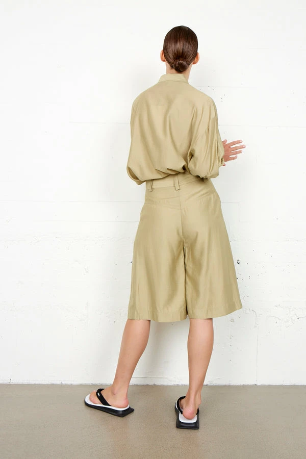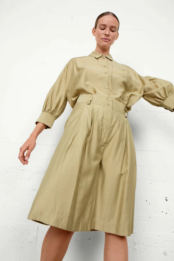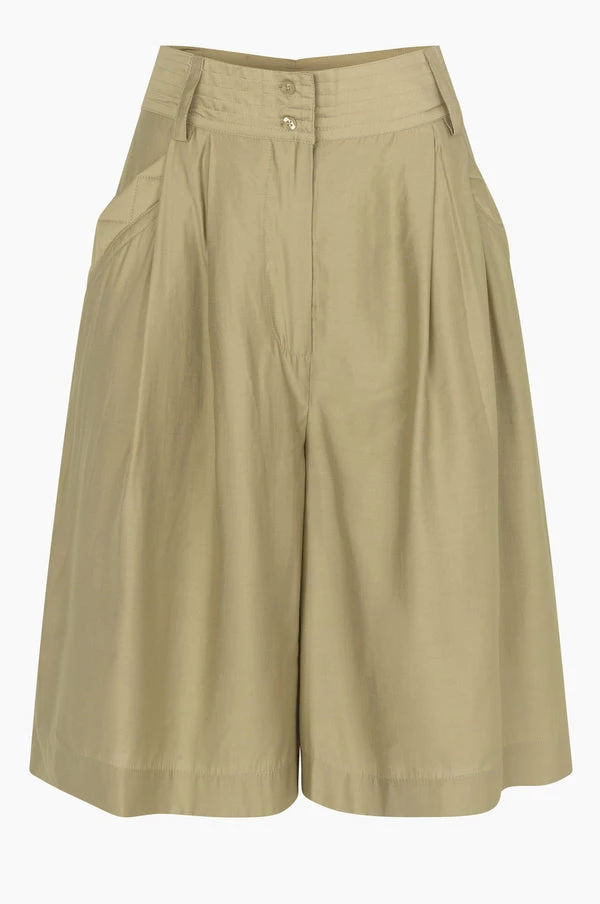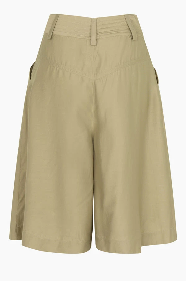 Second female culotte shorts with stitching detail. Made in a viscose-blend that has a lovely drapy quality. Featuring a button and concealed zip fastening, stitching detail around waistband and zig-zag stitching at pockets. High waist and fitted across hips with wide culotte legs. Drapy viscose blend. Stitching details. High waist with culotte leg. Composition: 90% viscose. 10% Polyester. 100% Acetate.