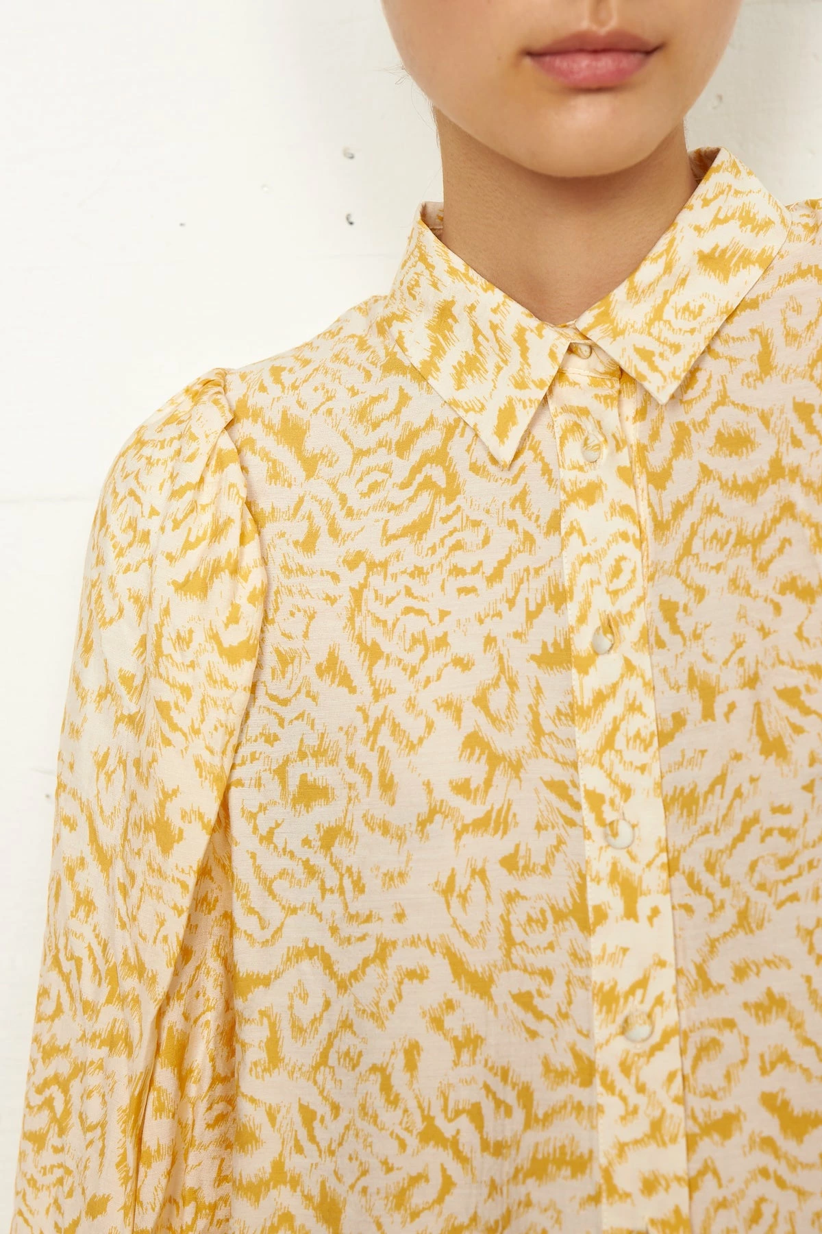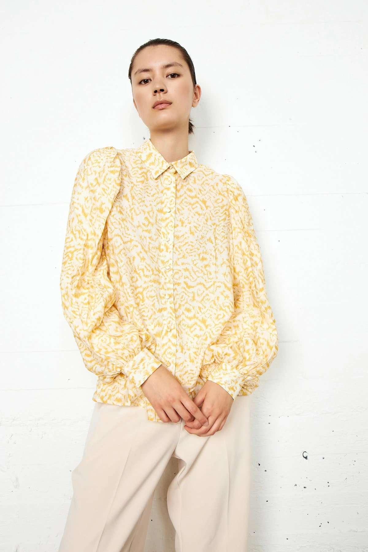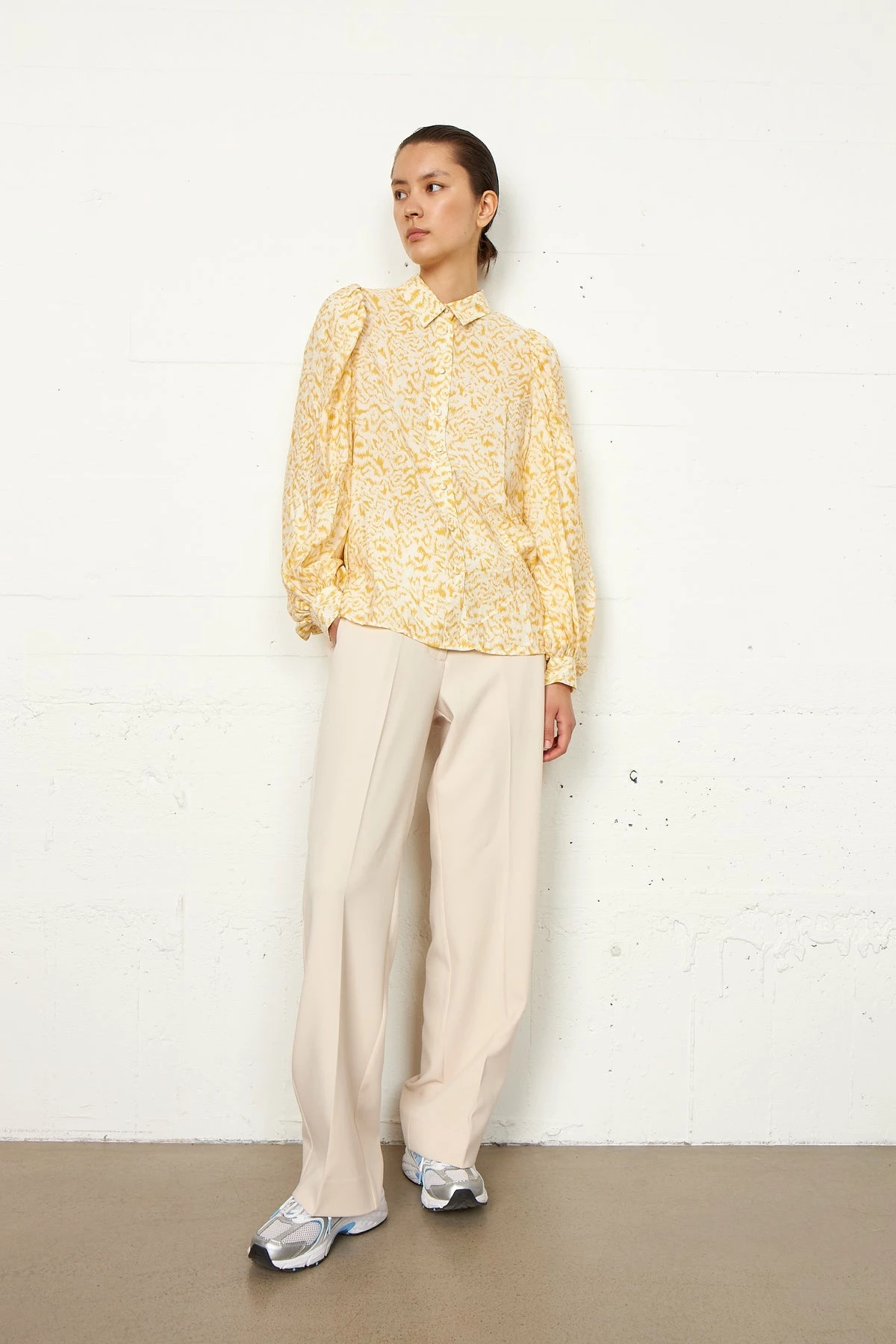 Belladonna Shirt with regular fit. The shirt has shorter, rounded slits in the sides, a classic shirt collar and a placket with visible buttons. The sleeves are long and have gatherings at both shoulder and cuffs. The cuffs can be opened on the backside where there is slit and button closure.