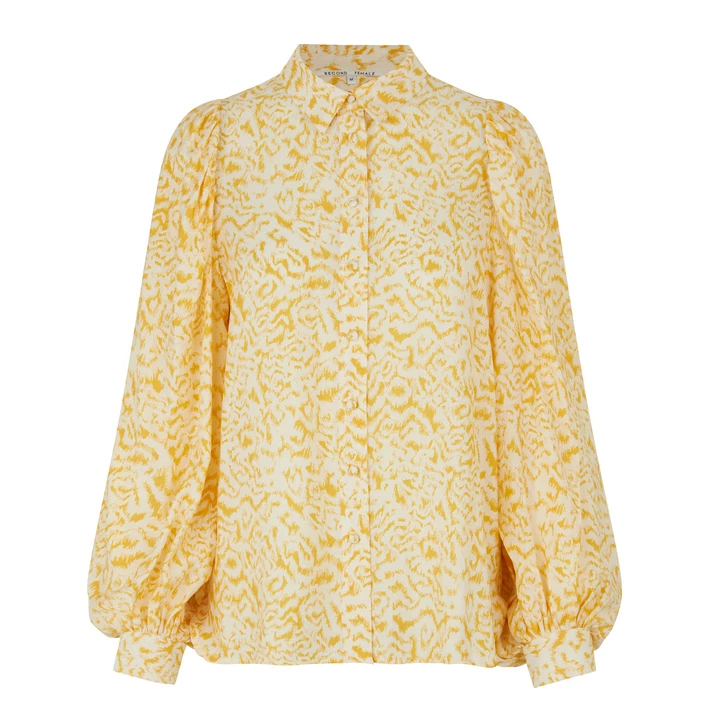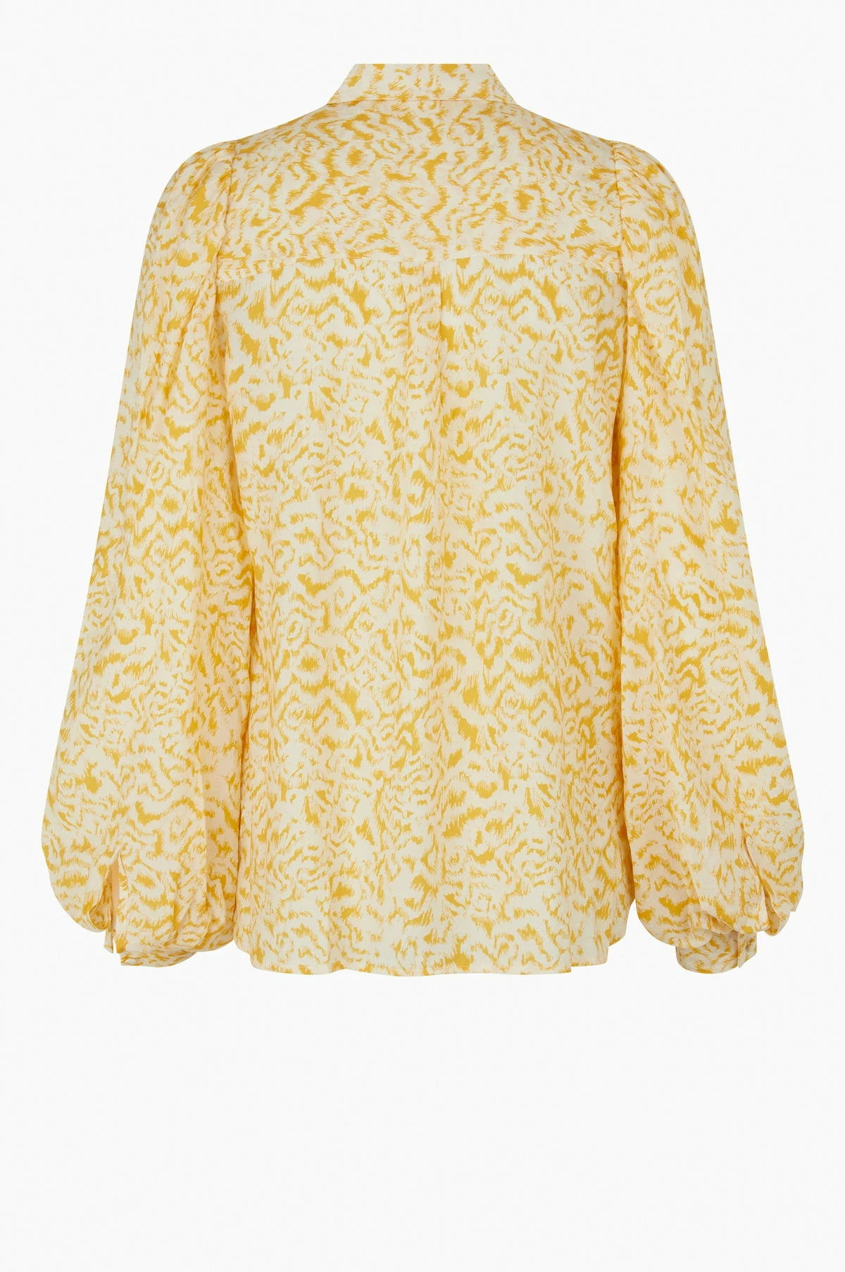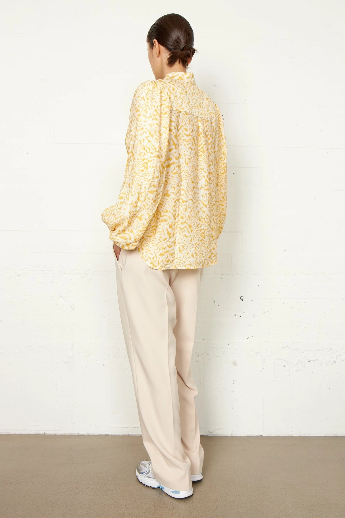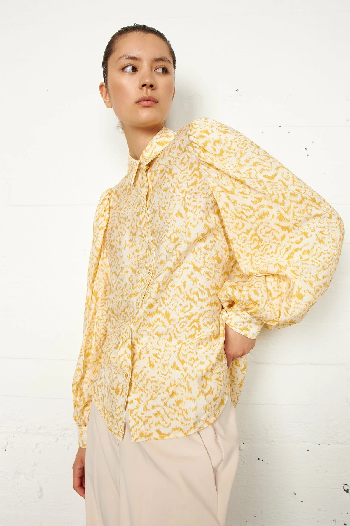 Belladonna Shirt with regular fit. The shirt has shorter, rounded slits in the sides, a classic shirt collar and a placket with visible buttons. The sleeves are long and have gatherings at both shoulder and cuffs. The cuffs can be opened on the backside where there is slit and button closure.