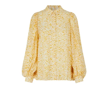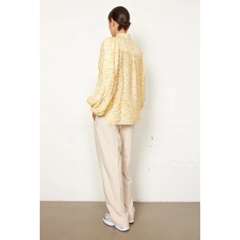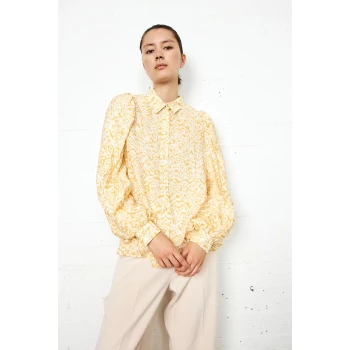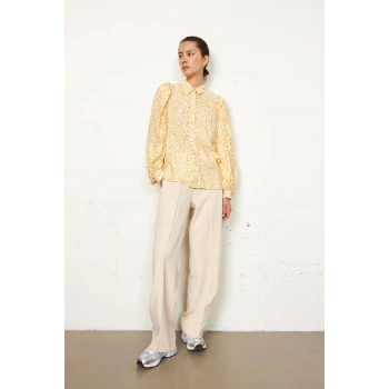 Second Female shirt with regular fit. The shirt has shorter, rounded slits in the sides, a classic shirt collar and a placket with visible buttons. The sleeves are long and have gatherings at both shoulder and cuffs. The cuffs can be opened on the backside where there is slit and button closure.