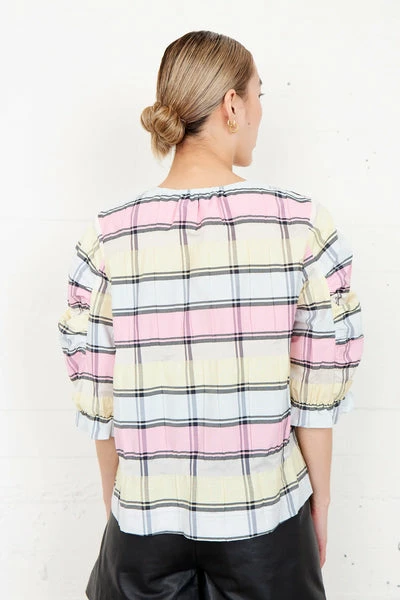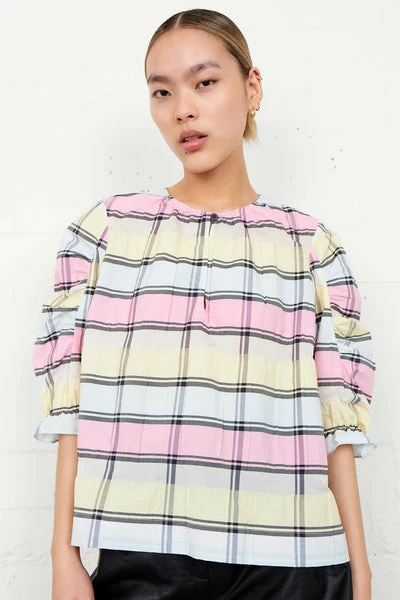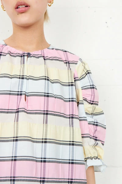 This pretty organic cotton blend checked top from Second Female is a combination of gorgeous ice cream colours with a black contrast line in a seersucker texture with sheer panels. The round neck has a small button fastening and a notch neck while the elbow length sleeves have a ruched panel and small elasticated ruffle cuff. The pull on style has a straight hem that looks gorgeous worn loosely over jeans or shorts but is fine enough to tuck in to a high waisted smart trouser for a more tailored look. Round neck with single button fastening Elbow length sleeves with gathered panels Elasticated cuff with small frill Straight hem 60% Organic cotton 33% Polyester 7% Nylon Machine washable at 30 degrees 53cm centre back (S) Chest 53cm (S) 56006