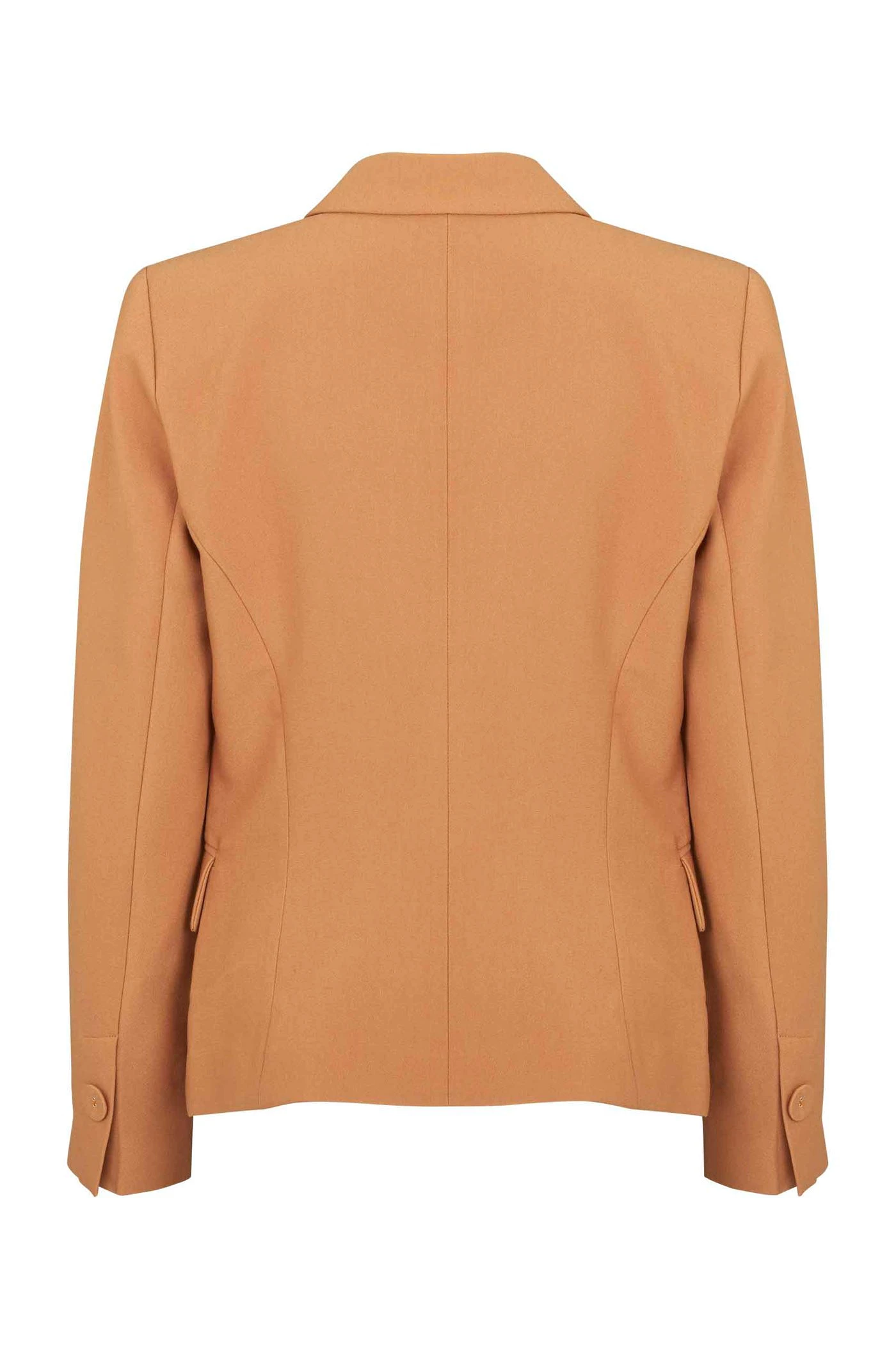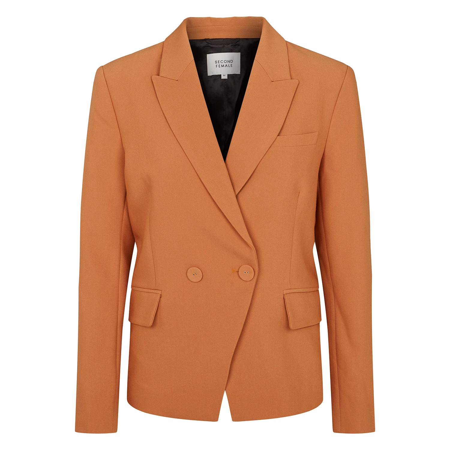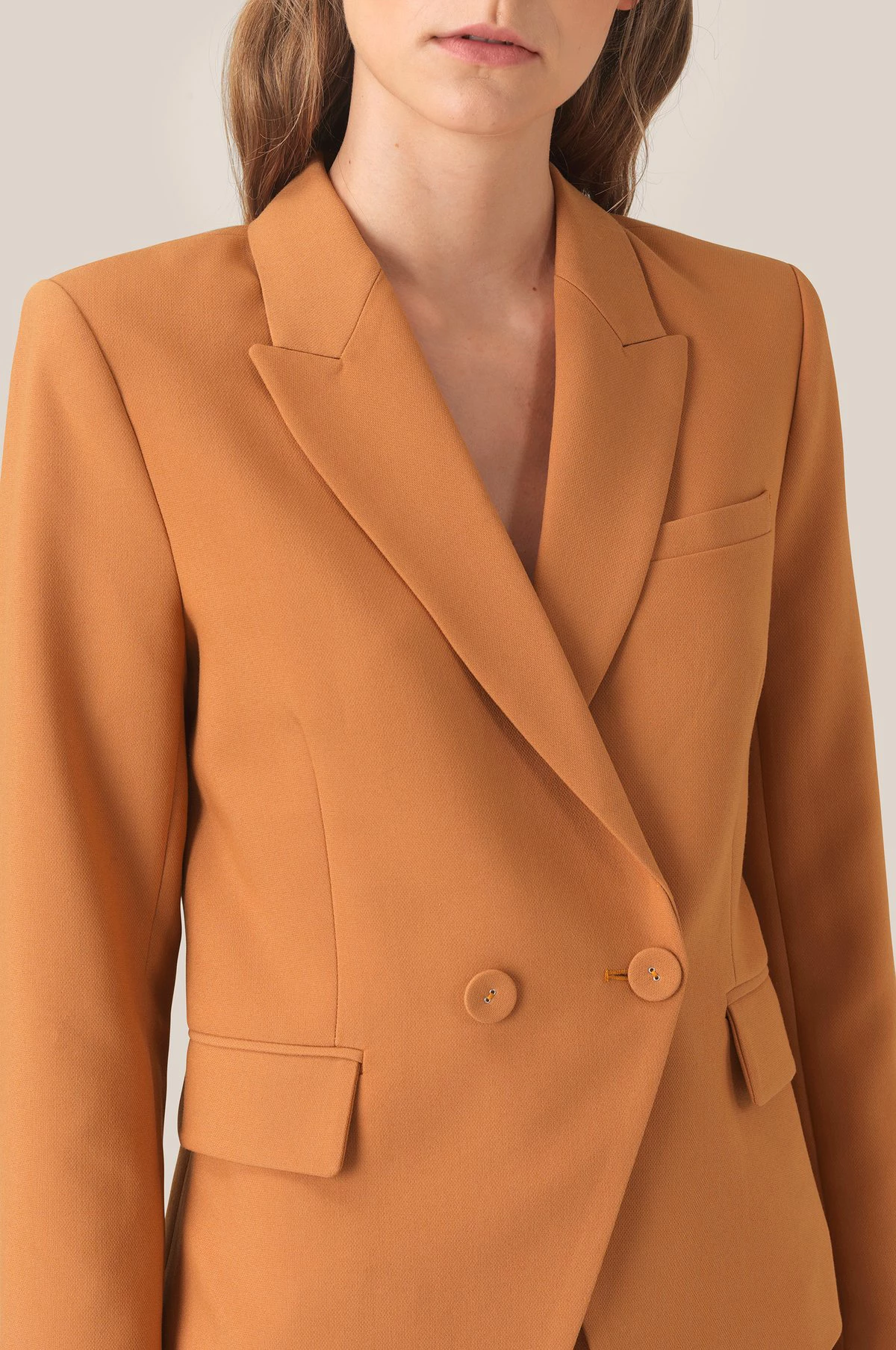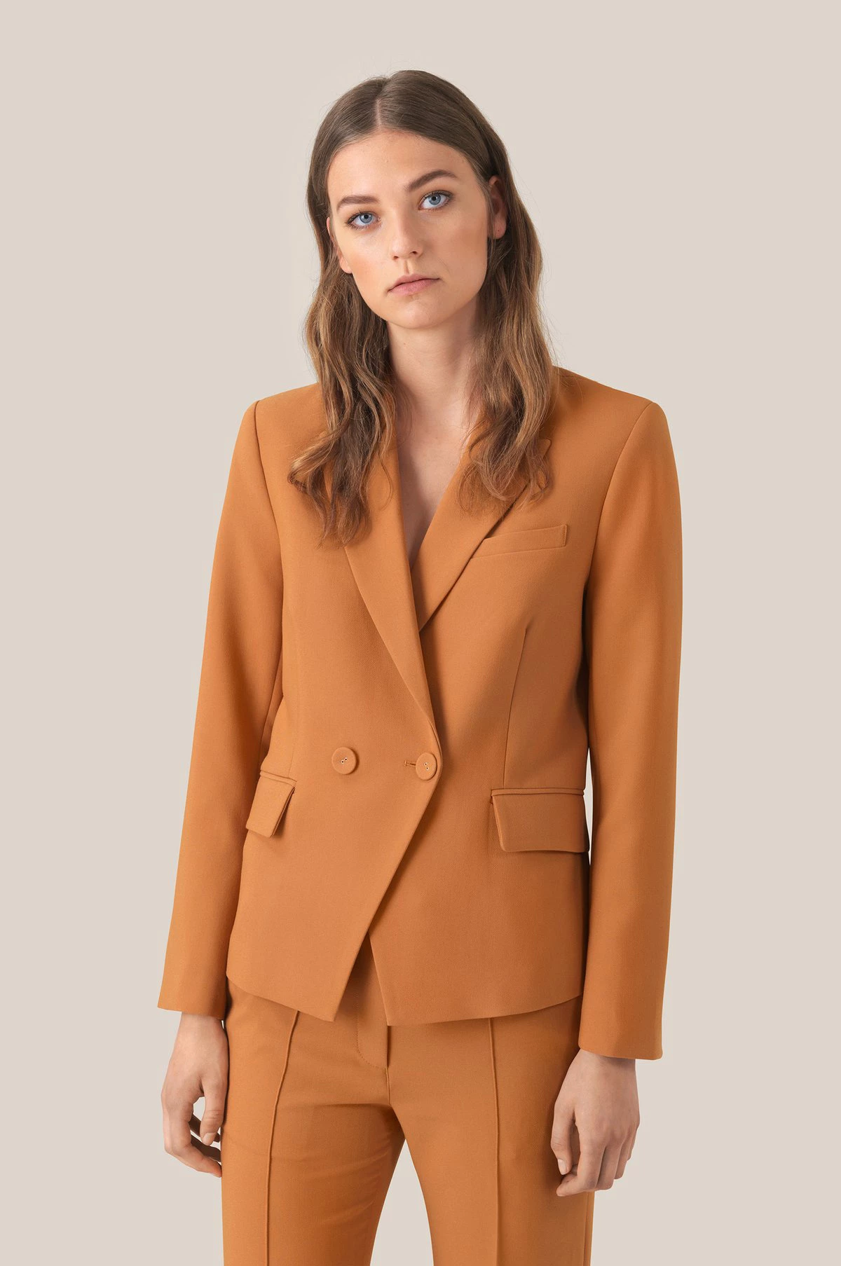This blazer is made from a polyester, viscose blend with elasticity. It is double breasted, has a peak lapel and fabric covered buttons. The blazer is fitted and has long sleeves. It also has a chest pocket and straight pockets with flaps. It comes with matching trousers.