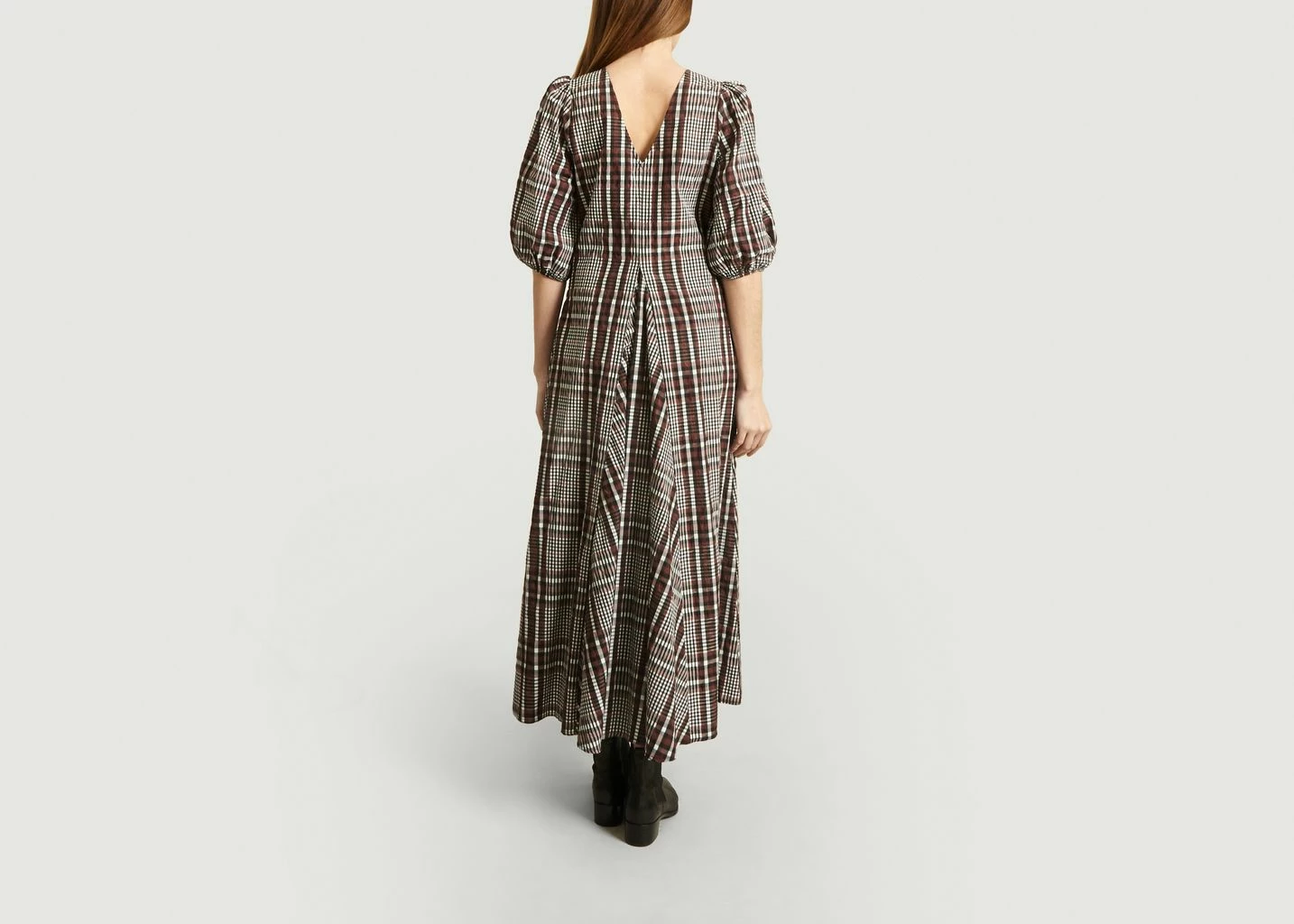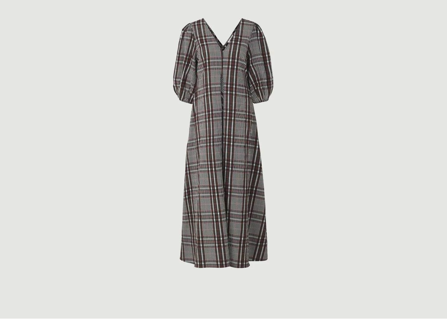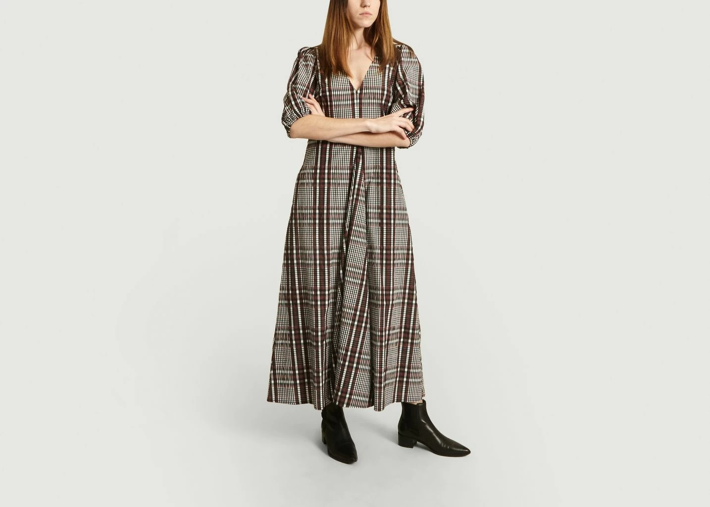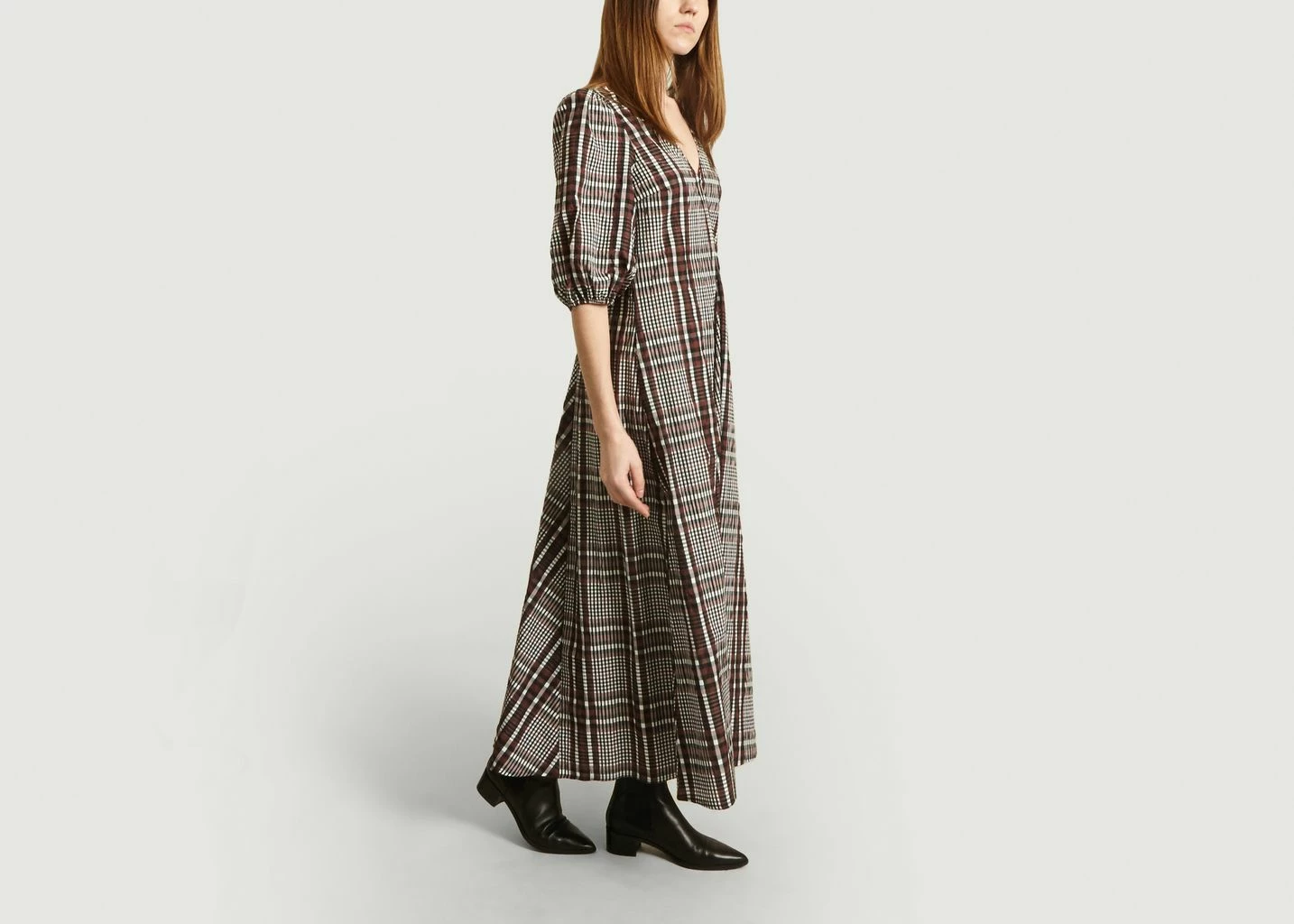 Emily long dress made of embossed cotton, polyester and polyamide in a black color with check print. It has a classic cut with a deep V-neck, 3/4 sleeves with pleat detail, pleat detail on the shoulders to give volume, a V opening in the back, an all over print and tone-on-tone stitching.