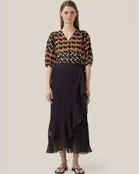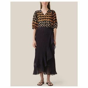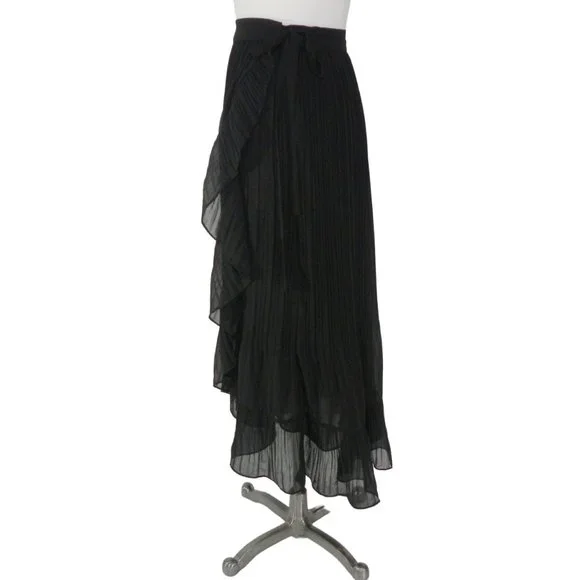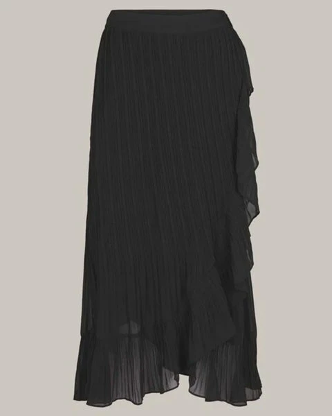This black wrap-around skirt, made from a pleated chiffony material, has ties in the waist and a high ruffle trim all the way round the edge of the skirt. A chic addition to any wardrobe. Wrap-around skirt Pleated High ruffle trim Second Female’s sophisticated yet fresh collections are a meticulous exercise on forming the ultimate modern classic wardrobe. 100% polyester chiffon. Length 36″