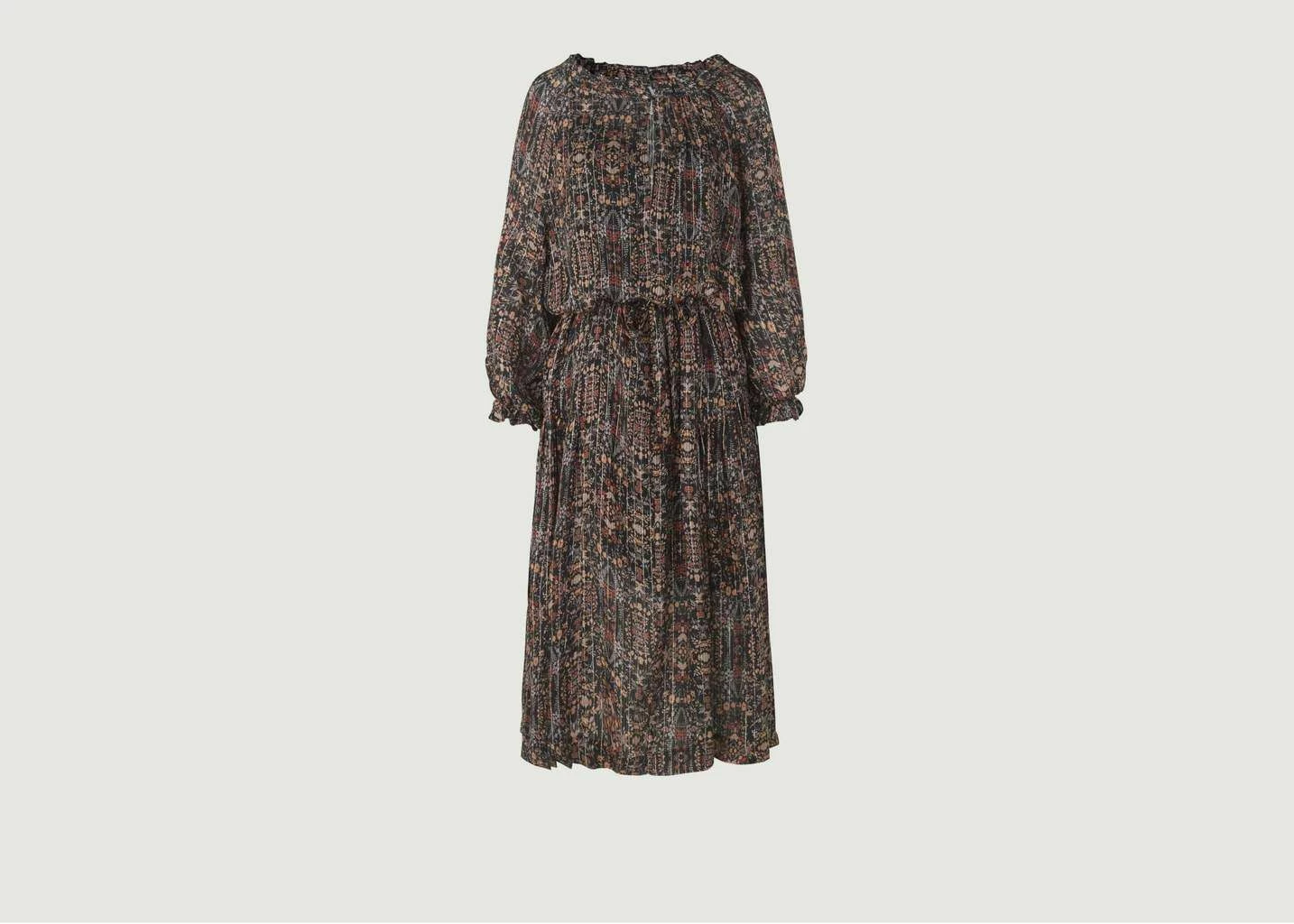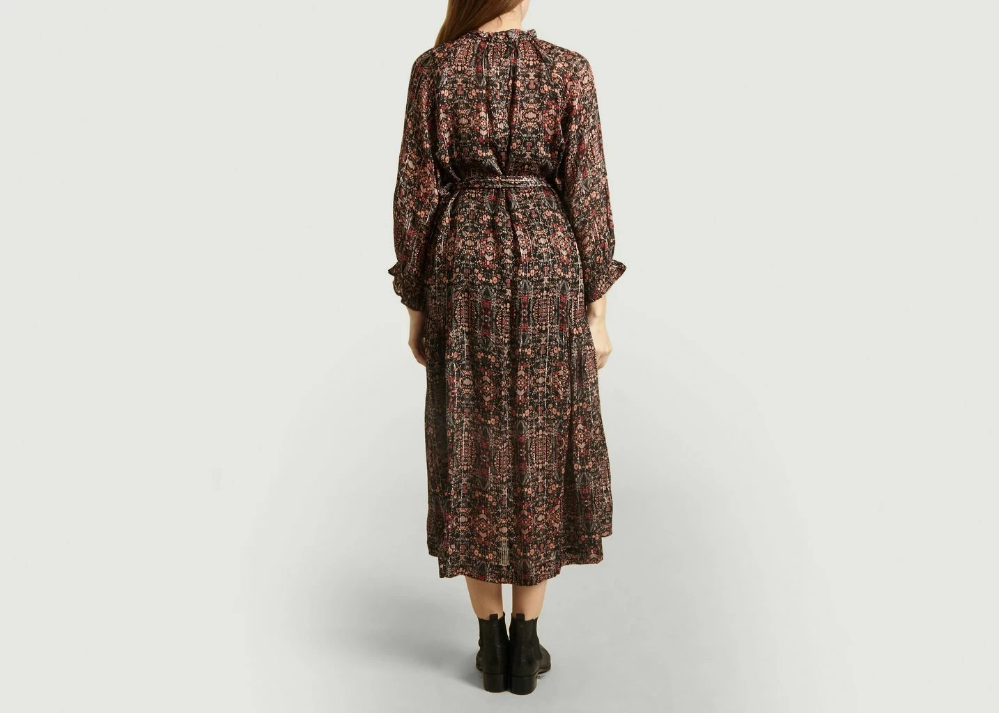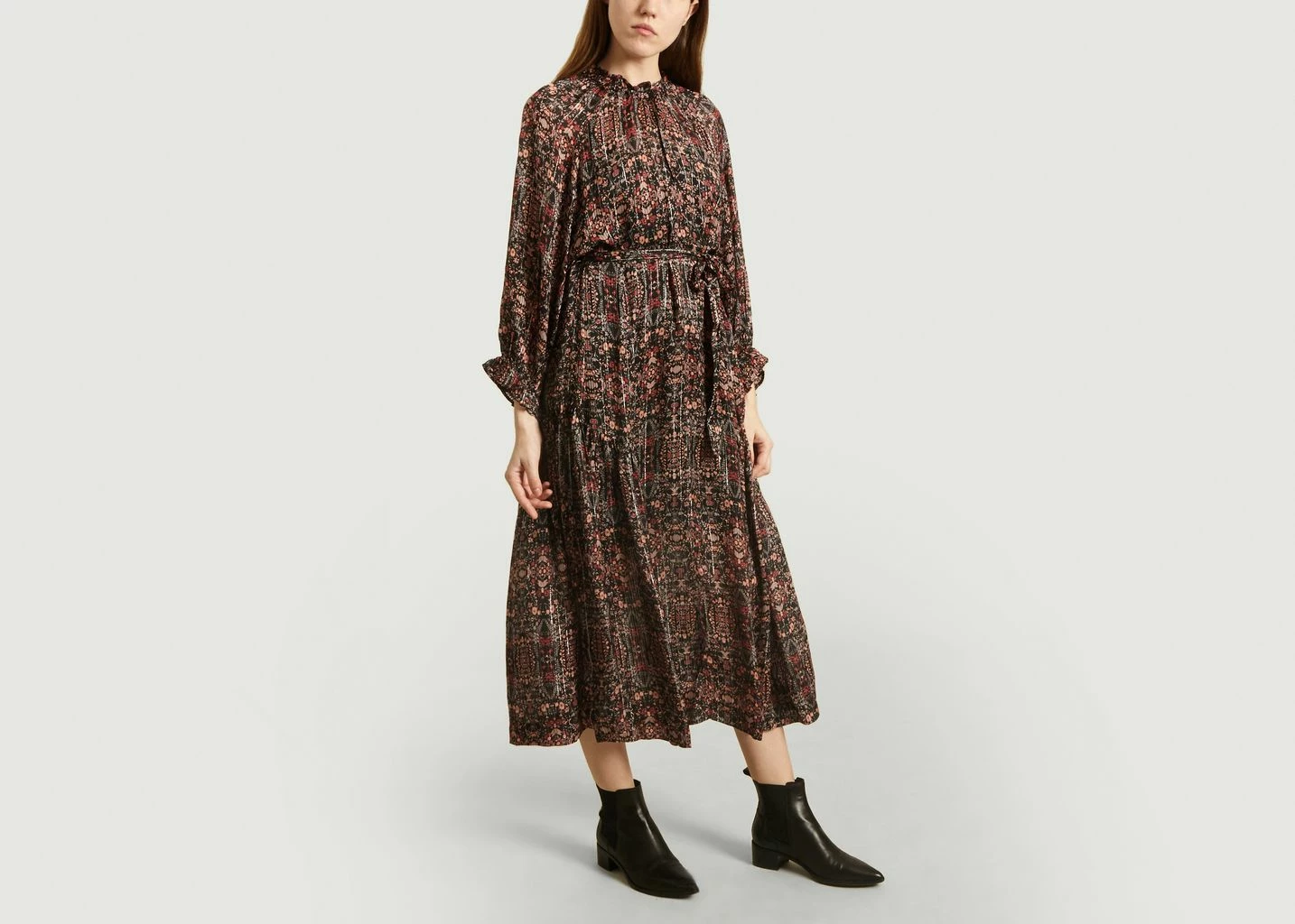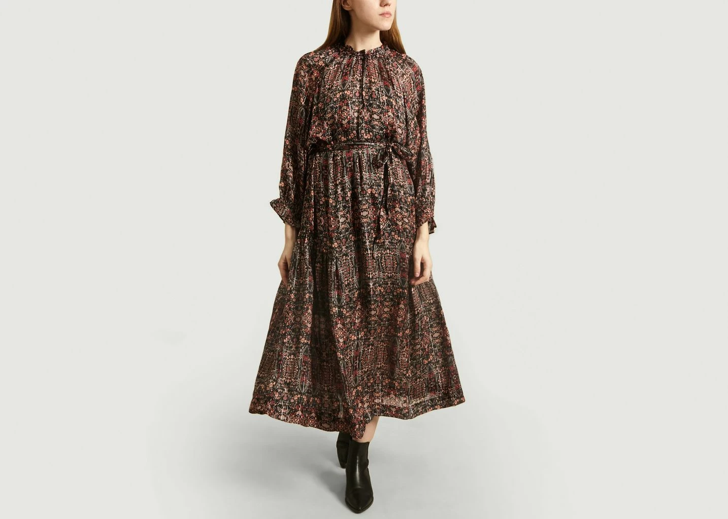 Signe long dress made of black viscose with a floral all-over print and lurex stripes. It has a classic cut, a wide neckline with button closure, long sleeves with ruffle details on the cuffs, a tie at the waist to mark the waist and tone-on-tone finishes.