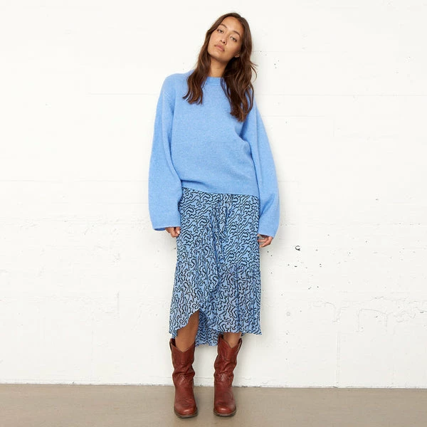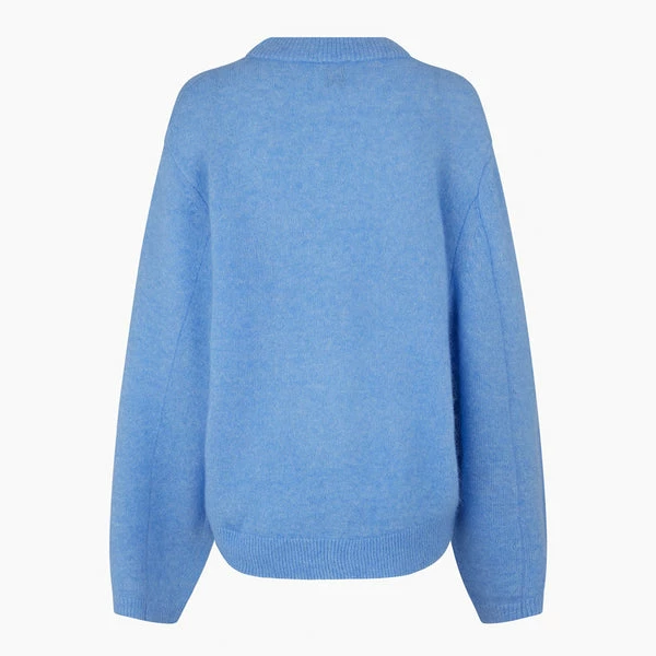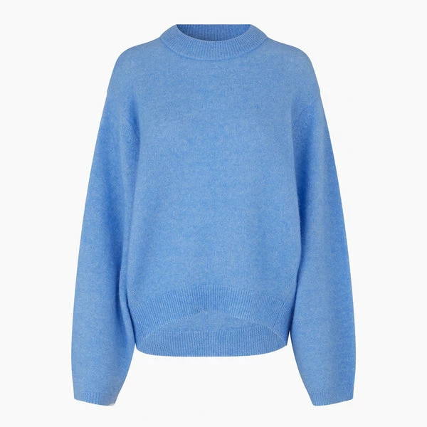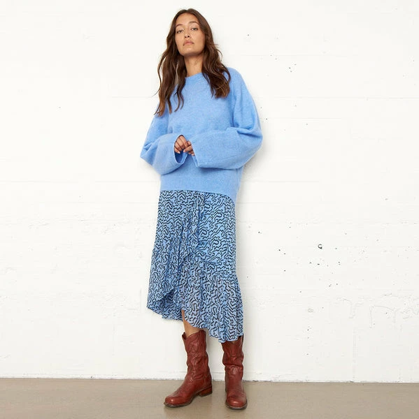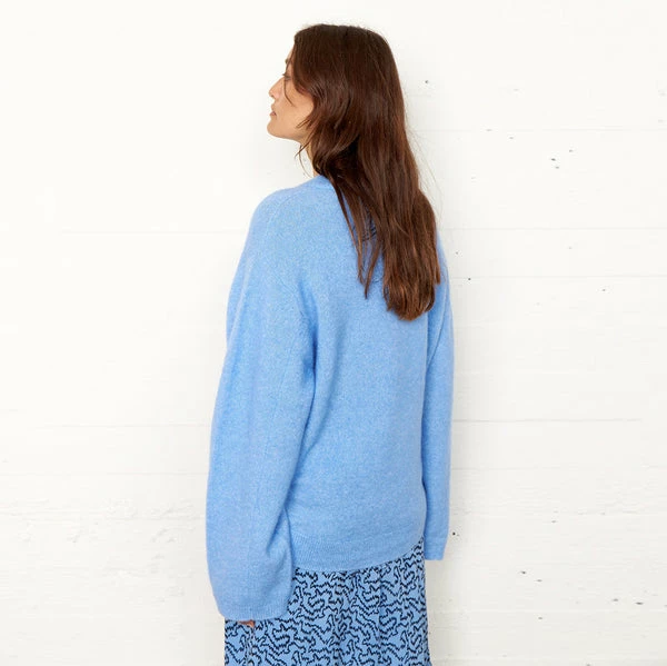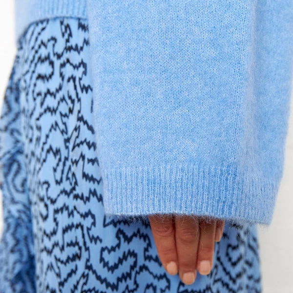 Crafted in a soft mohair and wool mix yarn, in a pretty cornflower blue hue, this lovely knitted jumper from women’s fashion brand Second Female is perfect for welcoming in the new season. With a loose but not oversized fit, it features a rounded neck, long wide sleeves, and rib at the neck, sleeve openings and hem. Great styled with a midi skirt and ankle boots, this is a lovely piece for transitioning your wardrobe from winter into spring. Brook Cornflower Blue Wide Sleeve Knit from Second Female. Made from 34% Mohair, 34% Wool, 27% Polyamide, 5% Elasthane. Hand wash. Do not bleach. Do not tumble dry. Iron on low. Dryclean – Any Solvent Except Trichloroethylene. Lay flat for drying and storing to ensure shape. Season: Spring 2022.