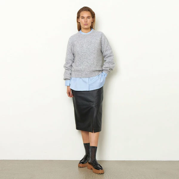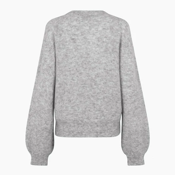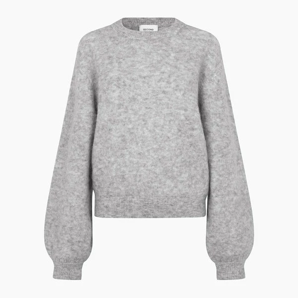 Crafted in a soft, certified mohair and wool mix in a timeless grey hue, this lovely knit sweater from women’s fashion brand Second Female features a round neck, regular fit, voluminous bell sleeves, dropped shoulders, and fine ribbing along the neck, hemline and cuffs. Perfect for year round layering, this looks great styled with a midi skirt, or layered up on colder days. Brook Grey Melange Reverse Drop Shoulder Jumper from Second Female. Made from 34% Mohair, 34% Wool, 27% Polyamide, 5% Elasthane. Hand wash. Do not bleach. Do not tumble dry. Iron on low. Dryclean – Any Solvent Except Trichloroethylene. Lay flat for drying and storing to ensure shape. Season: Winter 2021.