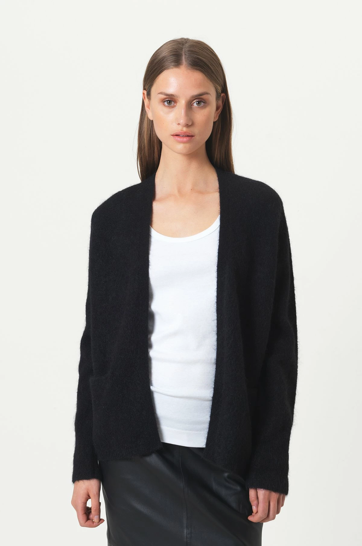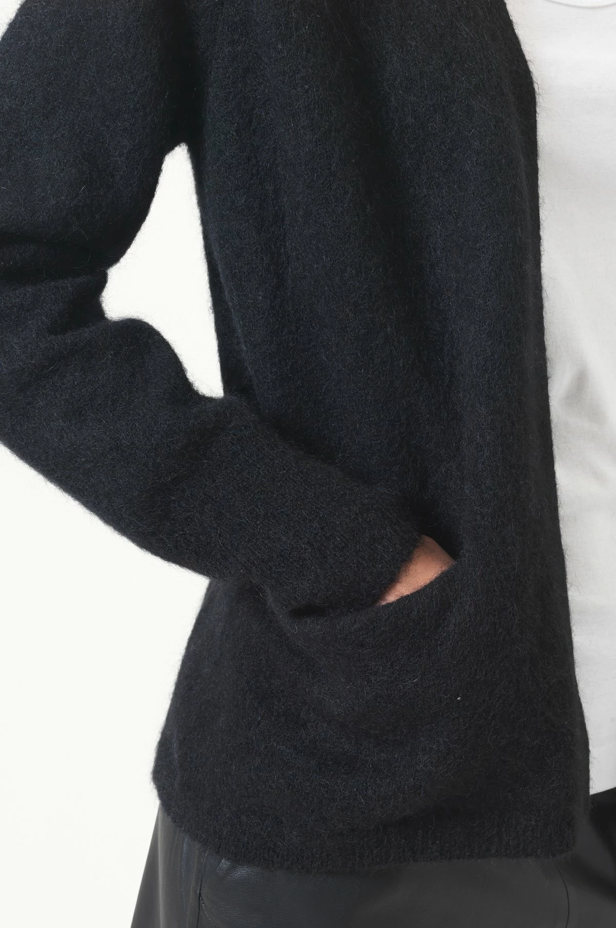 Colour: Black • Soft mohair and wool blend • Loose fit • Pockets with delicate ribbing Composition: 34% Mohair, 34% Wool, 27% Polyamide, 5% Elasthane Care label: • 30°C Hand wash or Gentle Process • Use mild detergent • Ironing – Low • Do not wring – Do not tumble dry • Lay flat for drying and storing to ensure shape