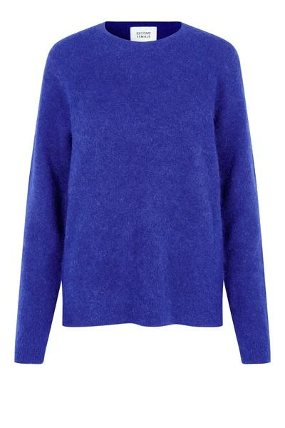 This round neck knit from Second Female is a gorgeous mohair wool blend in a stunning bright blue. The long sleeve style has a straight hem with side vents that looks great styled over a white shirt with denim or layered over a dress. A great wardrobe staple! Round neck Long sleeve with small rib cuff Straight step hem with side vents 34% Mohair 34% Wool 27% Polyamide 5% Elastane. Hand wash 51978