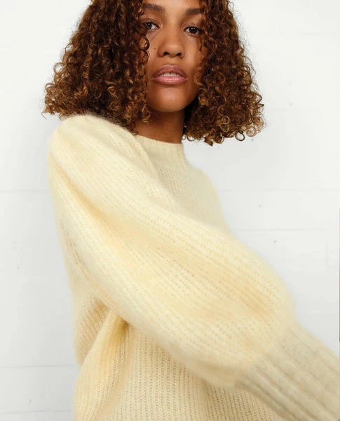 Second Female Brooky Banana Knit, a light yellow fluffy knitted pullover with a round neck and 3/4 length balloon sleeves. Also available in green the Brooky jumper is knitted from a stretchy blend of mohair and wool. The polyester gives it longevity. 34% Mohair, 34% Wool, 27% Polyamide & 5% Elastane Hand wash cold and dry flat to avoid stretching XS – UK8, S – UK10, M – UK12, L – UK14 Size down if between sizes as Second Female sizes generously
