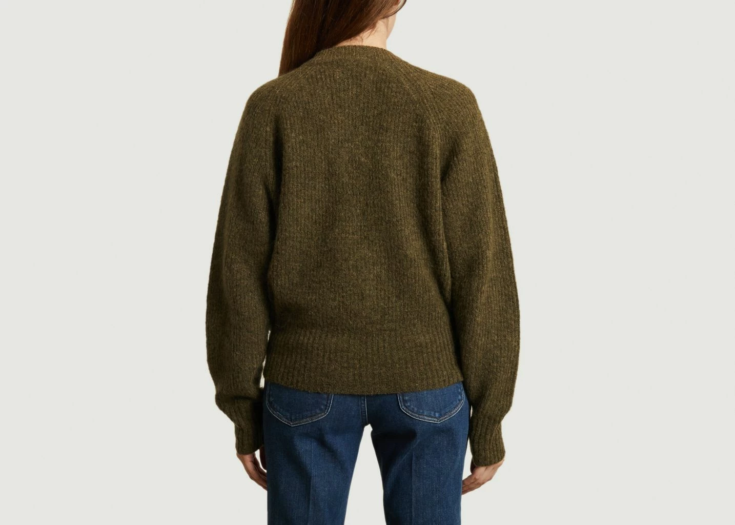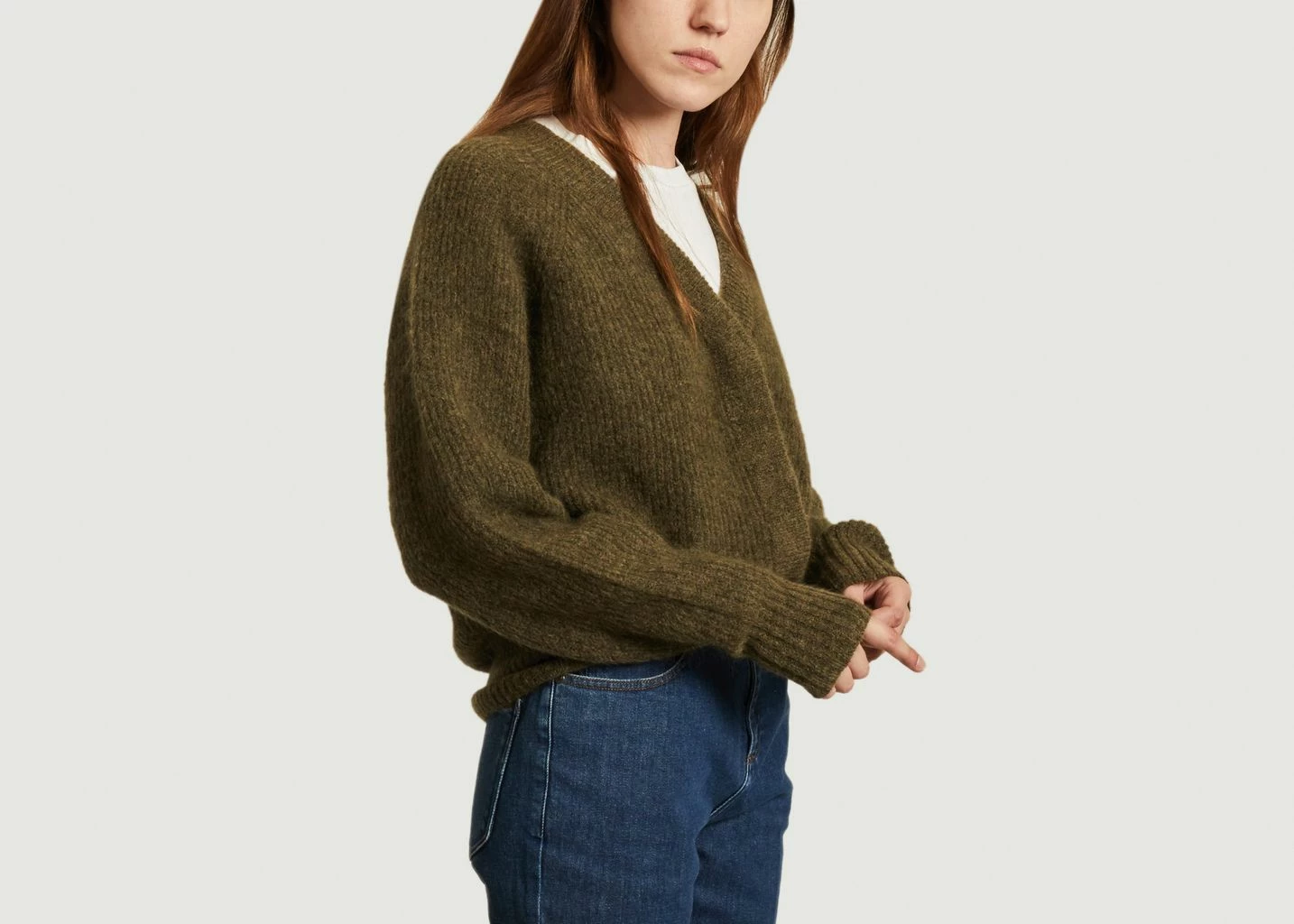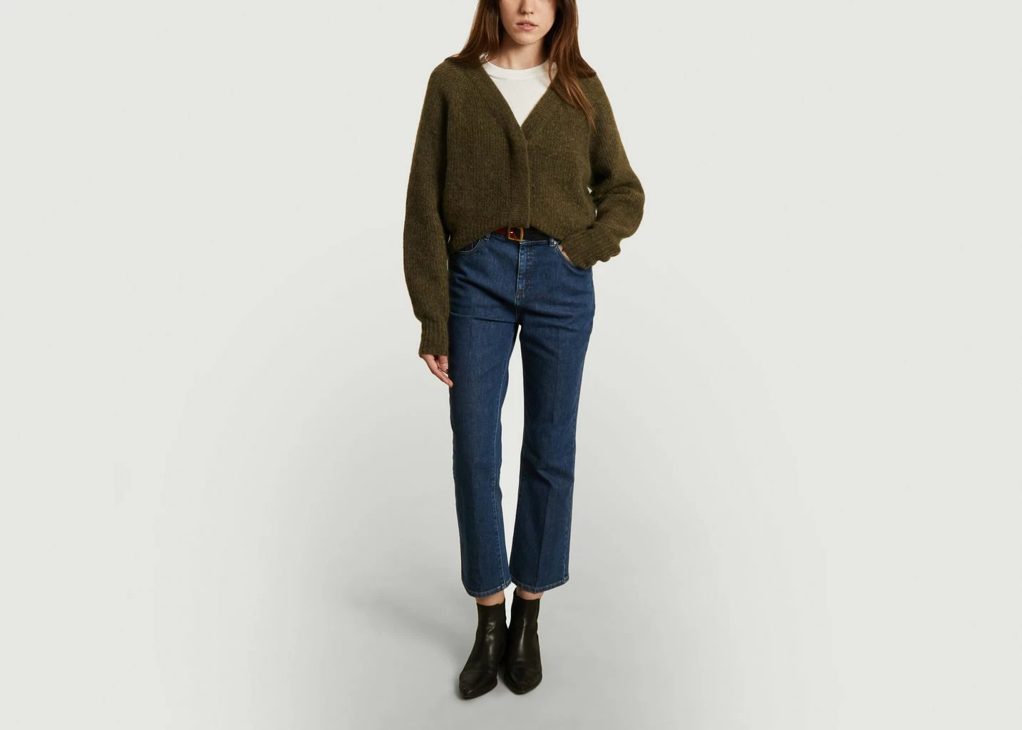Cardigan made from a soft khaki green mohair blend. It has a loose fit, long raglan sleeves, a V-neckline and a front opening with hidden buttons. The cardigan features fine ribbing along the opening, cuffs and hem. The cardigan remains one of our favourite pieces to spend a warm winter. Second Female understands this and this season offers us a soft and warm mohair model. It can be worn over a turtleneck or a long dress.