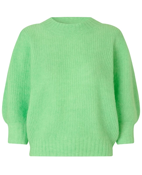 Second Female Brooky Green Knit, a bright absinthe green fluffy knitted pullover with a round neck and 3/4 length balloon sleeves. Also available in yellow the Brooky jumper is knitted from a stretchy blend of mohair and wool. The polyester gives it longevity. 34% Mohair, 34% Wool, 27% Polyamide & 5% Elastane Hand wash cold and dry flat to avoid stretching XS – UK8, S – UK10, M – UK12, L – UK14 Size down if between sizes as Second Female sizes generously