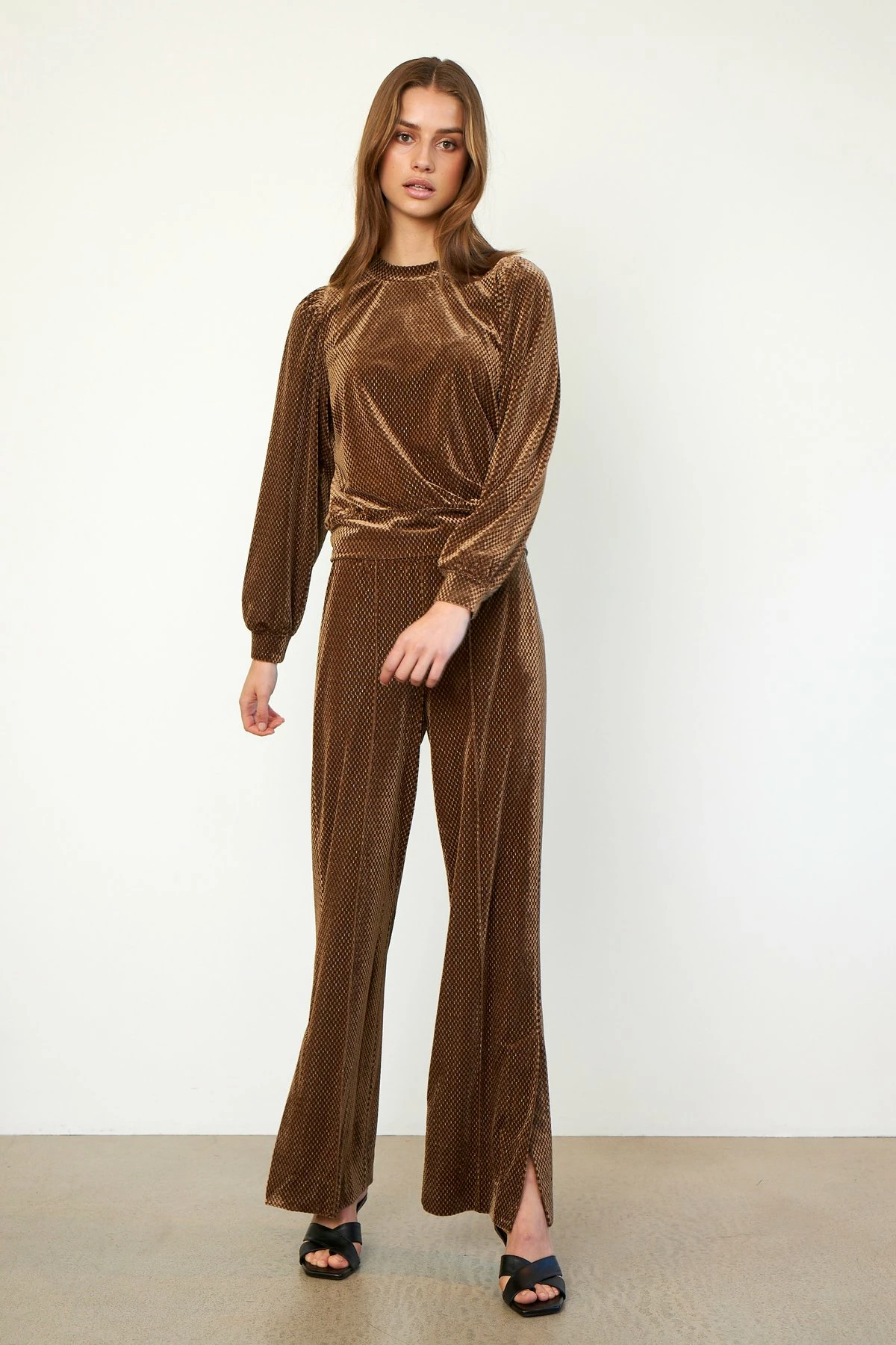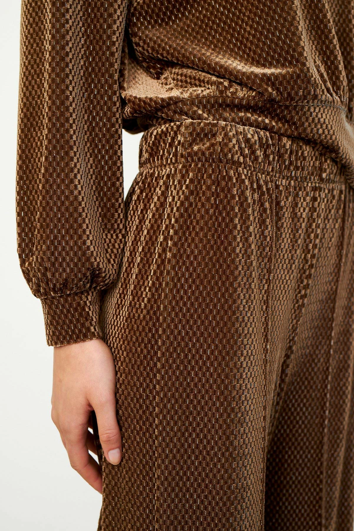 Colour: Brown/Bronze • Pretty trousers in a soft velour • Straight fitted legs • Elasticated waist Composition: 89% Polyester, 9% Elasthane, 2% Metallic yarn Care: Wash – 30°C (Gentle Process) – Wash inside out with similar colours Do not bleach Do not tumble dry Low Ironing No dry clean Flat dry Shrinkage up to 5%