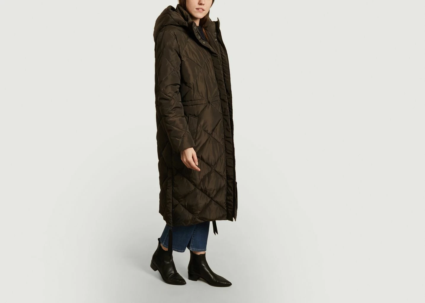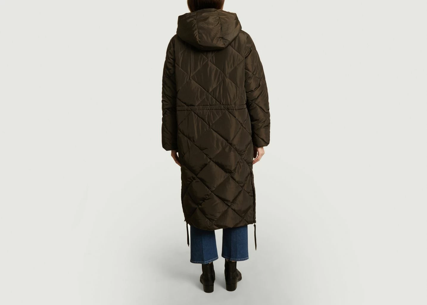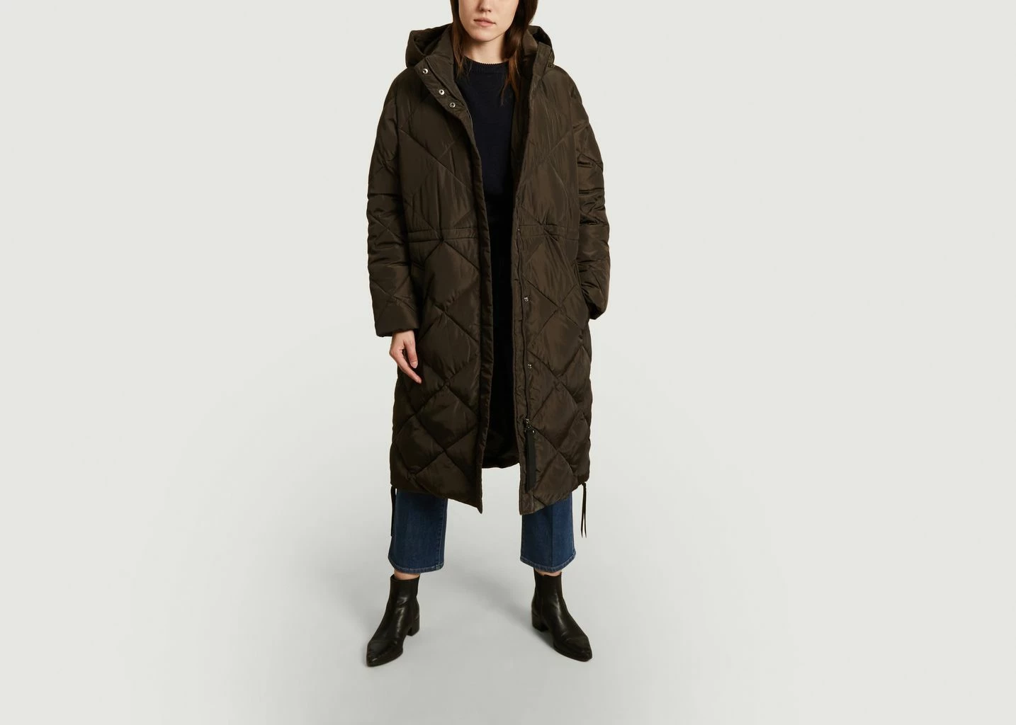Dark khaki windbreaker long down jacket in recycled polyester, straight cut, long sleeves, high collar topped with a hood, concealed central closure by zip and press studs, side slits, 2 side pockets, drawstrings on the waist and on the base.