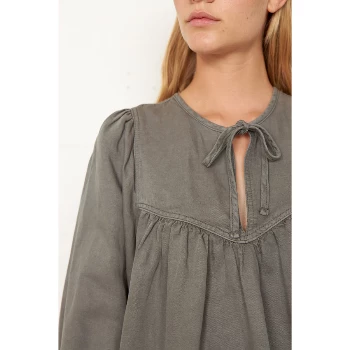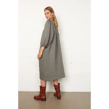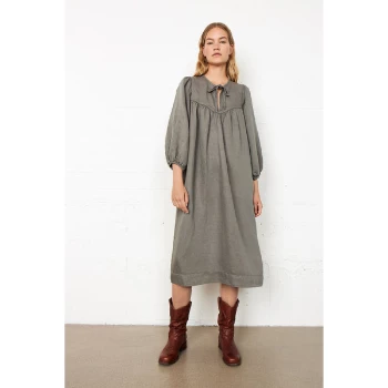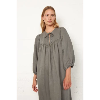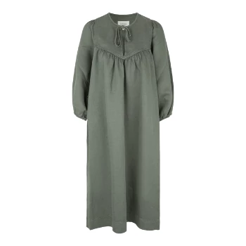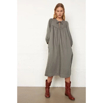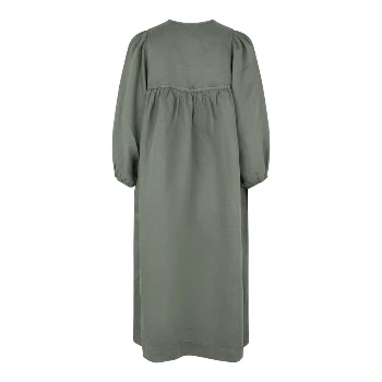Second Female dress with a loose fit and midi length. The dress has long sleeves with gatherings at the shoulder and sleeve openings. The neck is round and can be opened or closed with strings. There are cutlines above the chest with gatherings underneath, and pockets in the side seams.