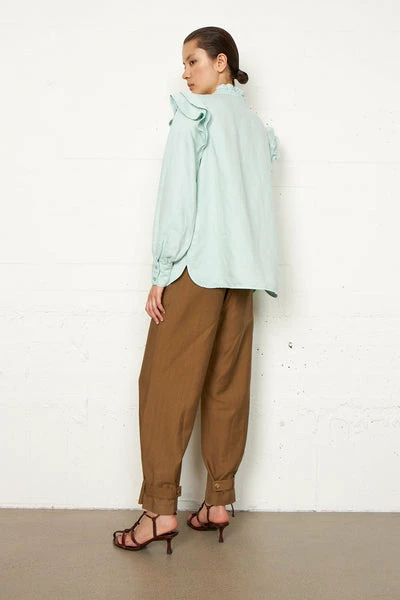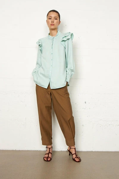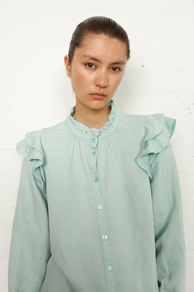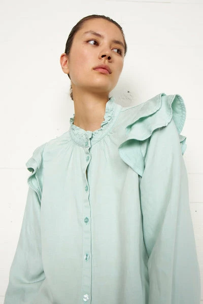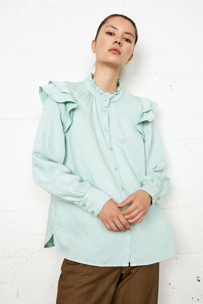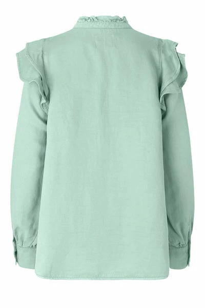Second Female shirt with a classic fit. The shirt has long sleeves with gatherings above the cuffs, which have slits and button closure on the backside. The shoulders have decorative ruffles, and the neck has a small ruffle as well. The shirt has a placket with visible buttons. Shirt with classic fit Long sleeves with gatherings Ruffles at shoulders and neck Button closure on the front