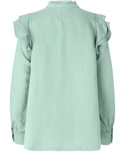 Second Female Capsella Surf Shirt, a soft woven blouse with long sleeves and a frilly ruffled collar. Fastening with buttons down the front this bluish green button down shirt has frilled ruffles on the shoulders and a loose straight feel. The lyocell and linen blend has a lightweight canvas feel. 60% Lyocell & 40% Linen Machine wash at 30 XS – UK8, S – UK10, M – UK12, L – UK14 Size down if between sizes as Second Female sizes generously