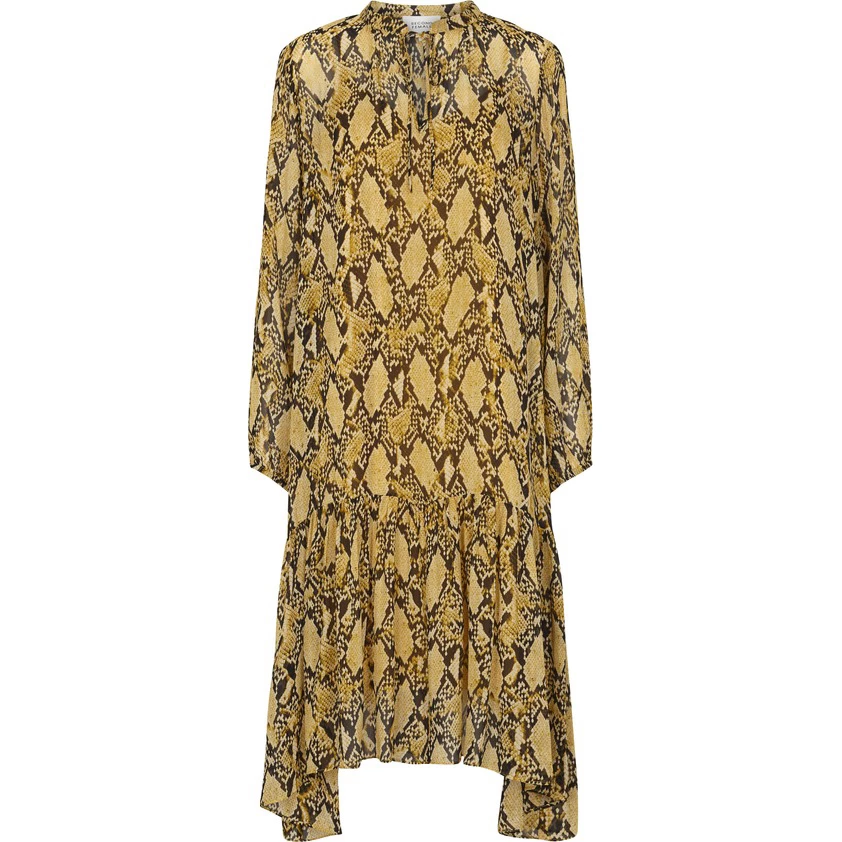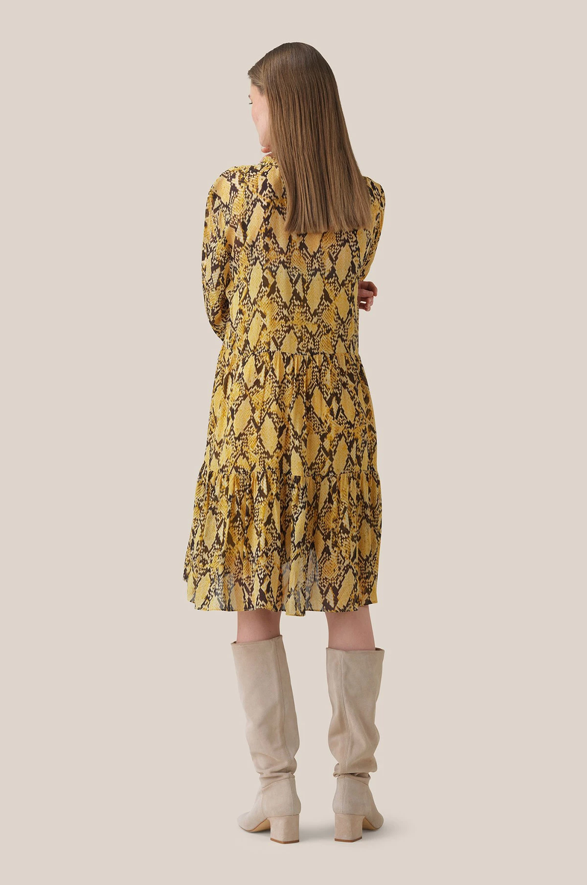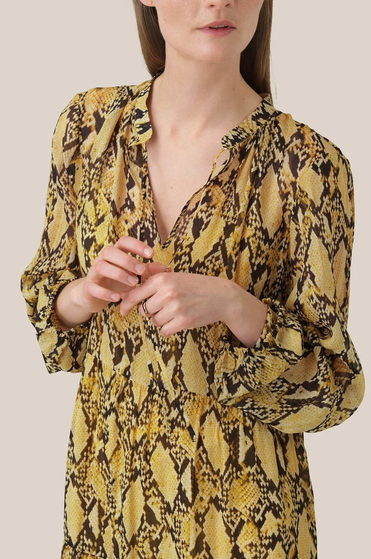 This dress is made from a slightly transparent viscose crepe material with an all-over snake print and matching petticoat. The dress has a delicate collar with V-neck, which fastens with a thin tie. The long sleeves with a slight volume end with elastic in the wrists. At the bottom the dress finishes in a high asymmetrical ruffle trim.