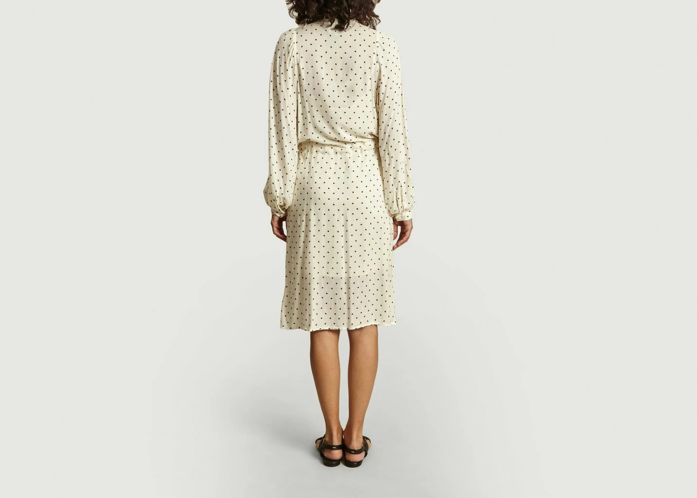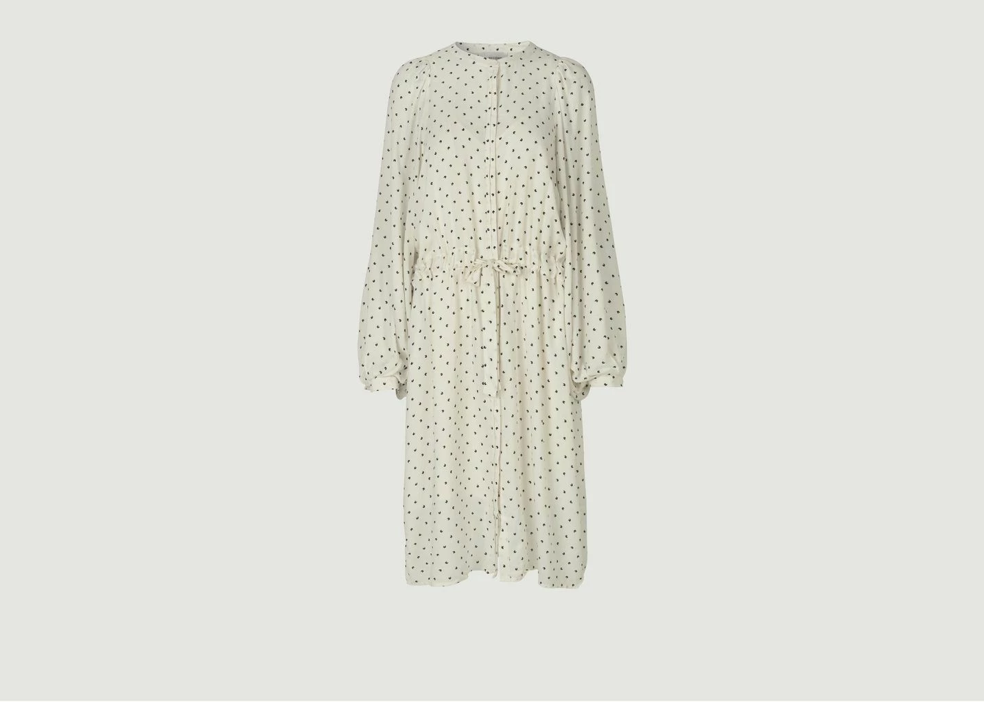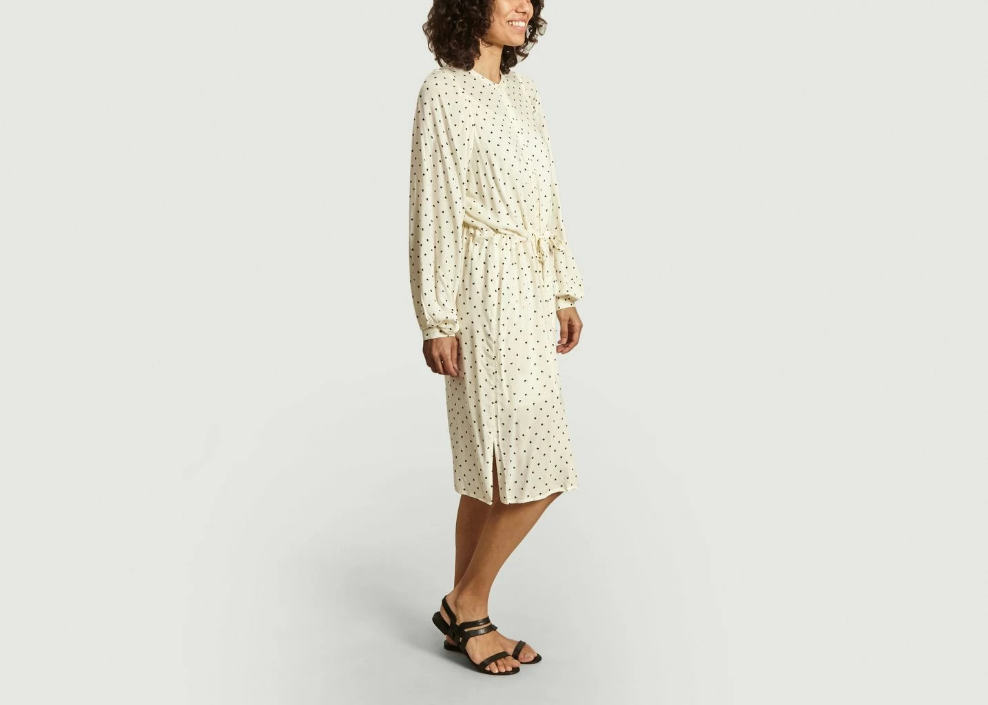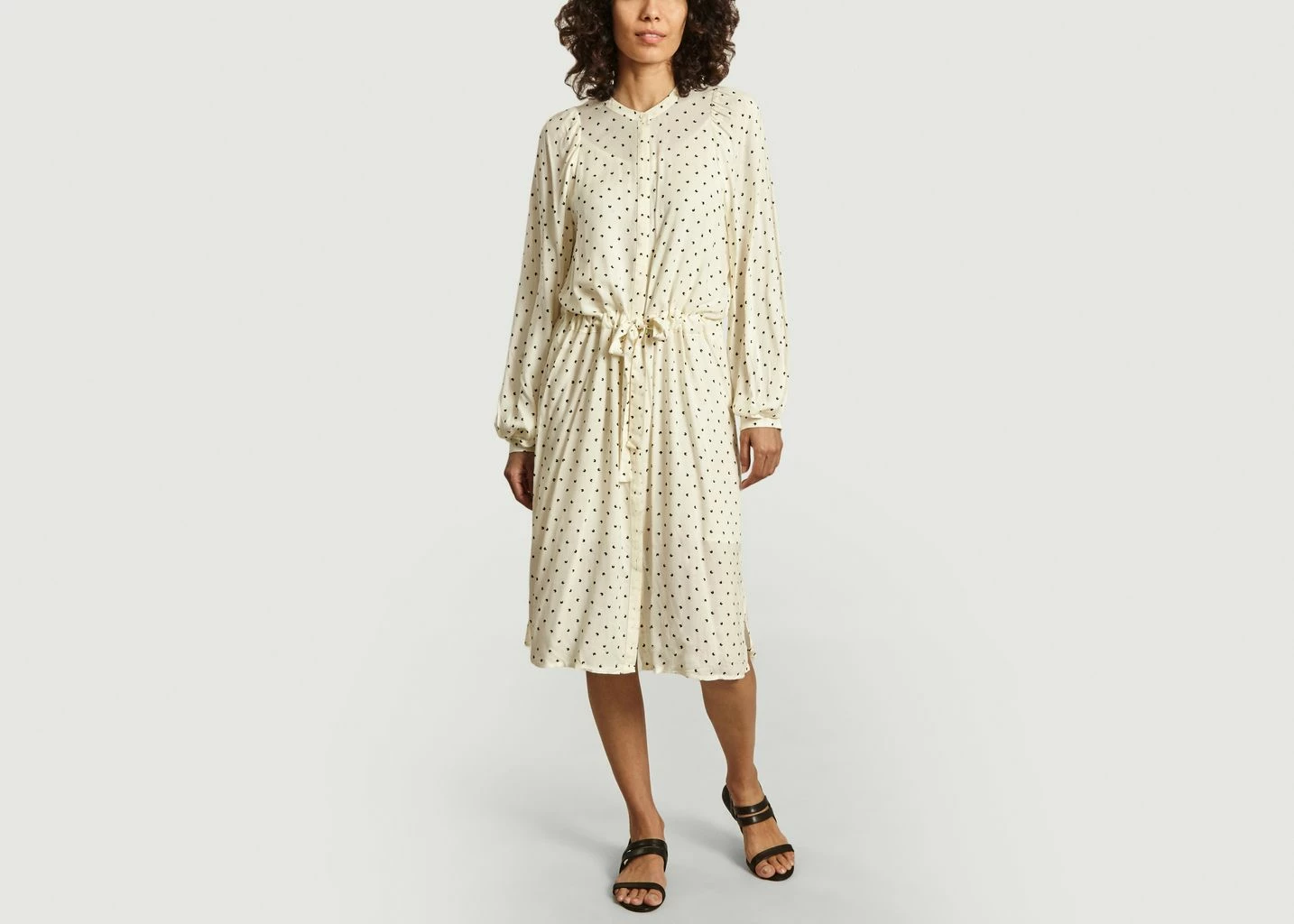Mid-length dress made and lined in cream-coloured viscose with a speckled print all over. It has a classic cut, long sleeves, a mandarin collar, a button placket at the front, buttoned cuffs, an adjustable tie belt at the waist and tone-on-tone finishes. We fall in love with this light little dress that Second Female offers us. It is easily worn with a pair of sandals with square heels or with a pair of sneakers for a casual look.