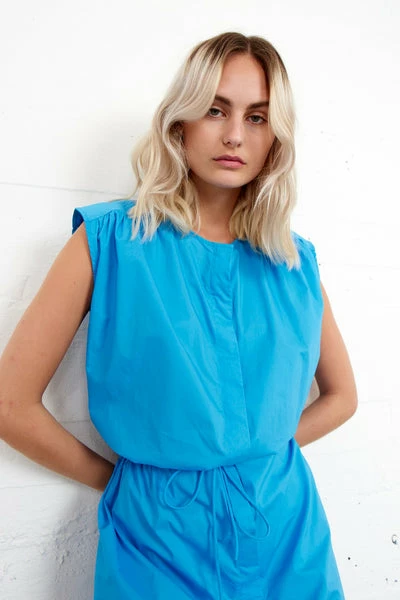A gorgeous simple dress from Second Female, the Dagny is cut from a gorgeous blue organic cotton for Summer 2022. The collarless style is a straight cut with a drawstring waist, in seam pockets and small gathers at the shoulder and across the back from the yoke. This dress poppers right the way through and has straight hem with side splits and the centre back seam has a double stitched detail. This dress is great worn simply with a flat sandal or pump for easy day wear, will dress up with layered jewellery and a wedge and is perfect layered over swimwear which makes it a perfect choice for a holiday wardrobe. Round neck Popper fastening In seam pockets Drawstring waist Straight hem with side vents 100% Organic Cotton Machine washable at 30 degrees Length 117cm centre back (S) chest 60cm (S) 55913