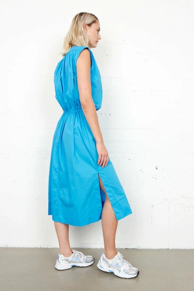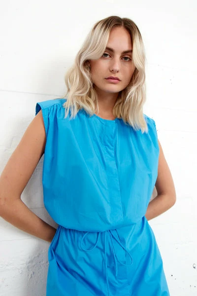 Second Female dress made with 100% organic cotton. In a beautiful bright blue, with side splits, a button down fastening and drawstring tie.