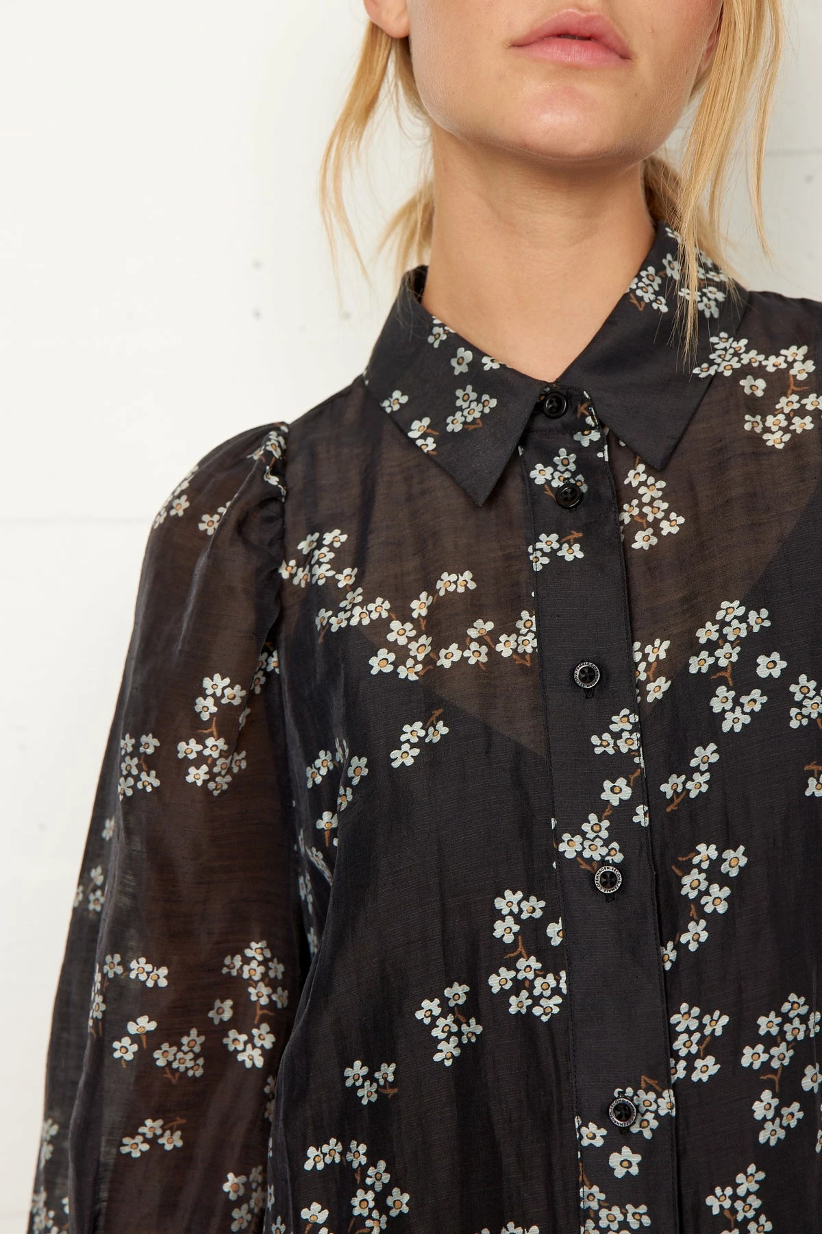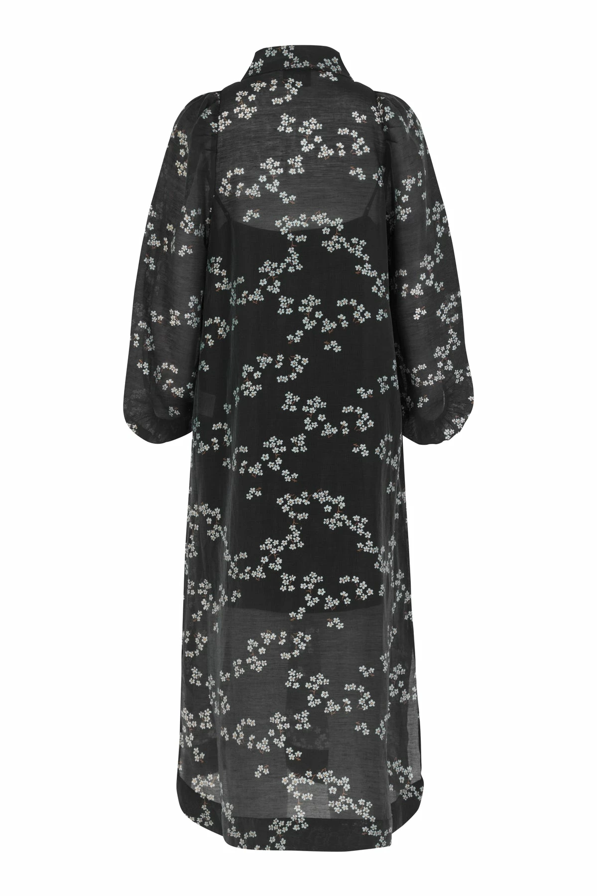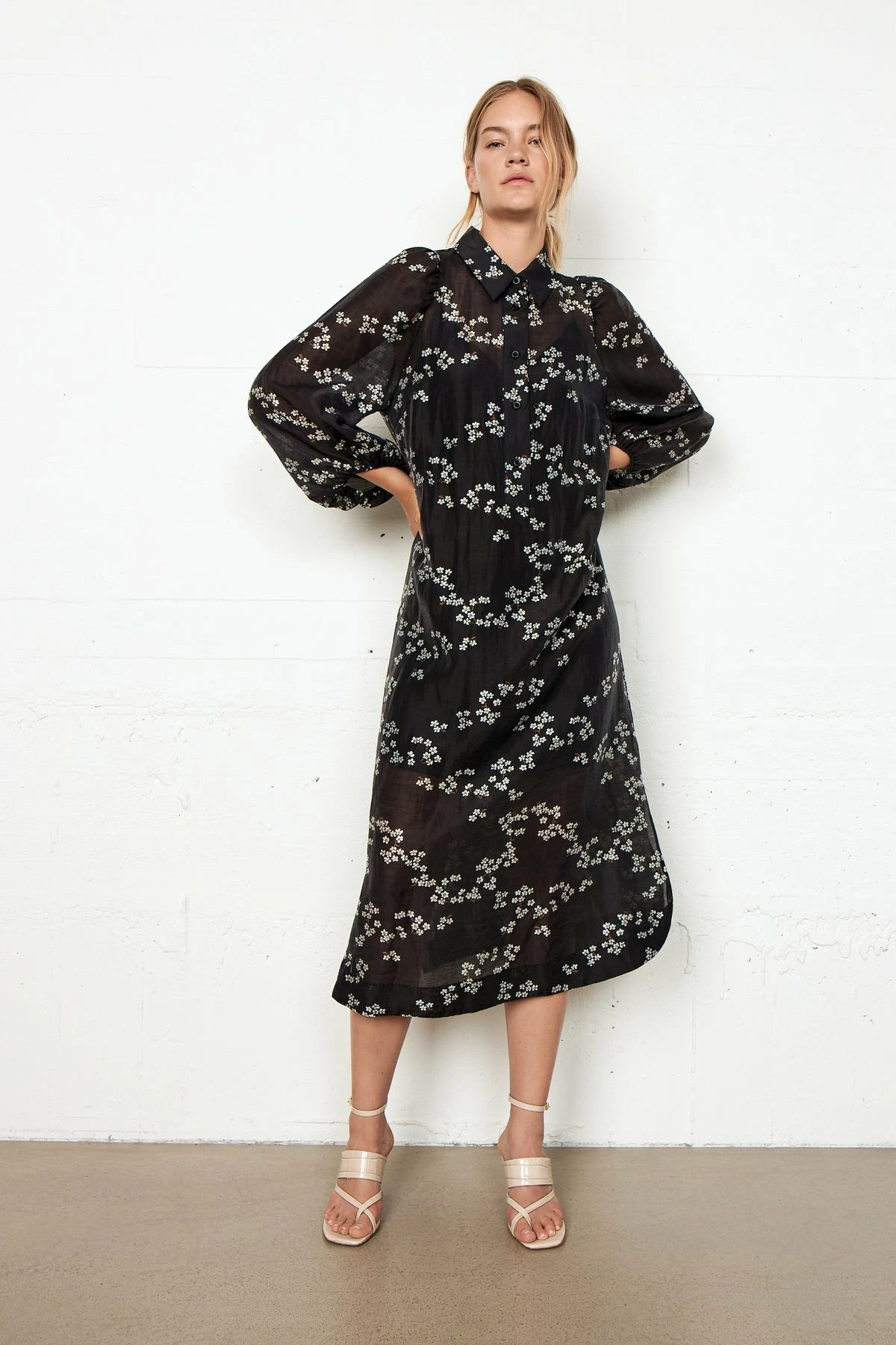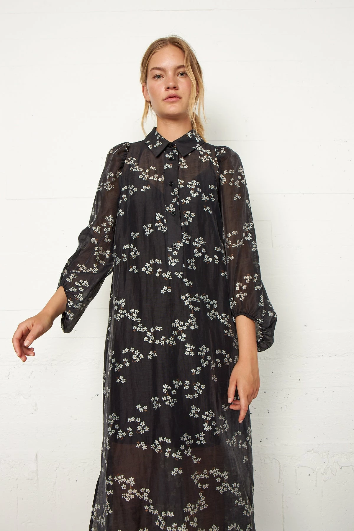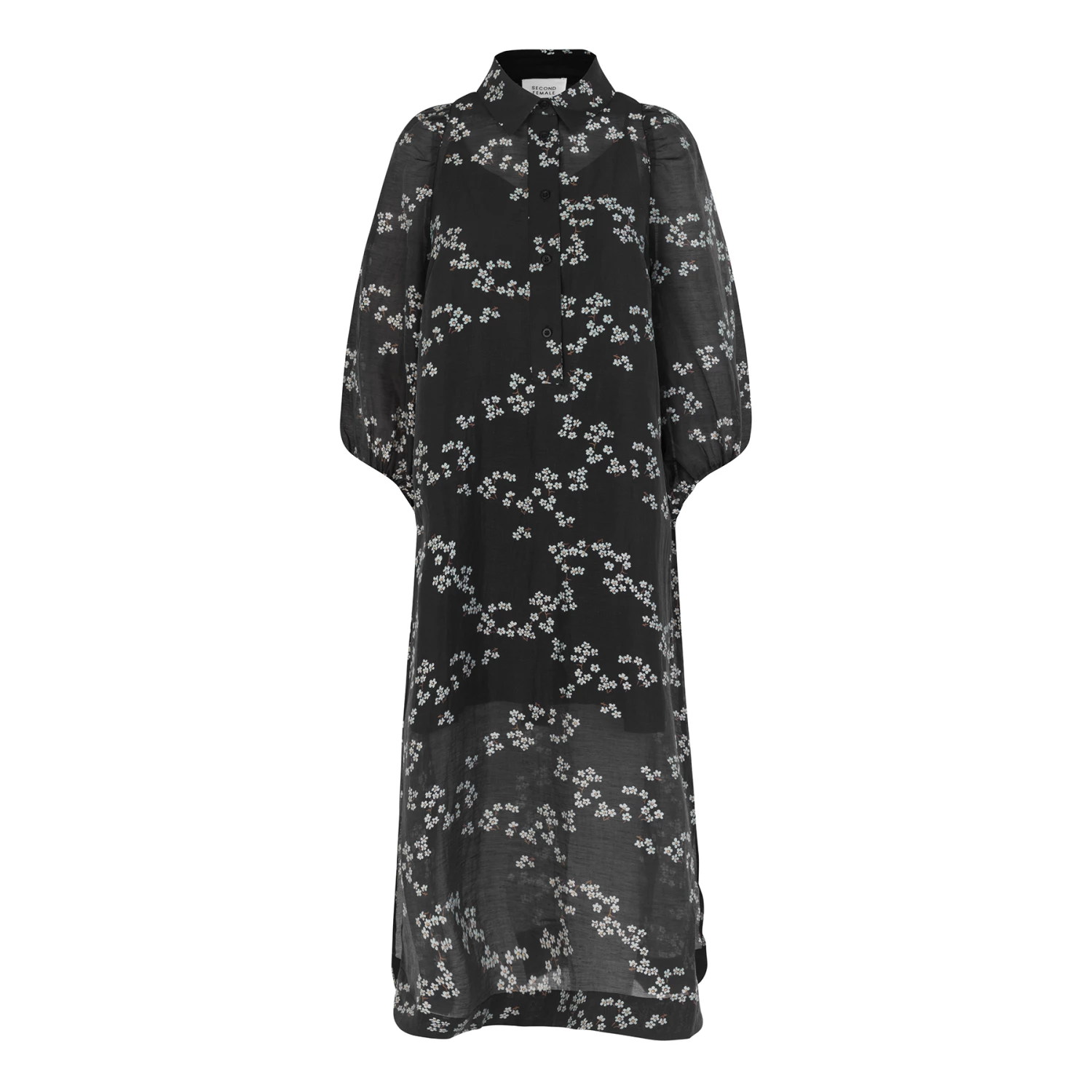 Second Female dress with loose fit and slits in the sides. The dress has half a placket with visible buttons on front and a classic shirt collar. The sleeves are big and has elastic openings.