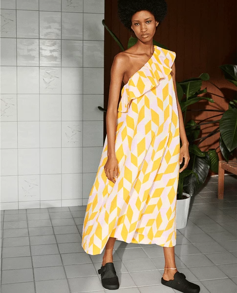 Second Female Dorit Marigold Dress, an eye catching pink and orange geometric Summer dress with an asymmetric frilly shoulder. Falling straight down to the calf this long patterned sundress has an elasticated neckline and a textured seersucker finish. 100% Recycled Polyester Machine wash at 30 XS – UK8, S – UK10, M – UK12, L – UK14 Size down if between sizes as Second Female sizes generously