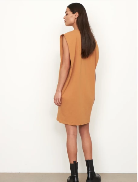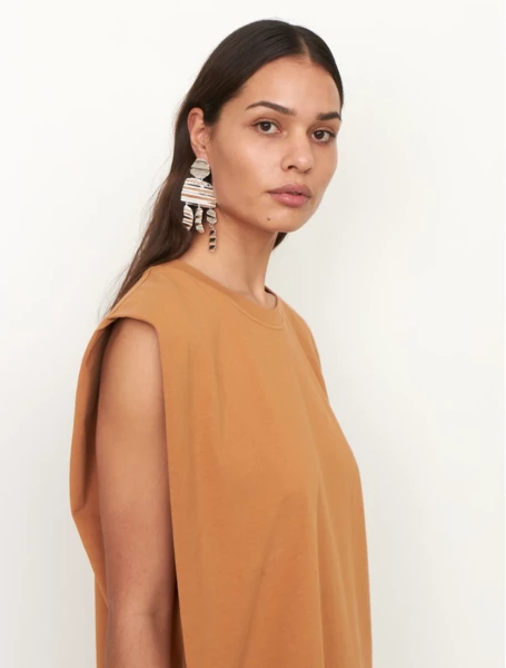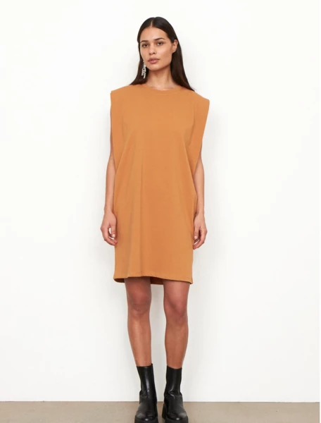 Edith Dress Jurk in biokatoen van het Deense label Second Female. Second Female T-shirt jurk – Edith Dress, Brown Sugar Zachte t-shirtjurk van Second Female. De Edith Dress heeft een basic t-shirt pasvorm met zeer korte mouwen die gewatteerd zijn aan de mouwrand, wat een schoudervulling geeft. Losse fitting. Materiaal: 100% katoen Wassen op 30 graden Afmetingen bij maat M / 38: Borstomvang: 138 cm omtrek Lengte: 93 cm. Second Female dress made in a soft, 100% cotton quality. The dress has wide shoulders and fine edge tape around the rounded neckline. The dress has loose fit and midi length. 100% cotton Wide placket Unique stripe combination Part of our Sustainable Choice More info or can’t find what your are looking for? Contact us Can’t decide? Ask your friends!