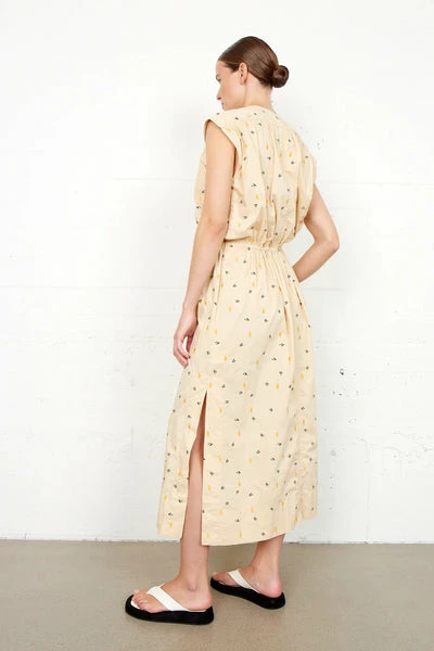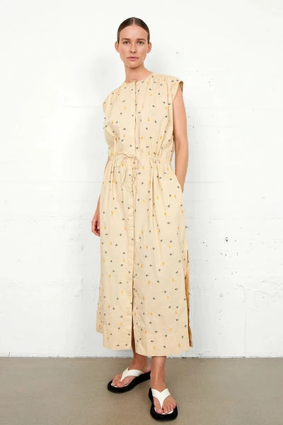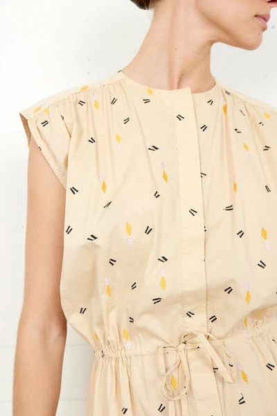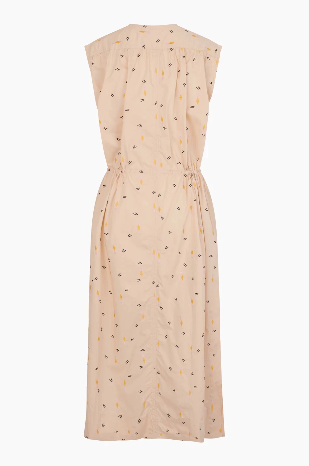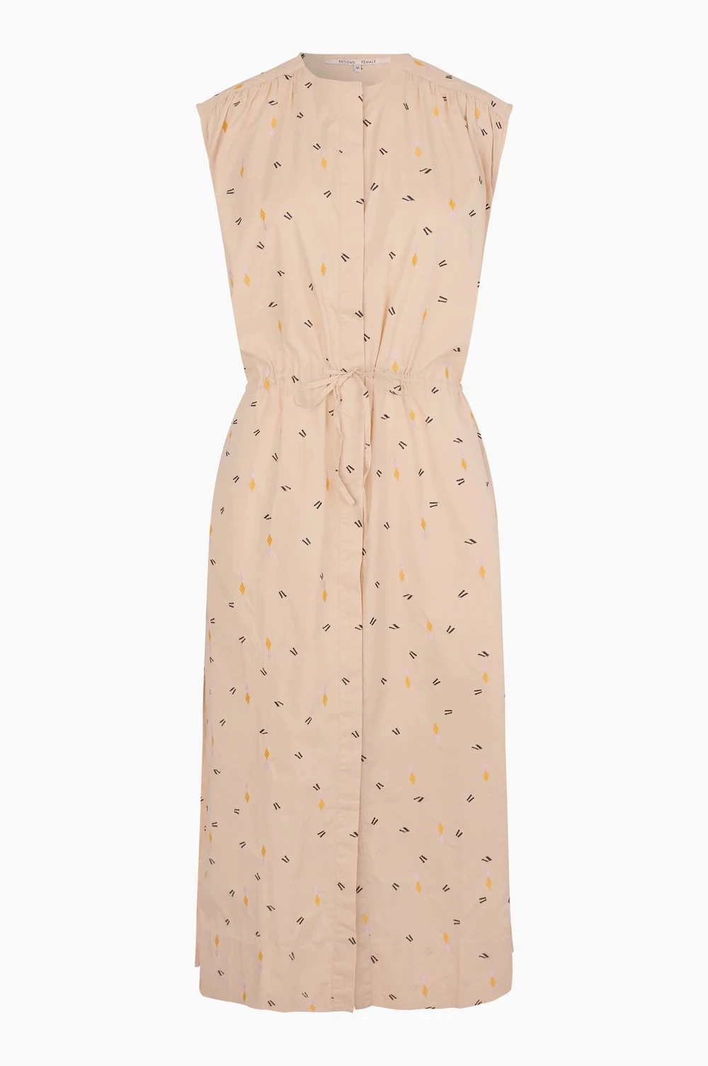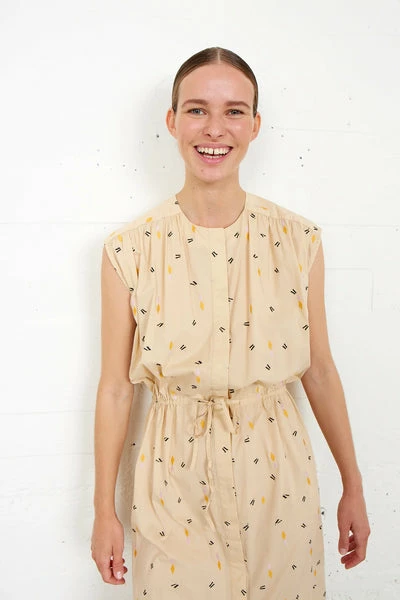Second Female maxi dress made with 100% organic cotton. The dress is long, with side splits, a button down fastening and drawstring tie. The fabric features a geometric multicoloured print.
