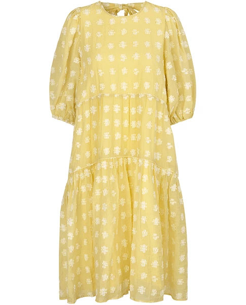 Second Female Evelin Golden Dress, an airy sundress with balloon sleeves in a golden yellow tone. With white floral detail and tie to the back of the neck, style with sandals or trainers for a casual look. 60% Cotton, 20% Nylon & 20% Polyester