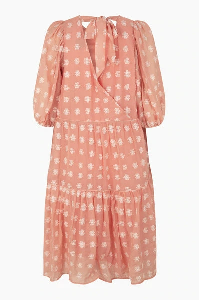 Second Female voluminous tiered dress. Made in a light, semi-sheer cotton-blend with 3D flower pattern. Featuring an open back with crossover detail and tie fastening at back of neck. Puffed shoulders with elasticated ends. Loose fit with two tiers that create a feminine and voluminous effect. Lined body with unlined sleeves. Semi-sheer cotton blend Crossover detail at back Feminine tiered skirt