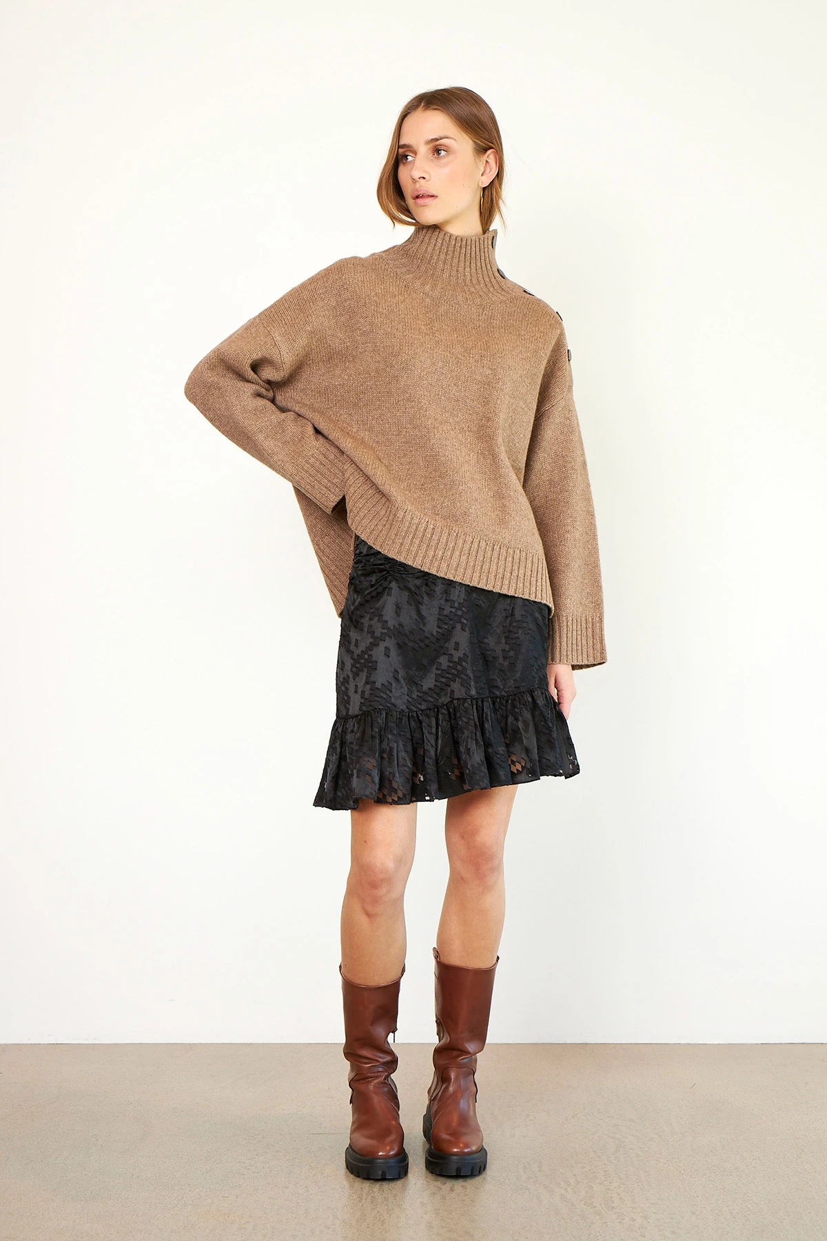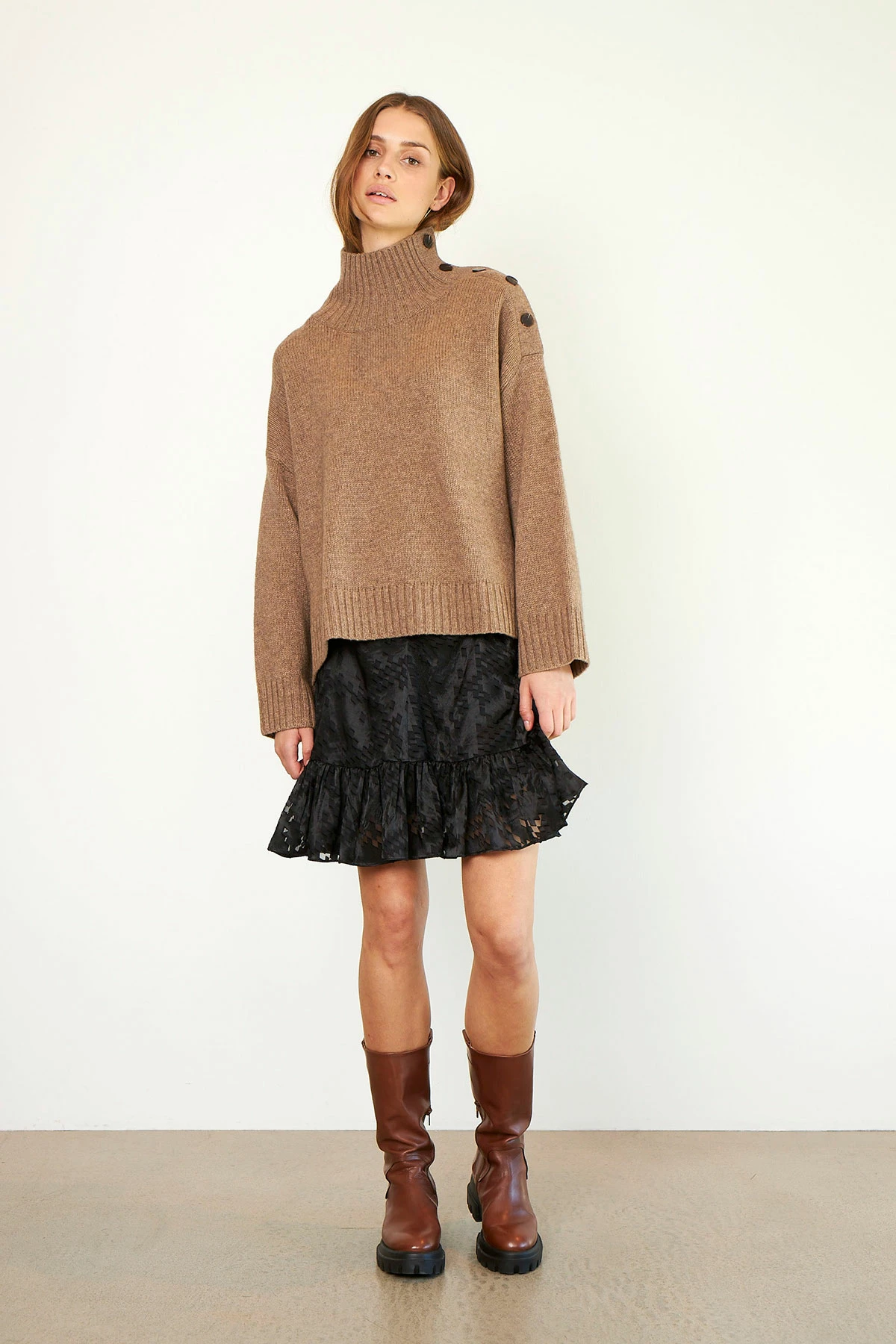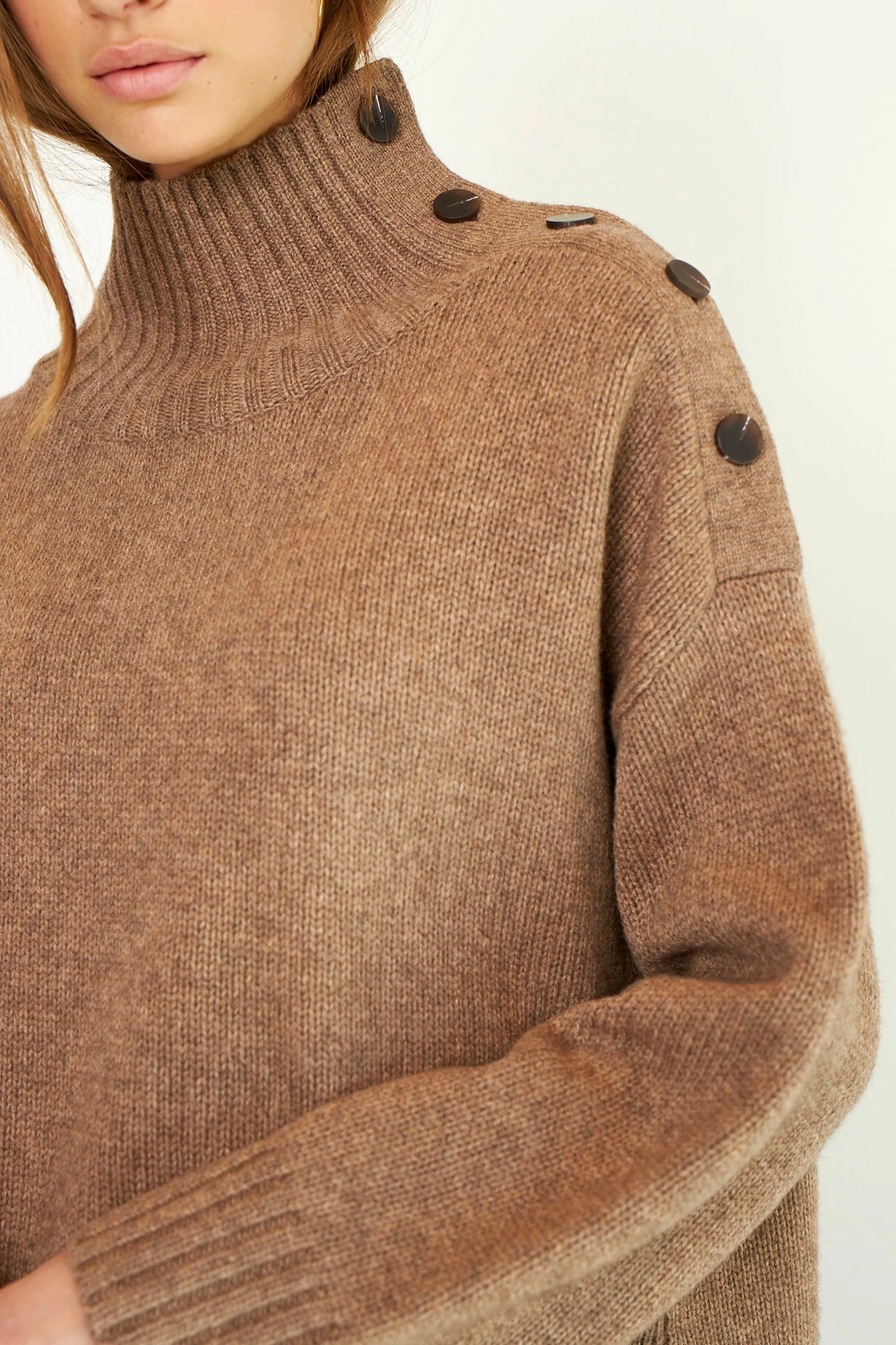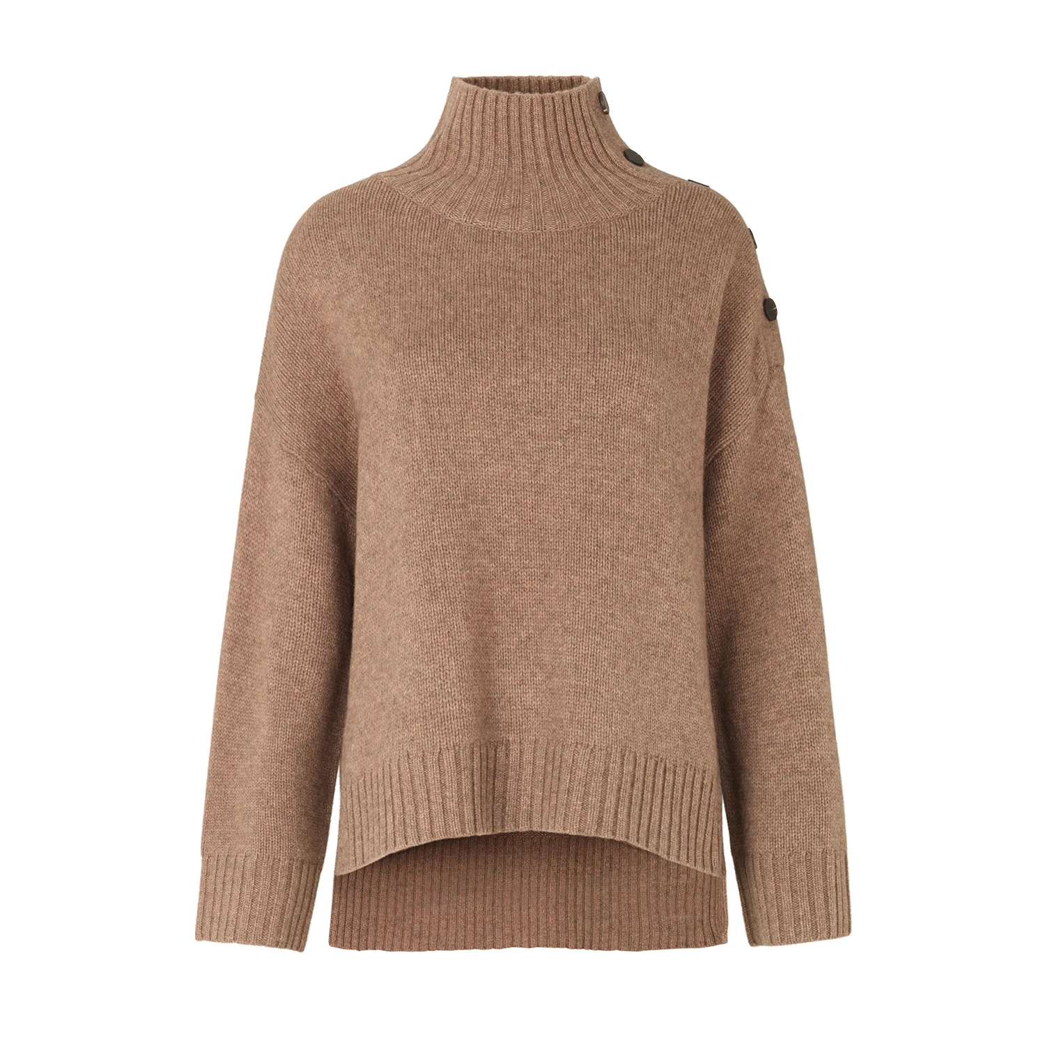This T-neck knit is made in a luxurious merino blend. It has dropped shoulders, button detail on shoulder and fine ribbing at cuffs, hemline and neck.