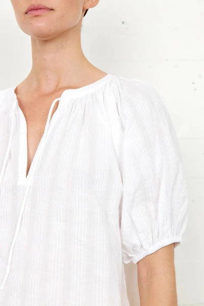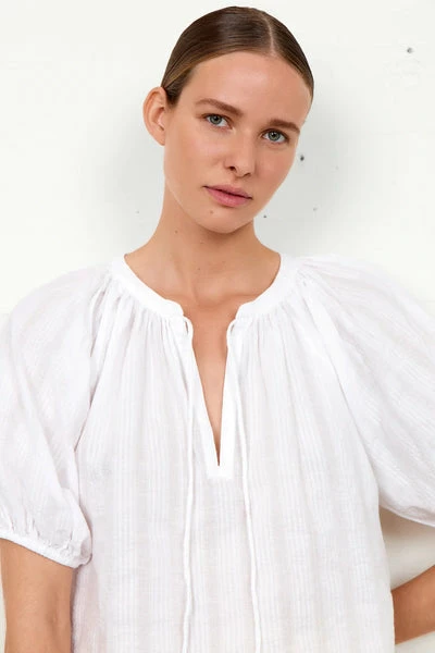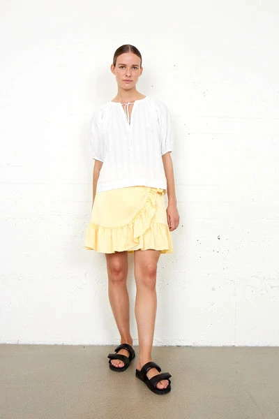 Another gorgeous cotton top from Second Female, the Frigg blouse is a short sleeved style with an easy boho vibe. The notch neck has a tie detail and the short raglan sleeves are a gentle balloon shape with an elasticated cuff. A perfect throw on style that looks great worn with white denim or shorts for a casual look, but is smart enough to pair with a smarter trouser for the office. Pull on style Notch neck with tie detail Short raglan sleeves Elasticated cuff Straight hem 100% Cotton Machine wash at 30 degrees 55830