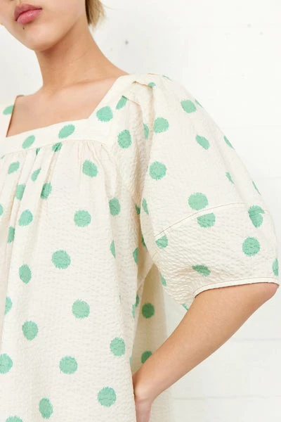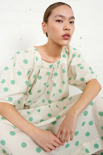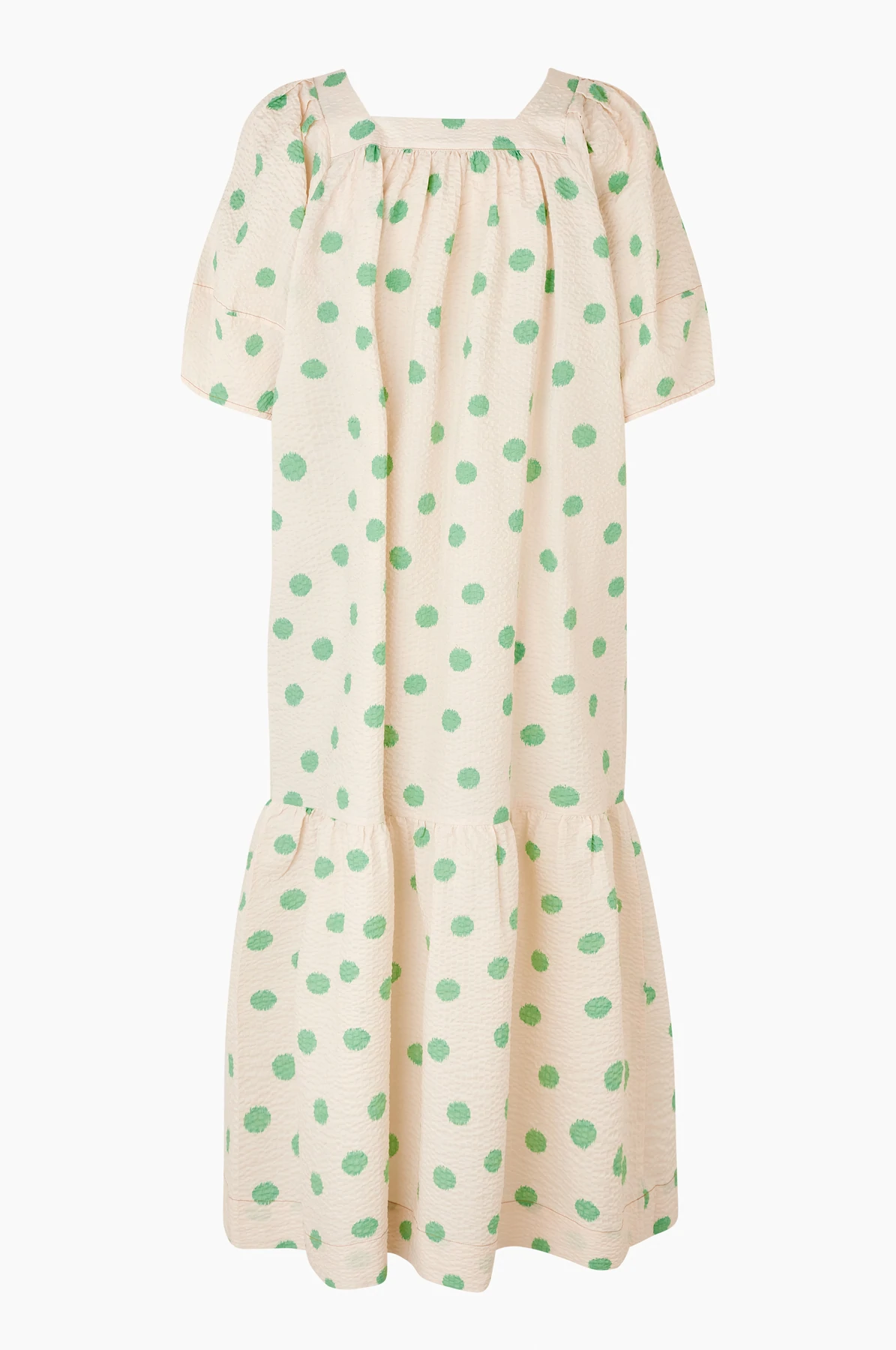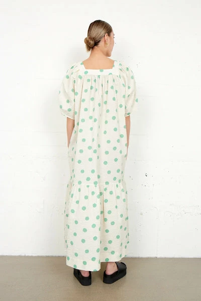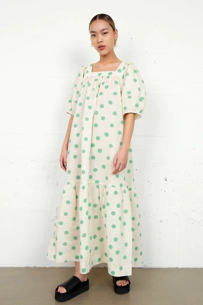 Second Female maxi dress made in a seersucker, 100% cotton quality. The dress is an A-shape with a deep hem, voluminous sleeves with square neckline. The fabric features gorgeous green irregular dots.