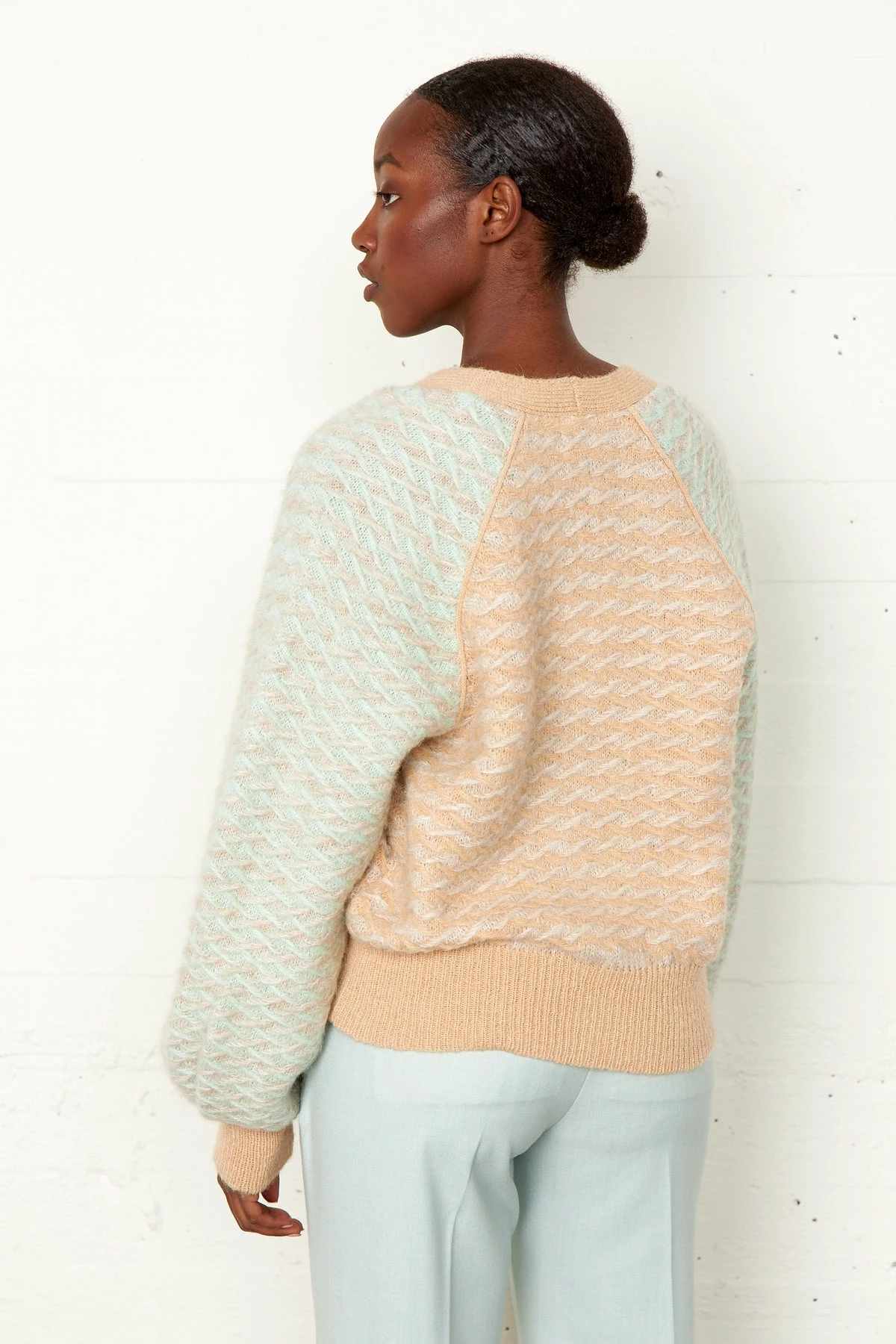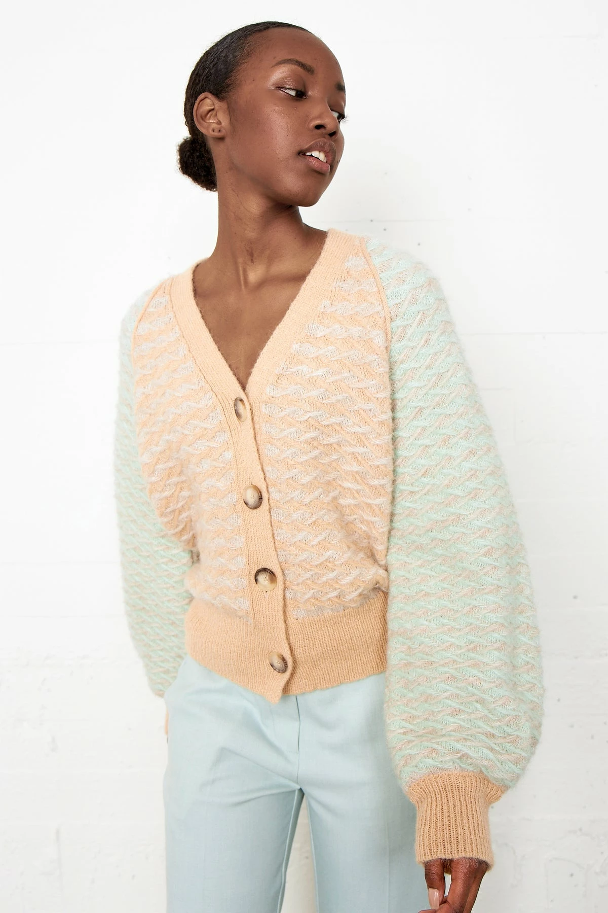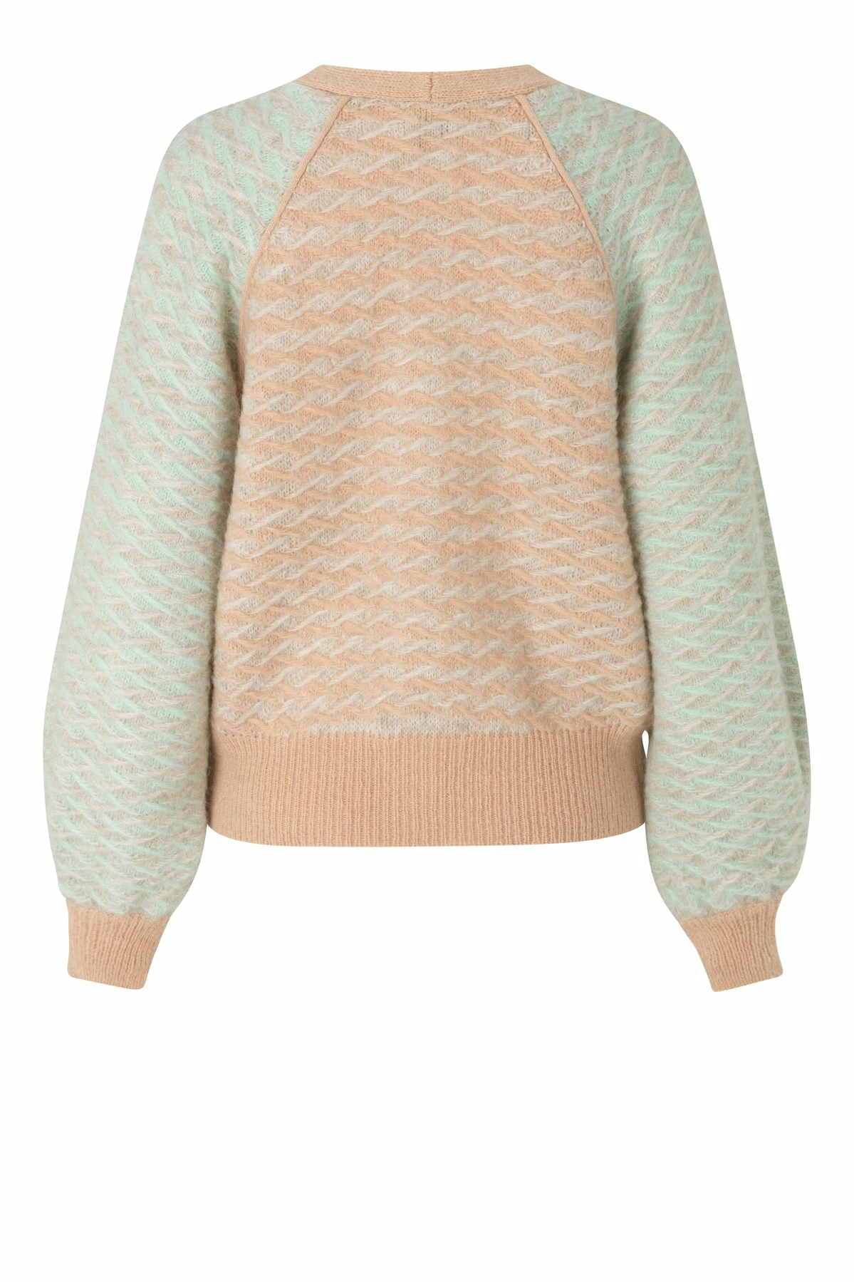 Second Female knitted cardigan with a straight fit. The knit has big, voluminous raglan sleeves and ribbed sleeve openings, as well as rib by the neck and in the bottom of the body. The sweater has a beautiful pattern in multiple colors on the body and sleeves.