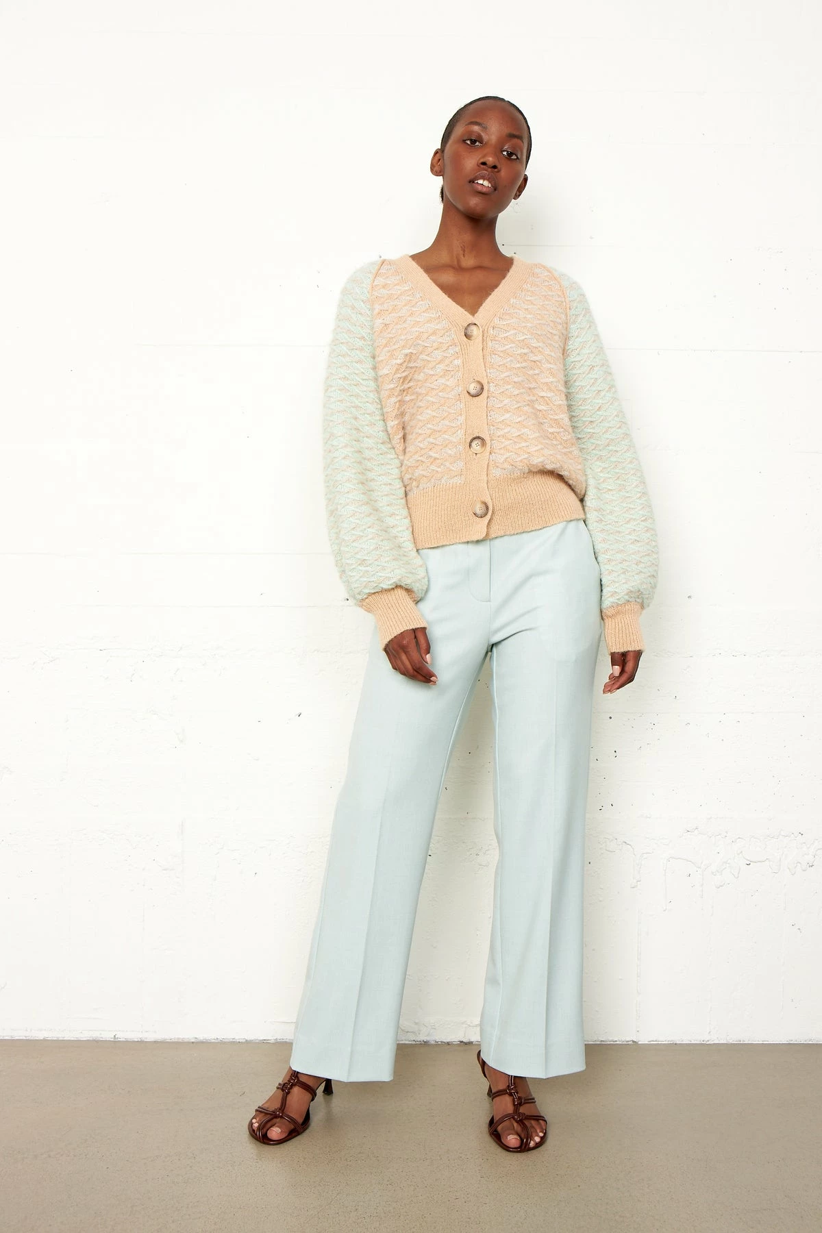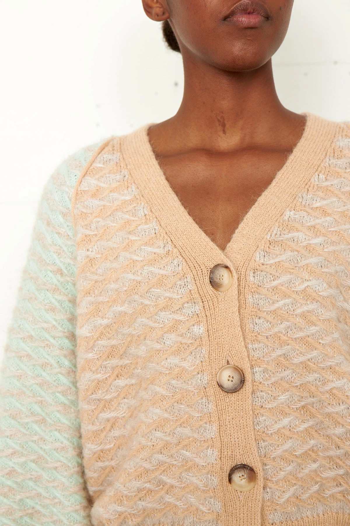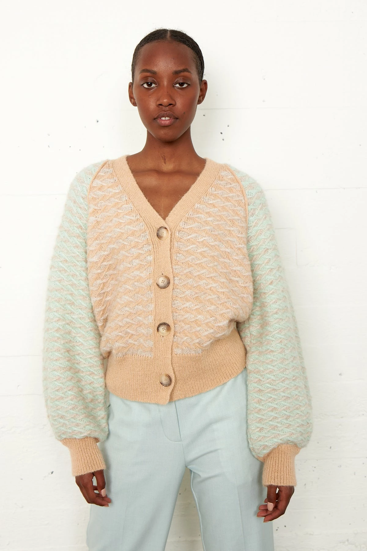 Second Female knitted cardigan with a straight fit. The knit has big, voluminous raglan sleeves and ribbed sleeve openings, as well as rib by the neck and in the bottom of the body. The sweater has a beautiful pattern in multiple colors on the body and sleeves.
