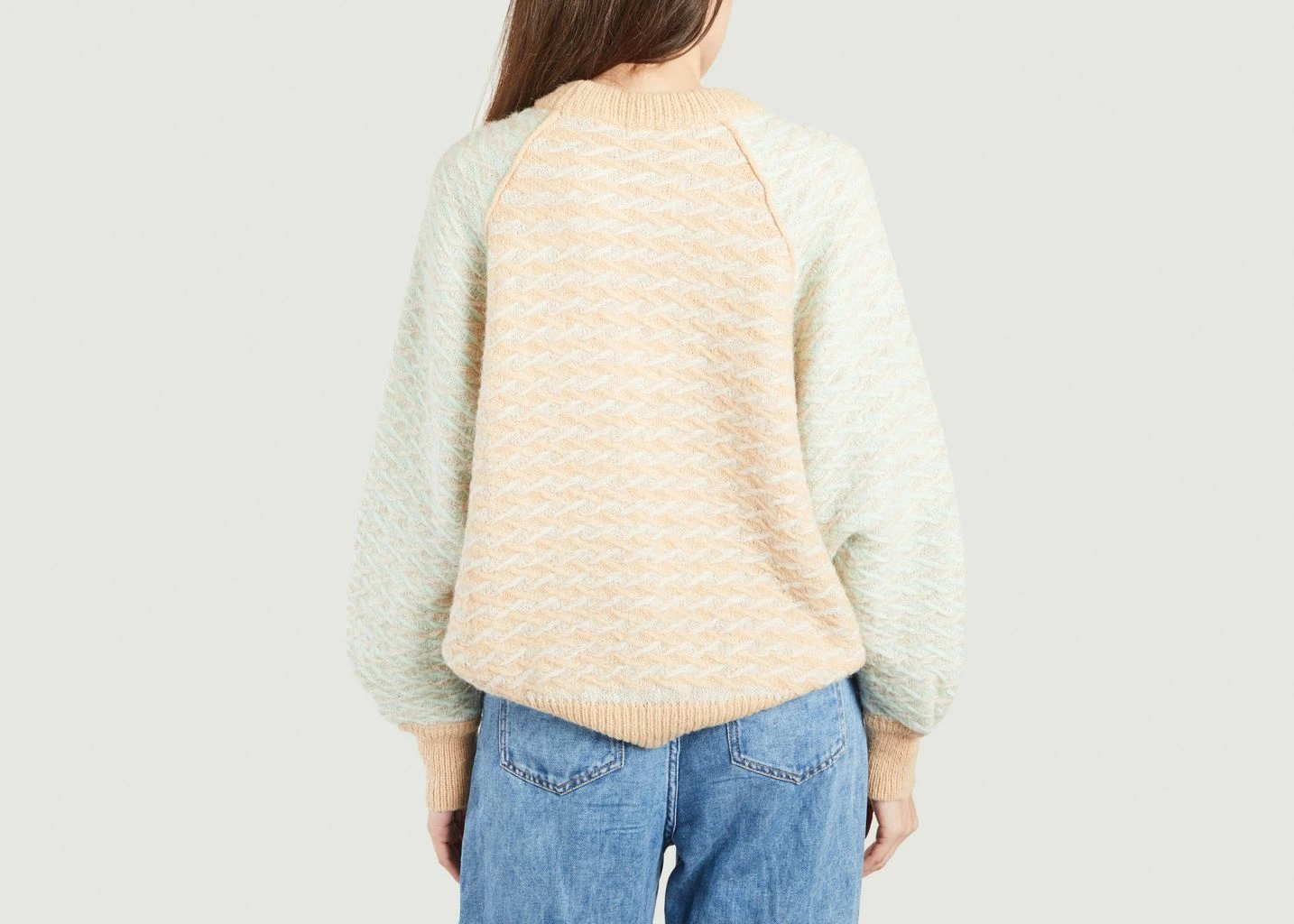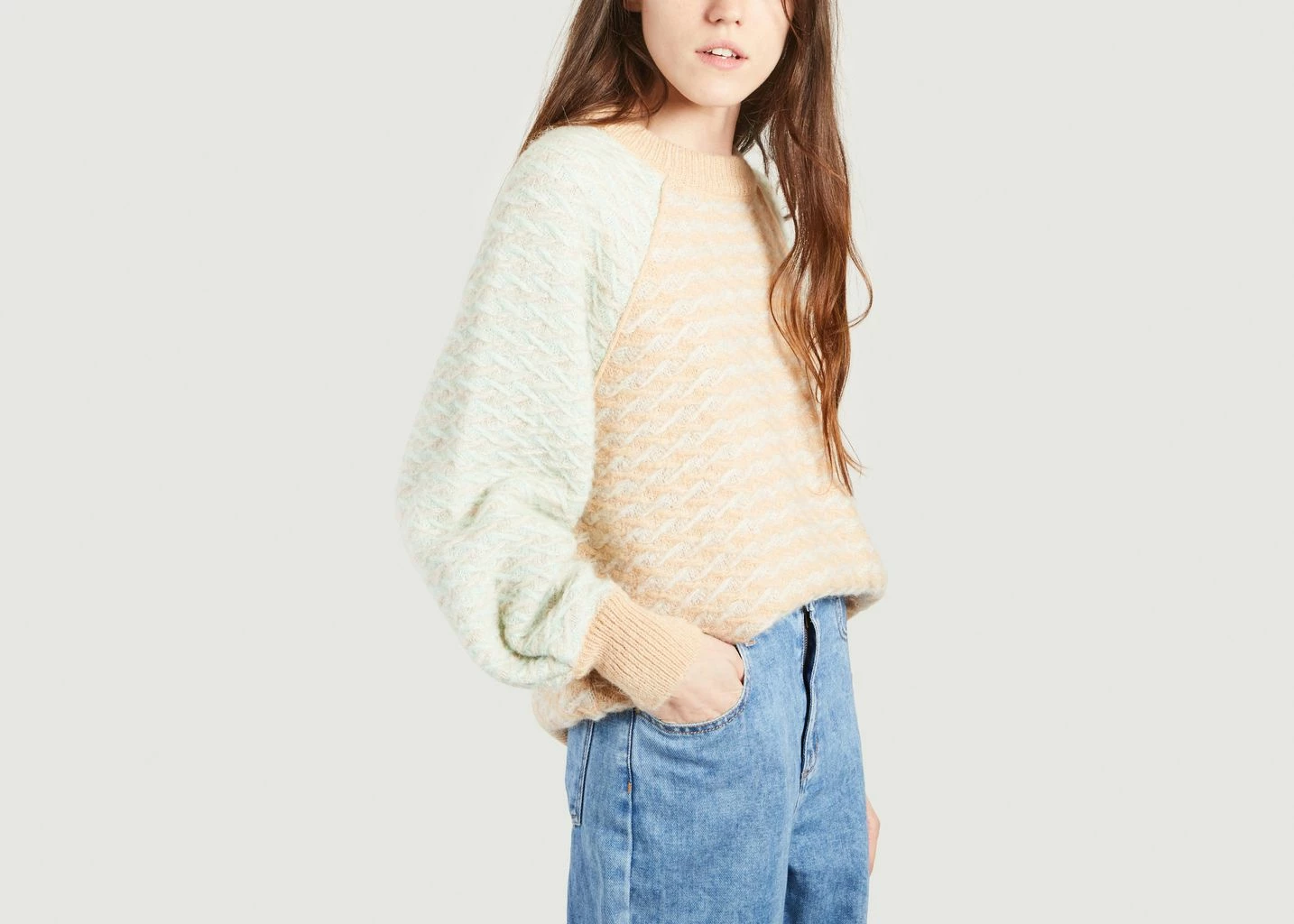 Acrylic, alpaca and polyamide sweater in apricot/pale green, geometric pattern, loose fit, voluminous long raglan sleeves, round neck, ribbed trim. Fall for the Gudrune sweater by Second Female! We like its duo of pastel colors which will bring softness to your casual looks, and its modern cut. This model will be easily worn during the day, especially with your jeans.