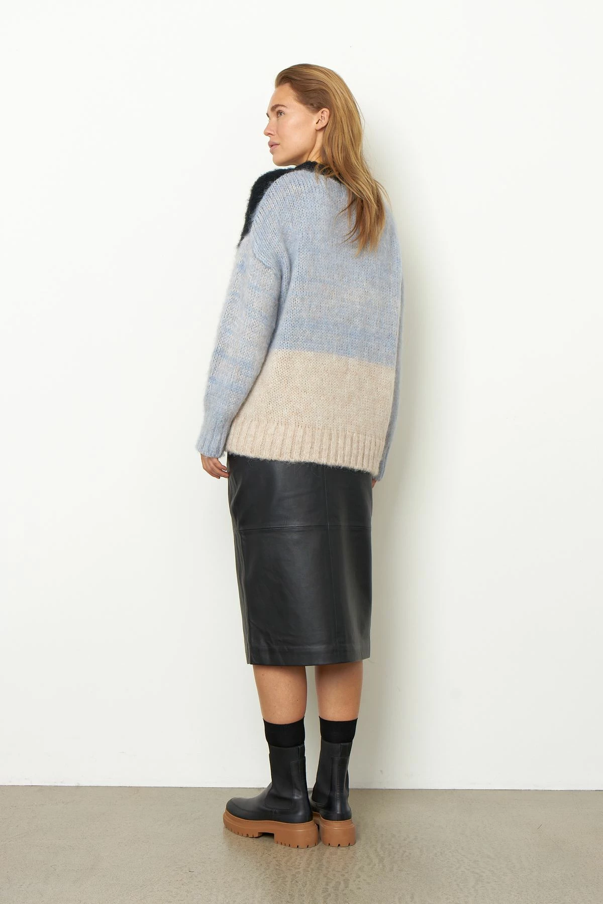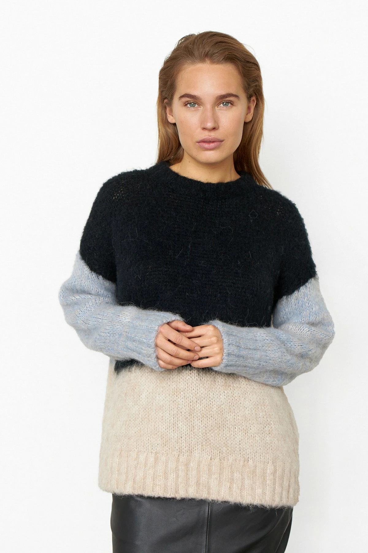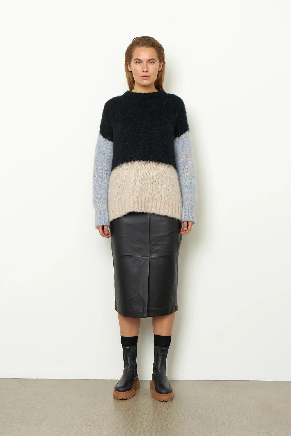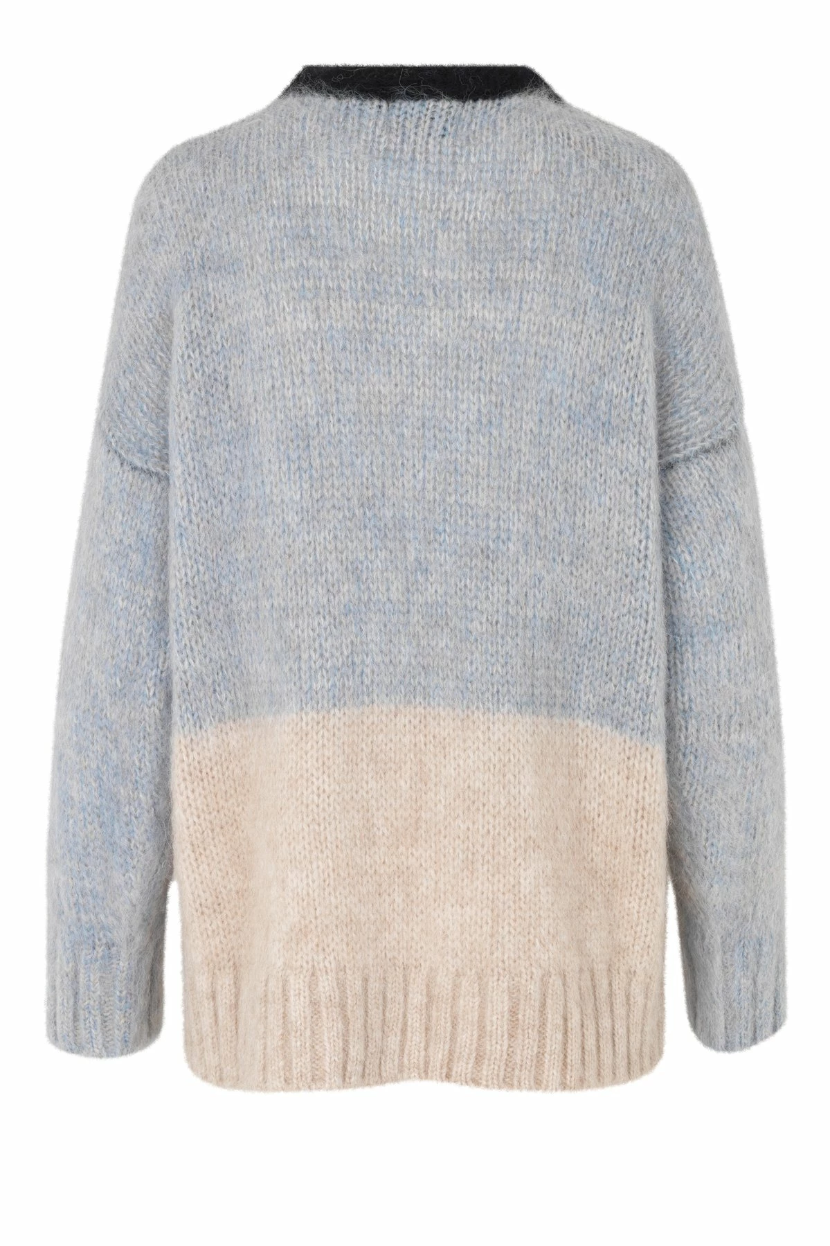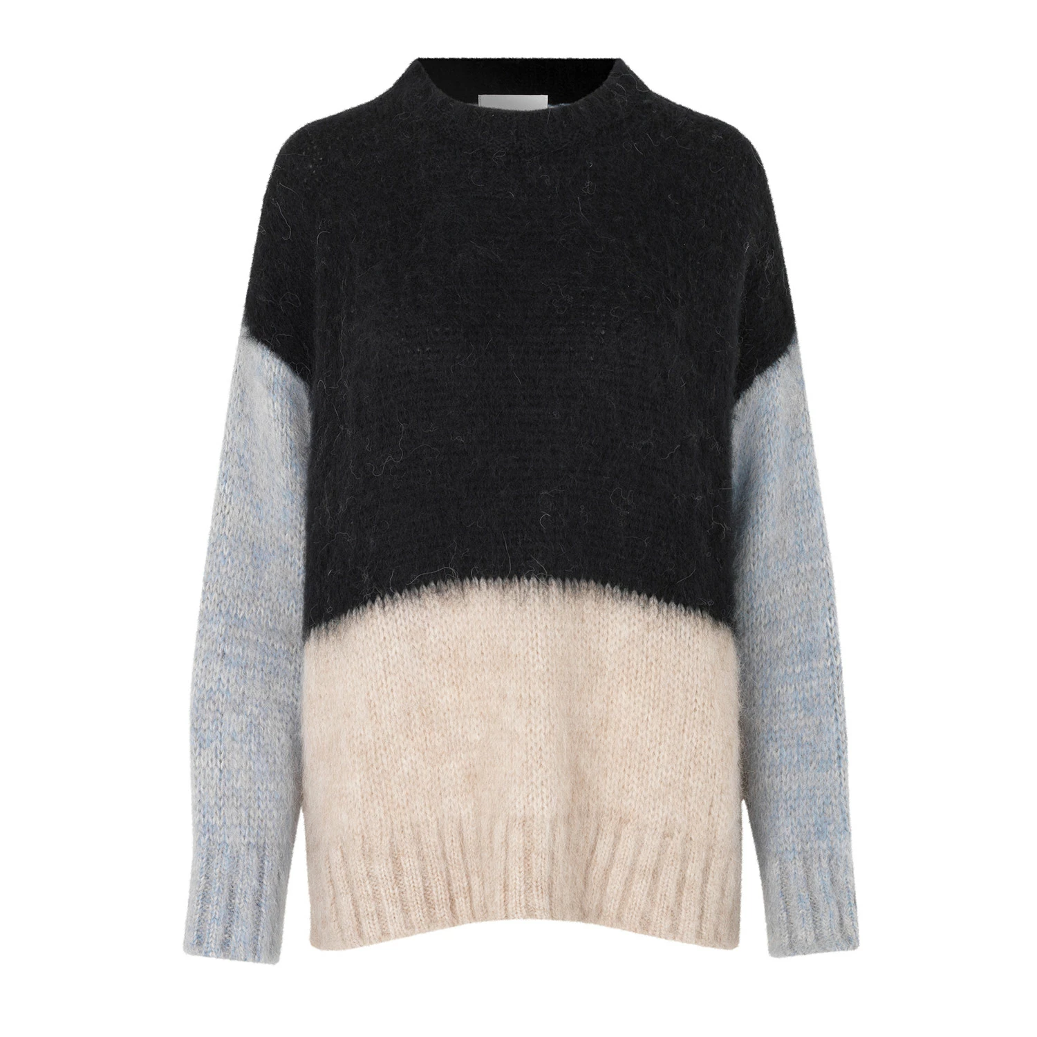 Second Female Gwennola knit made in a soft, alpaca mix quality. The knit has ribbing along the rounded neckline, cuffs and hemline. It has dropped shoulders and fine color blocking.