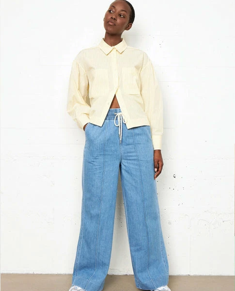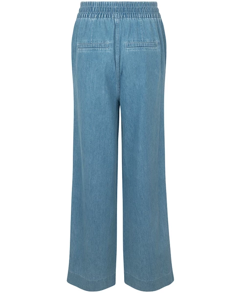 Second Female Ingrid Denim Trousers, wide leg flared trouser with elasticated waist and drawstring detail. Complete with pockets in the sides and decorative folds going all the way down the leg. Fake Pockets to back Trousers with wide legs Elstic waistband with drawstrings Pockets in the sides Decorative folds on the leg 100% Cotton Machine wash at 30 XS – UK8, S – UK10, M – UK12, L – UK14 Size down if between sizes as Second Female sizes generously