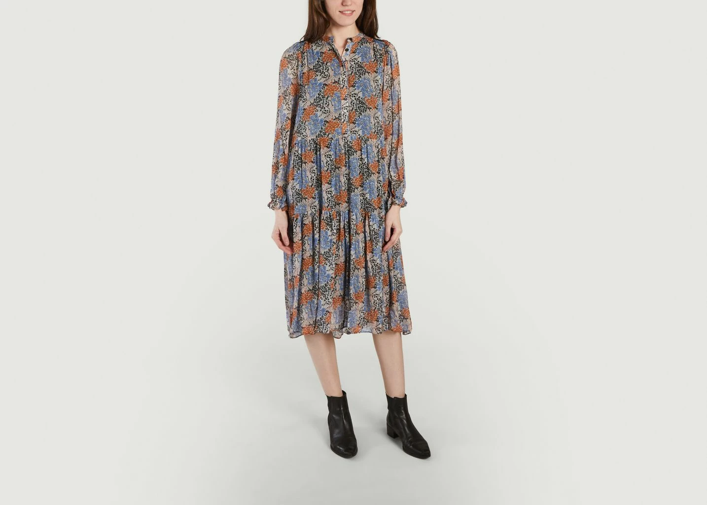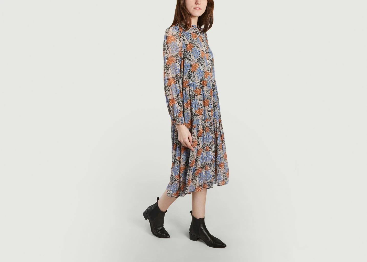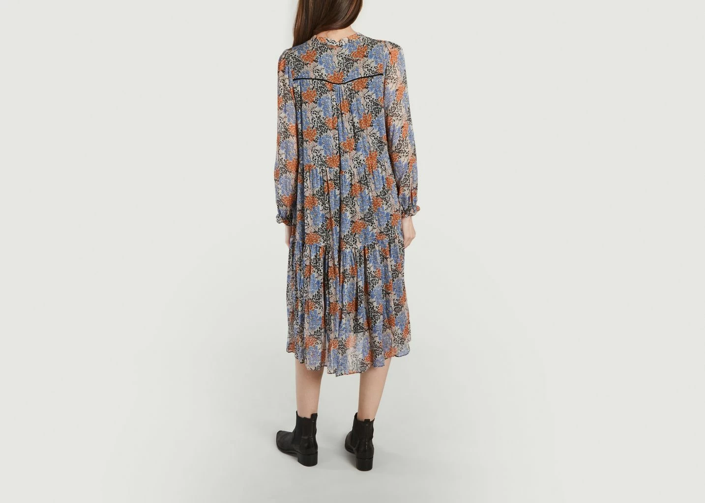 Long dress made of viscose, multicolored. It has an officer’s collar, long puffed sleeves with elasticated cuffs and a buttoned placket at the front. It flaunts a straight fit and flowing fabric that is elasticated at the waist and under the hips forming a slight ruffle. Fall in love with this pretty Itea dress in an elegant color and floral print. It is a timeless piece that will enhance a chic feminine outfit. It can easily be worn with closed or open shoes and a tailored jacket for an assured bohemian chic style!
