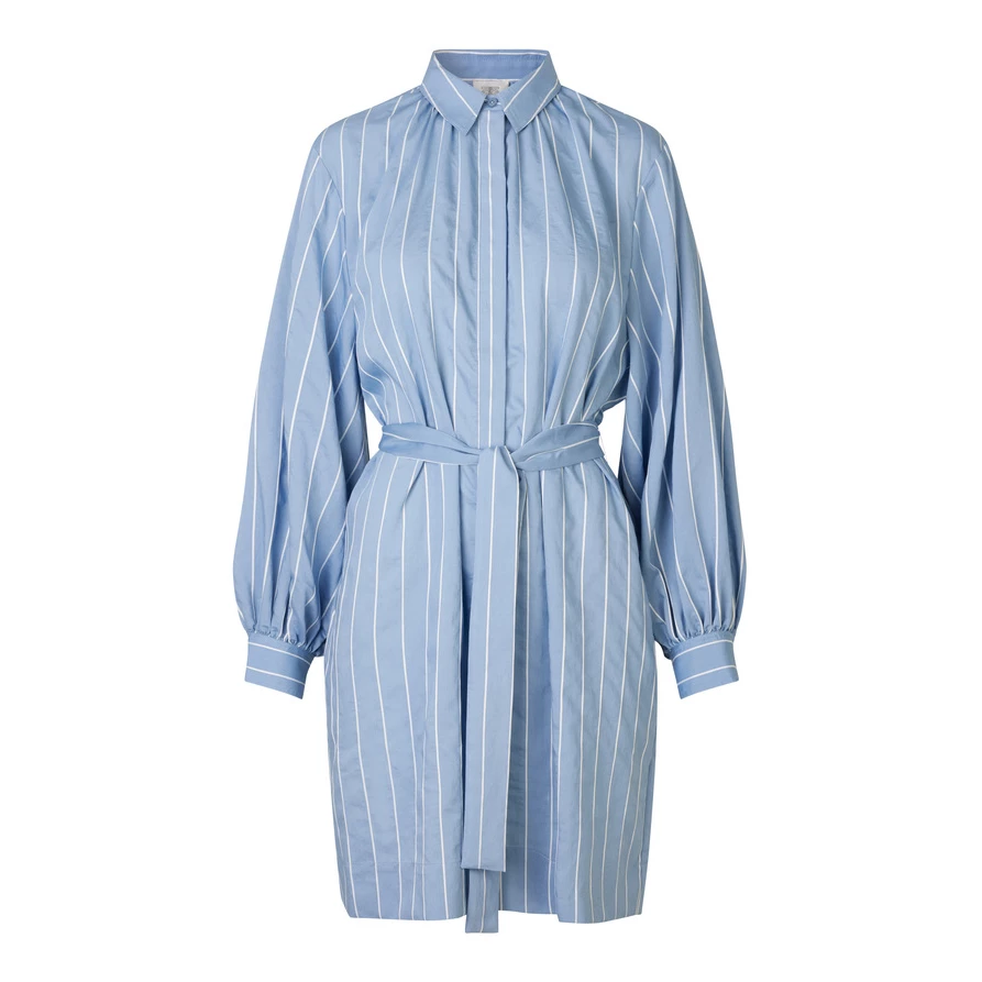 Jacinth Dress is a viscose blend dress with vertical stripes, pleats, collar and button placket. A tie around the waist allows waist definition.