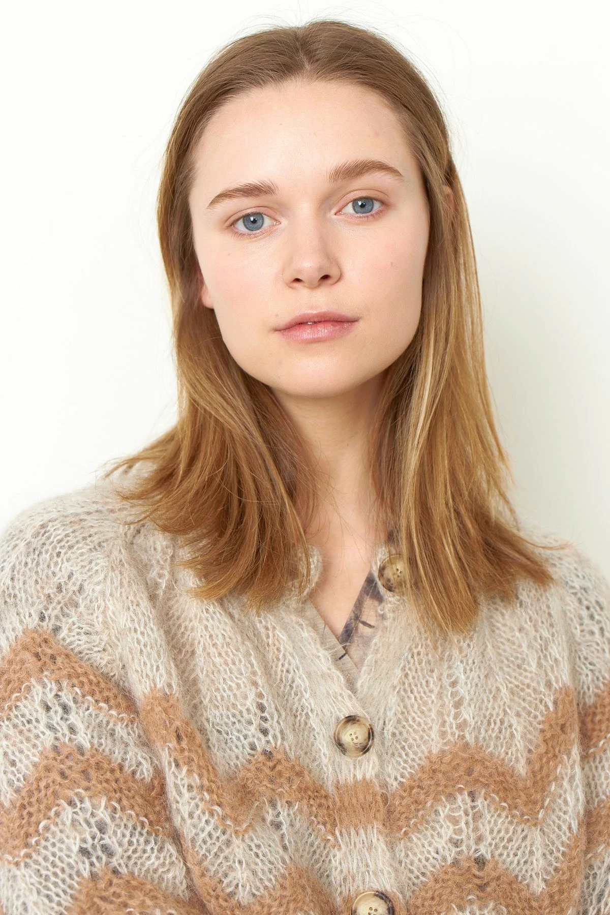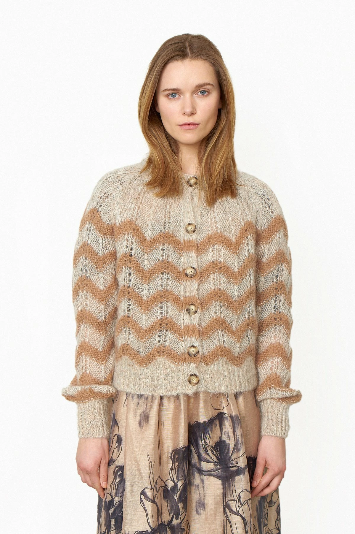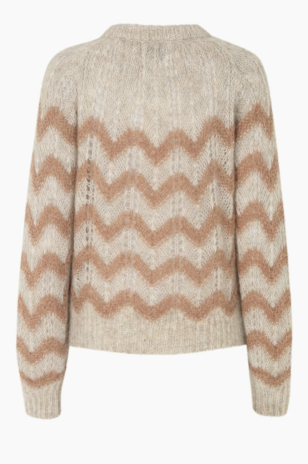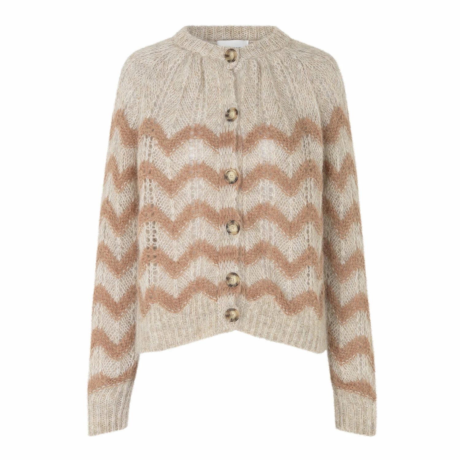Second Female Juliette Knit Cardigan made in a soft, wool and alpaca mix quality. The cardigan has ribbing along the rounded neckline, hemline and cuffs. It has button through front opening and voluminous raglan sleeves. The cardigan has zigzag pattern.