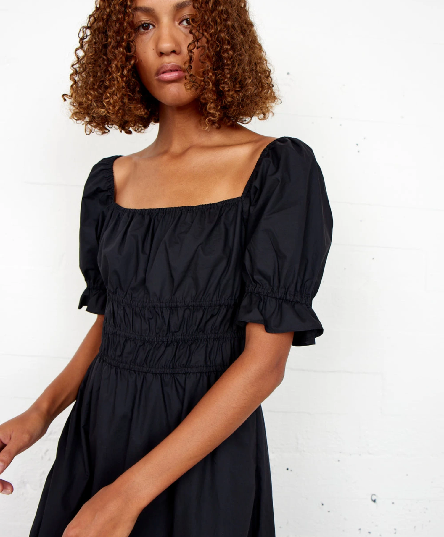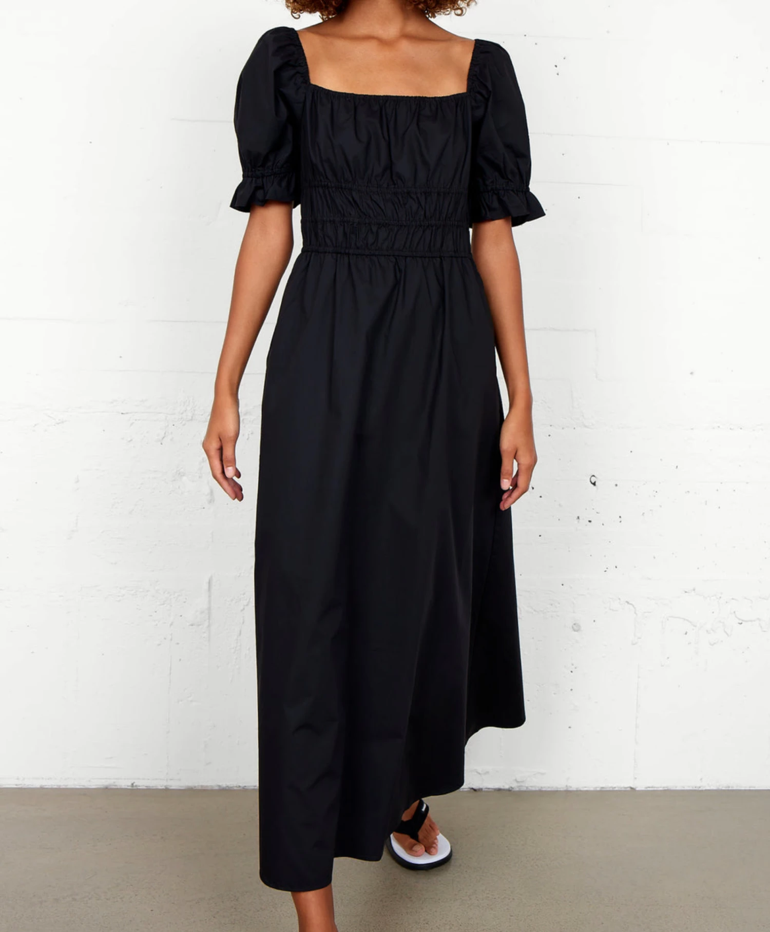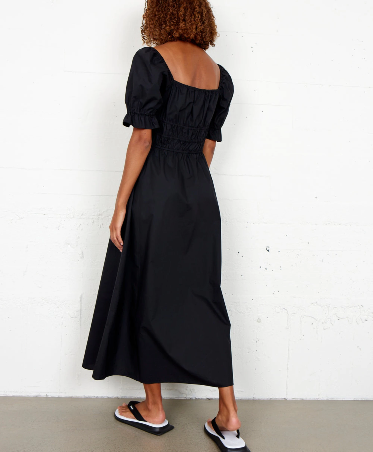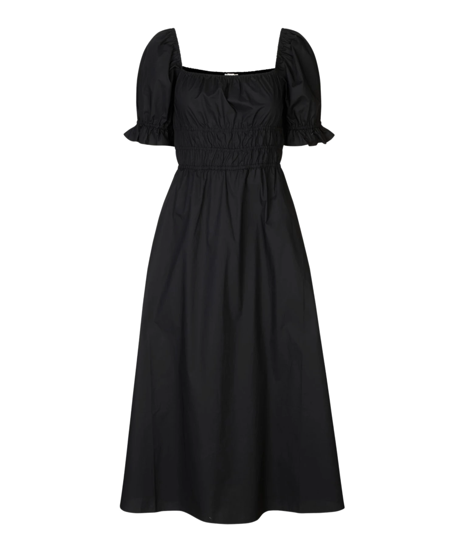 Second Female mid-calf dress. Made in light and crisp organic cotton. Featuring a square neckline at the front and back with elasticated edges and puffed sleeves with elasticated ends. Elasticated detail around waist that creates a ruched, fitted effect to define the silhouette. Sustainable choice Square neckline Elasticated waist for feminine fit