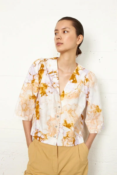 Second Female Shirt mit kurzer, kastig geschnittener Passform. Das Shirt hat einen V-Ausschnitt mit Knopfverschluss auf der Vorderseite und kurze, voluminöse Ärmel mit Raffungen an den Schultern. Das Shirt besteht zu 100 % aus Bio-Baumwolle. Material: 100% Bio-Baumwolle Pflegehinweis: Feinwäsche