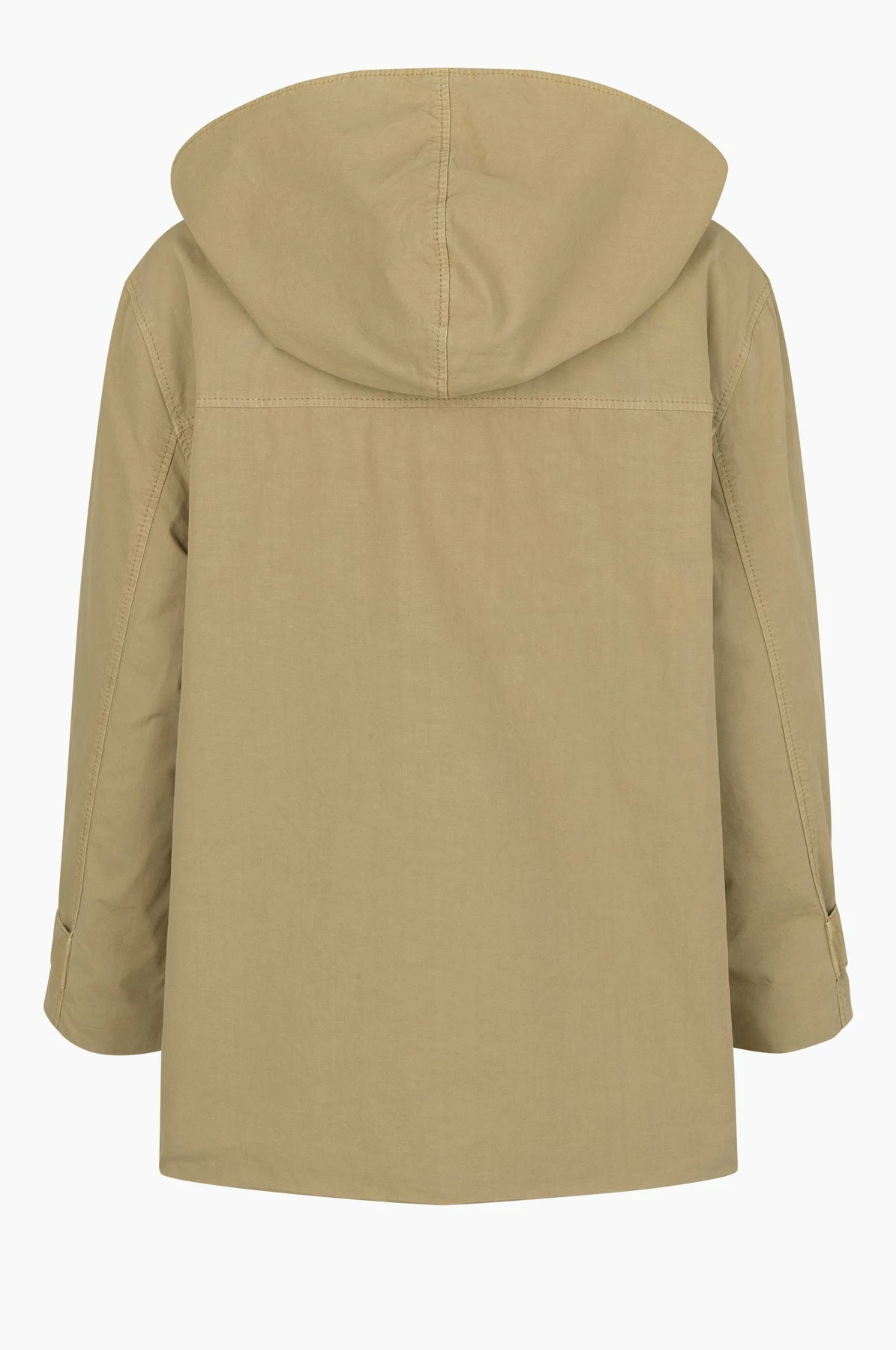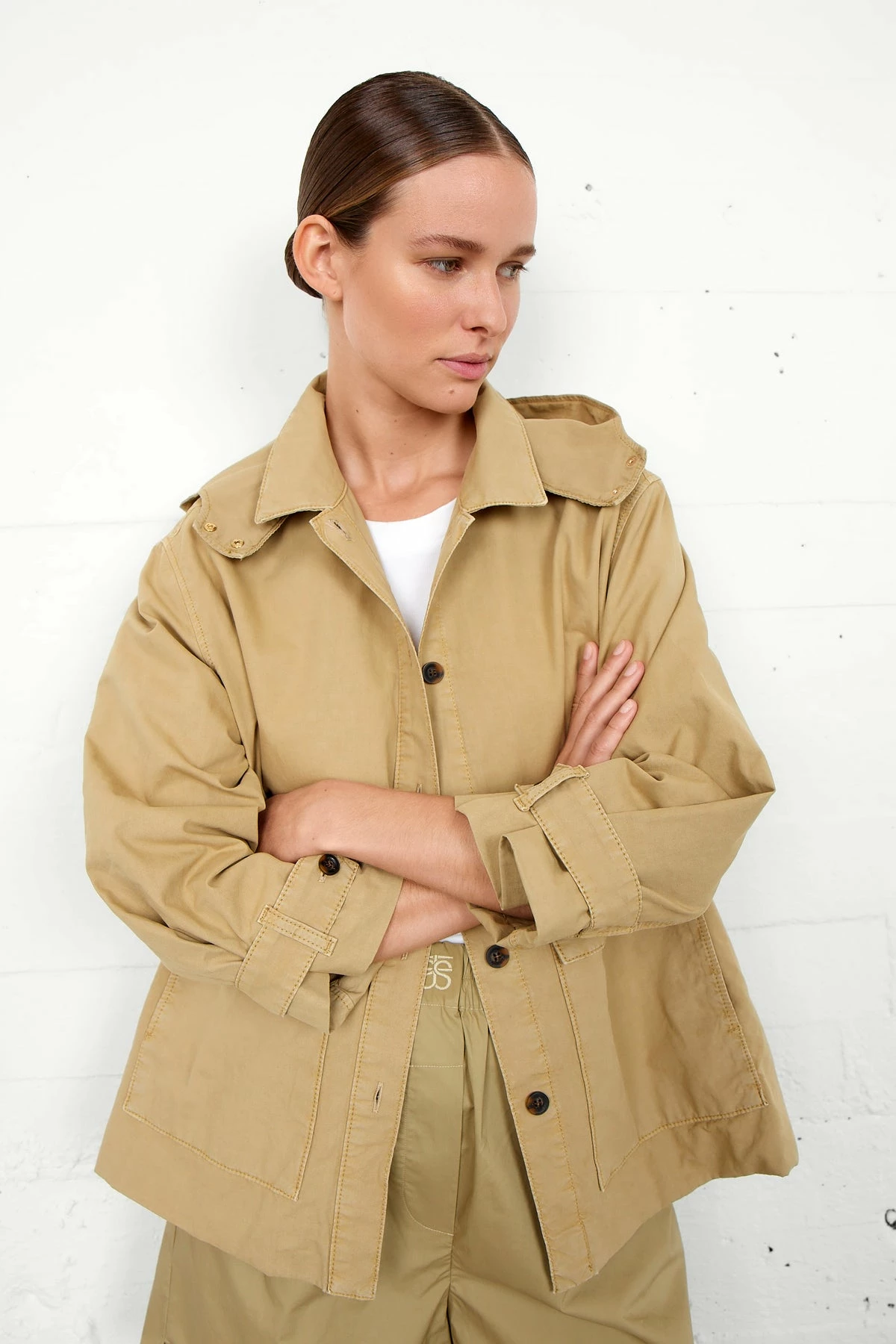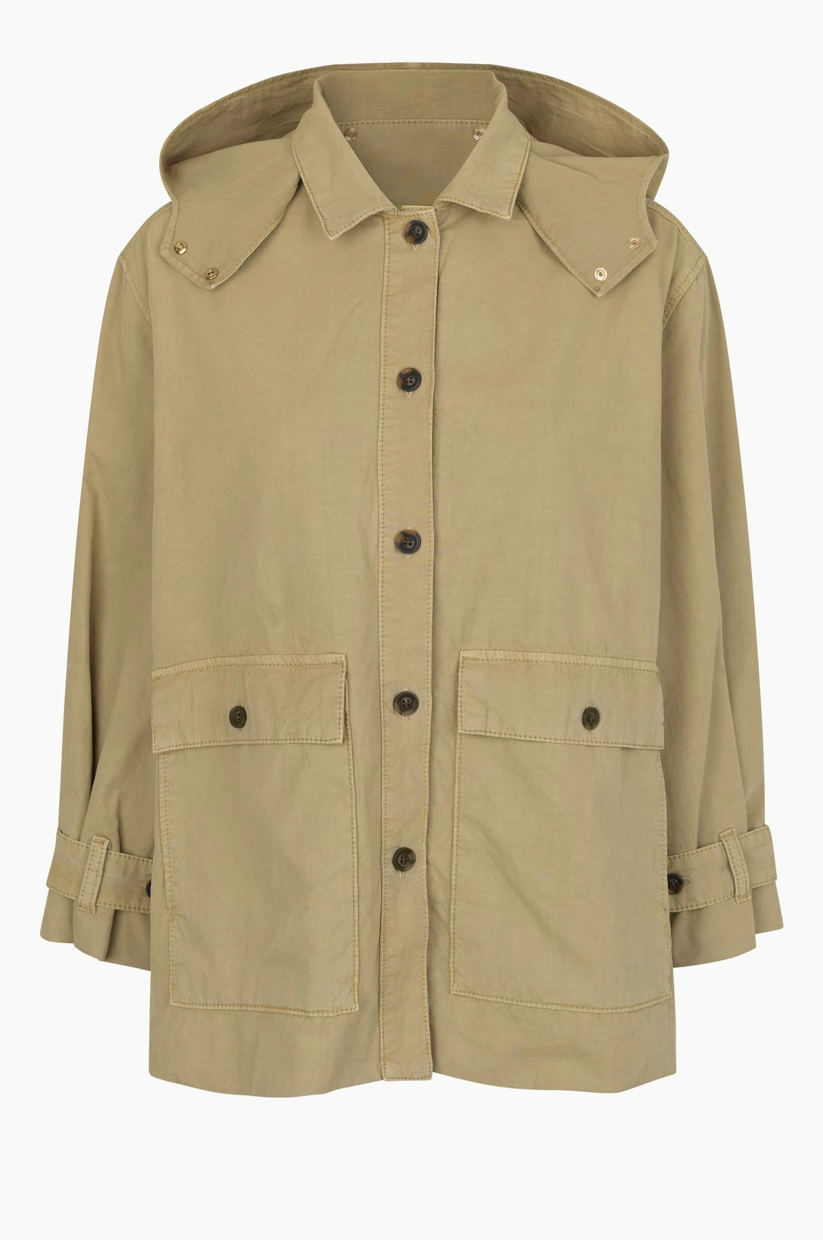 Second Female everyday jacket with hood. Made in light and crisp cotton with tonal stitching. Featuring a button-through fastening and two large flap pockets with button fastening. Loose sleeves with cuffs with straps and button fastening. Detachable hood. Loose, relaxed fit with plenty of room to move. Fully lined.
